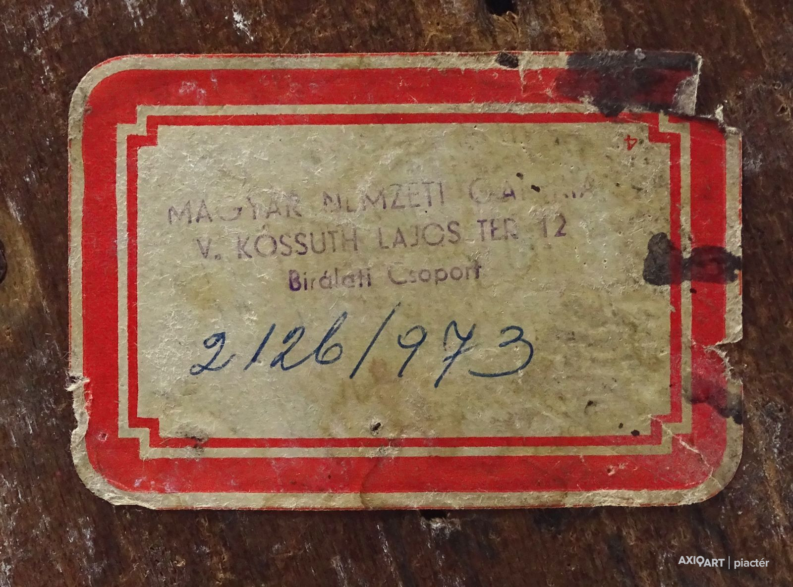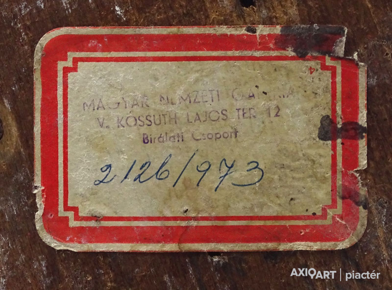 [1Y034/Z018] Olaj vászon festmény, üveglap mögött, szép állapotú képcsarnokos keretben. Akasztási lehetőséggel rendelkezik. Jelezve jobbra lent: Balog A. Hátoldalán a kereten Képcsarnok Vállalat címke töredék látható, rajta felirat: A művészeti alkotás címe: LEÁNY Magasság: 86 cm Szélesség: 66 cm Súly: 5.37 kg Balogh András (képei szignóján az 1960-as évektől Balog) (Budapest, 1919. március 14. — Budapest, 1992. március 18.) festőművész, kerttervező, művészeti szakíró, c. egyetemi tanár. Életpályája és munkássága Apai ágon a géresi Baloghok Szatmár megyéből a dél-erdélyi Alsó-Fehér megyébe származtak, anyai fölmenői a Székelyföldön: Csíkban, ill. Háromszéken éltek. Szülei az 1900-as évek elején költöztek Budapestre. A Képzőművészeti Főiskolán 1937-ben kezdte meg tanulmányait Burghardt Rezső tanítványaként. 1950-töl 1980-ig a Kertészeti Főiskolán (később Kertészeti Egyetem) tanított a kerttervezési tanszéken művészettörténetet, szabadkézi rajzot, ábrázoló geometriát és kertesztétikát. Az Iparművészeti Főiskolán óraadóként kertesztétikát adott elő. 1971-ben részt vett a firenzei Palazzo Strozziban rendezett biennálén, ahol aranyéremmel tüntették ki. Rendszeres önálló és csoportos kiállítások sora következett ezután nemcsak Magyarországon, hanem Olaszország és Németország számtalan városában, kiállított Finnországban, Kanadában is. Egyéni kiállításai gyakran katalógusokkal jelentek meg.[1][2][3] Nyaranként Tihanyban vagy Zsennyén alkotott. Festészetét poétikus realizmus jellemzi, dekoratív elrendezésű kompozíciói és lágy színvilága bensőséges hangulatot, szépséget, harmóniát árasztanak. (Lány egyszarvúval; Alvó, Emberpár és táj, stb.) Nagyon sok tájképet és portrét festett, történelmi személyiségekről is, 1978 és 1989 közt megfestette Mindszenty József bíboros portréját. Képei a Magyar Nemzeti Galériában, vidéki múzeumainkban, olasz, német, finn, észak-amerikai, kanadai, ausztráliai gyűjteményekben vannak.