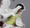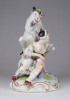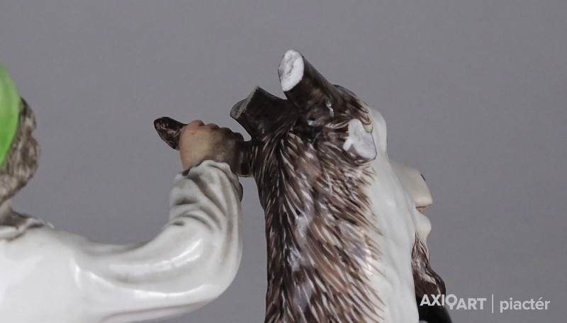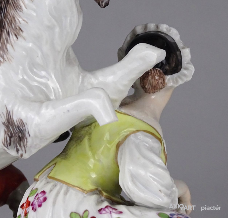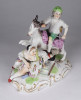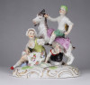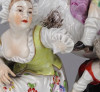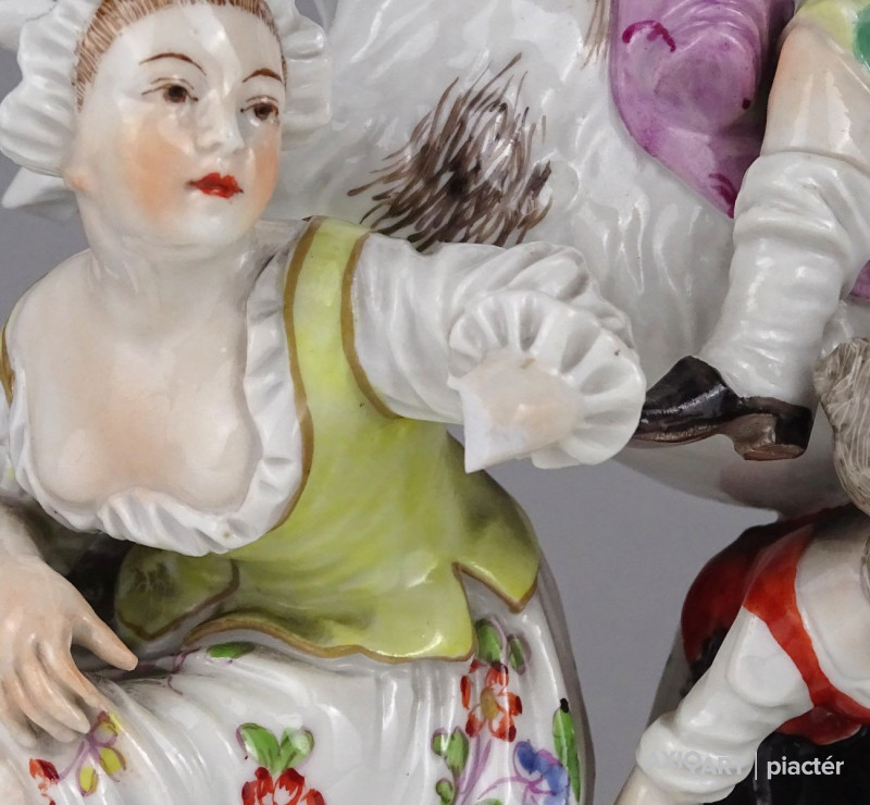 Antik, figurális, sokalakos porcelán szobor aranyozott barokk talapzaton meisseni stílusban a XIX. századból. Kézi festéssel díszített. A szobor sérült, lásd fotó.