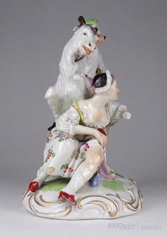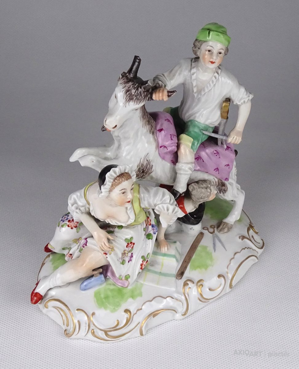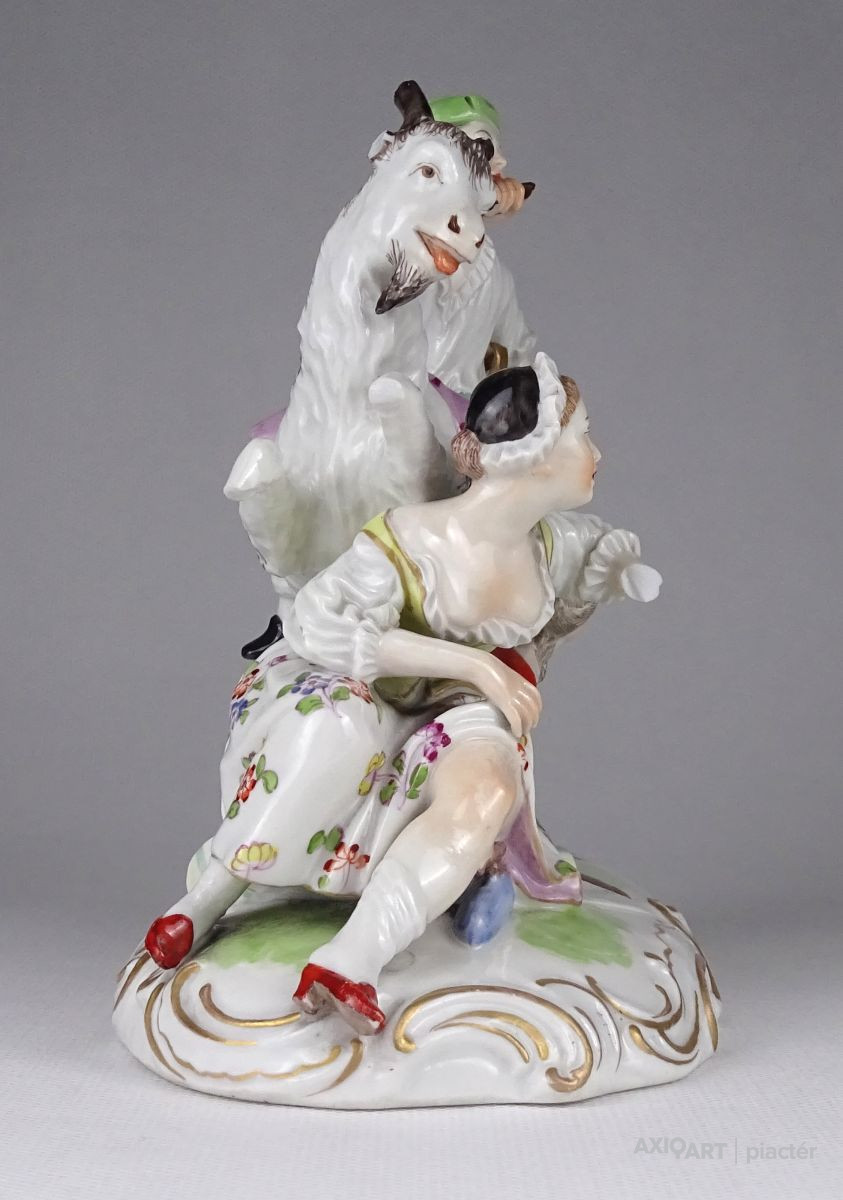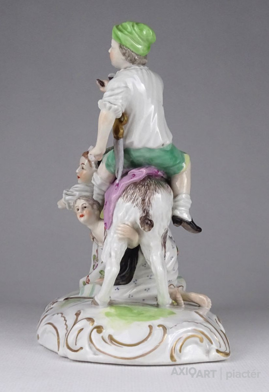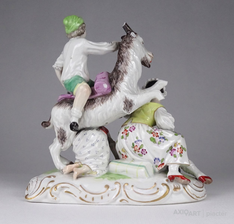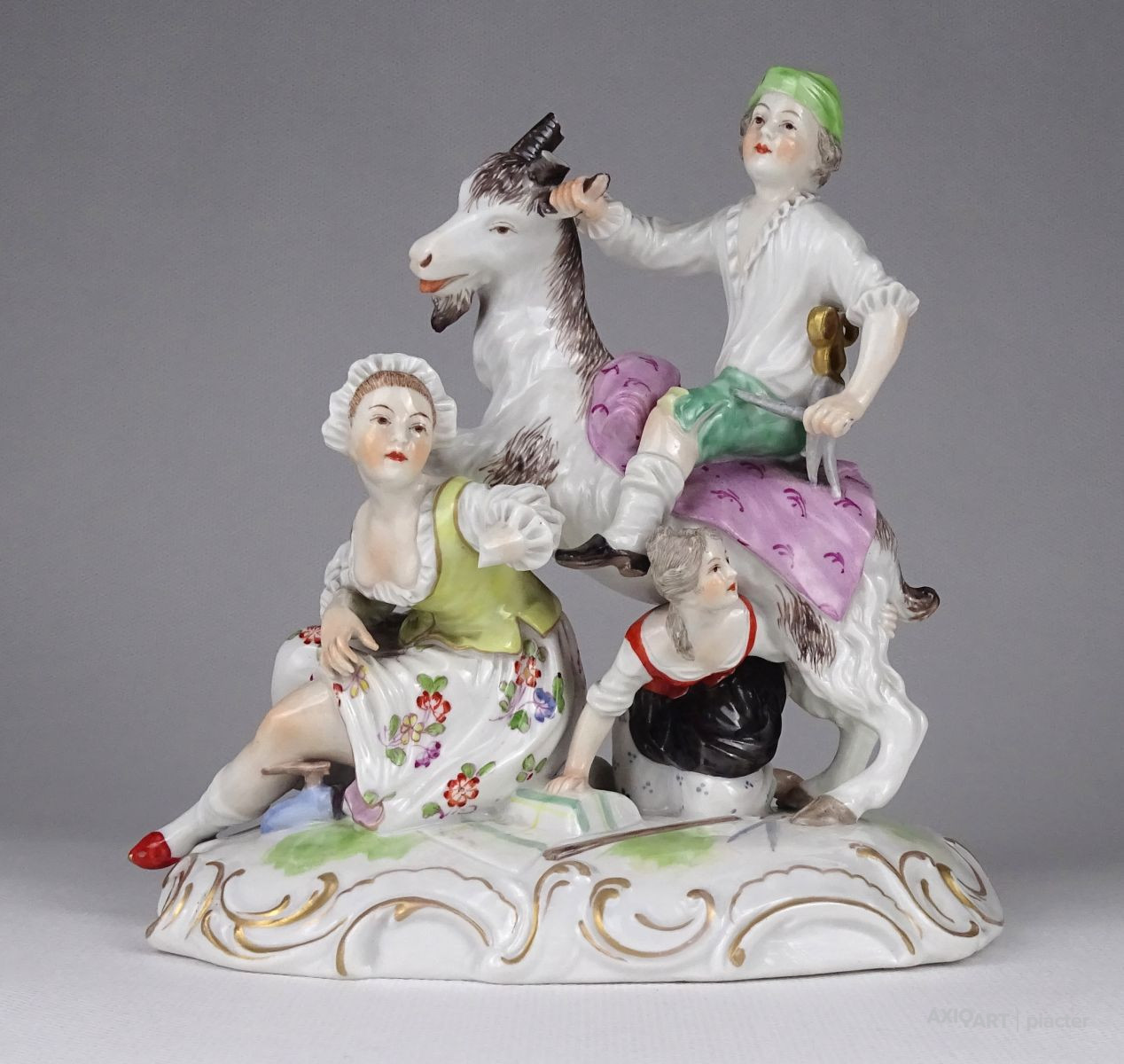 XIX. századi kecskés háromalakos porcelán figura talapzaton 15.5 cm