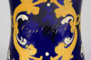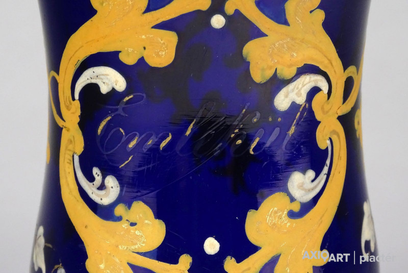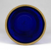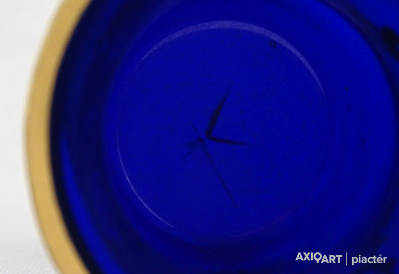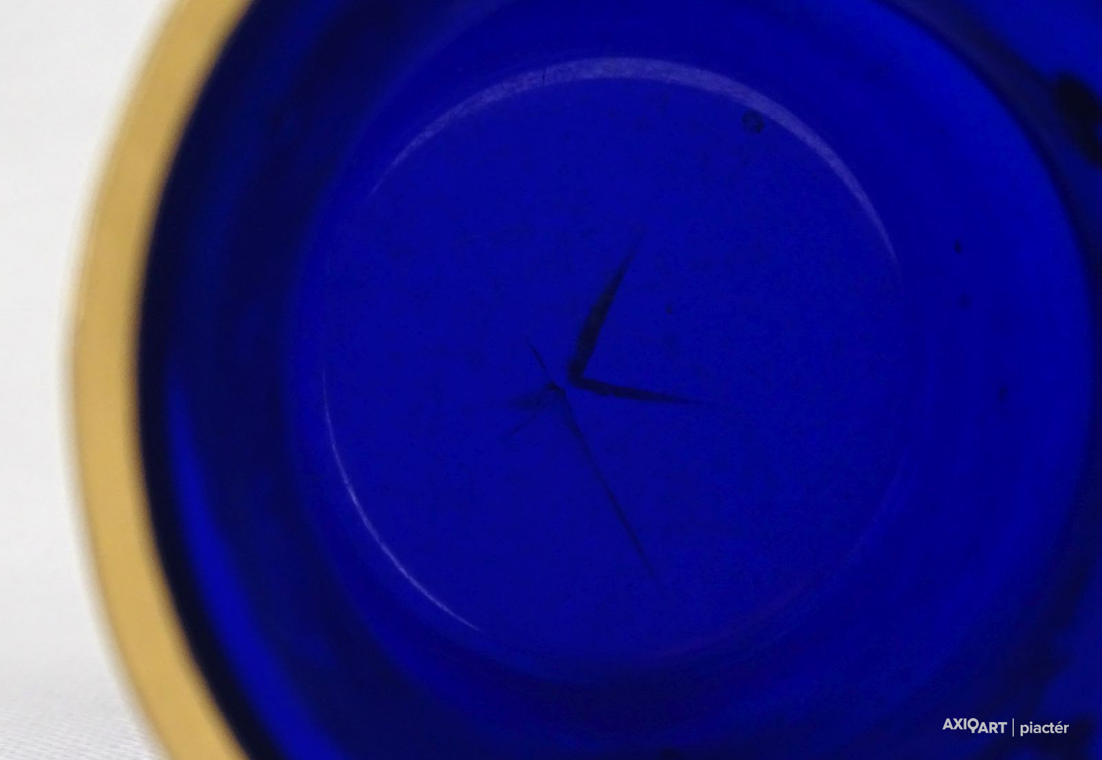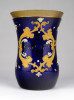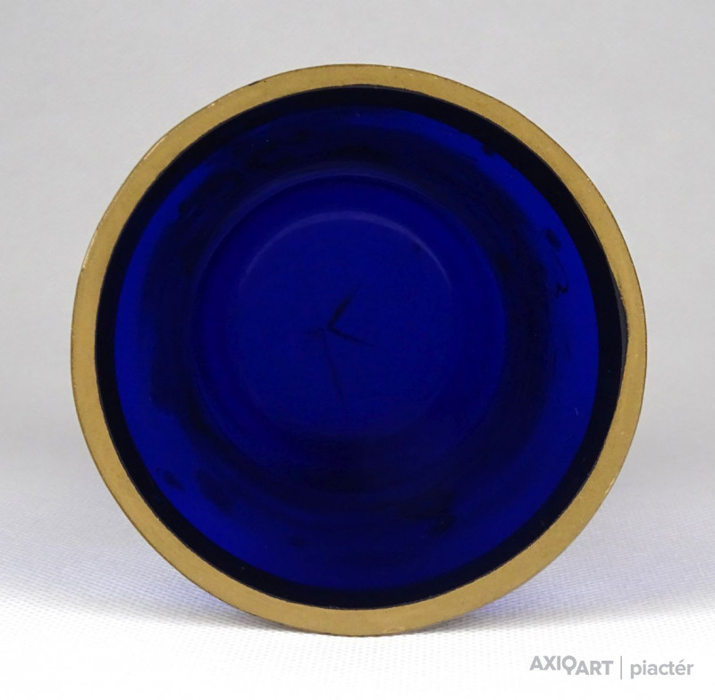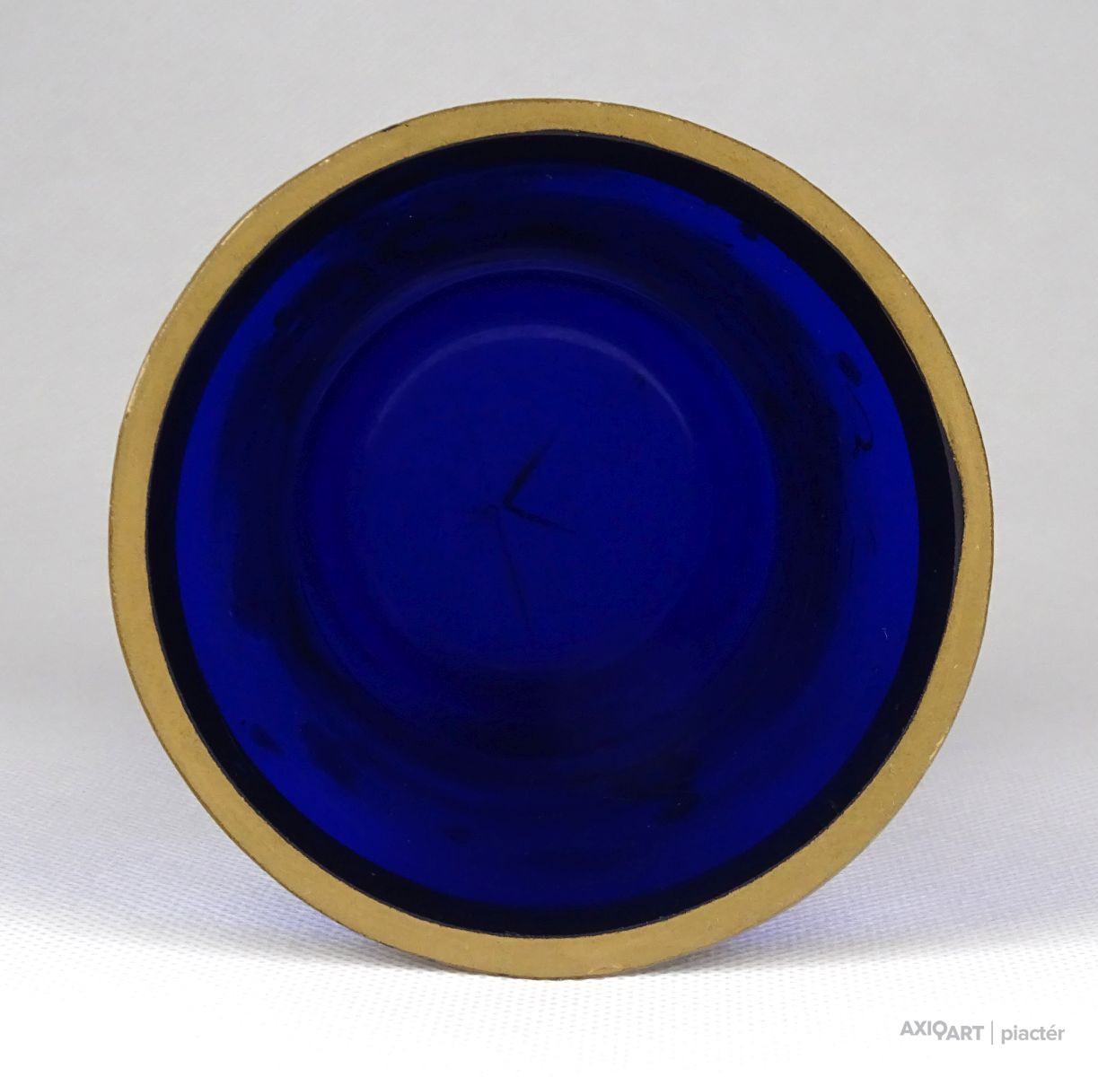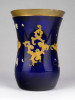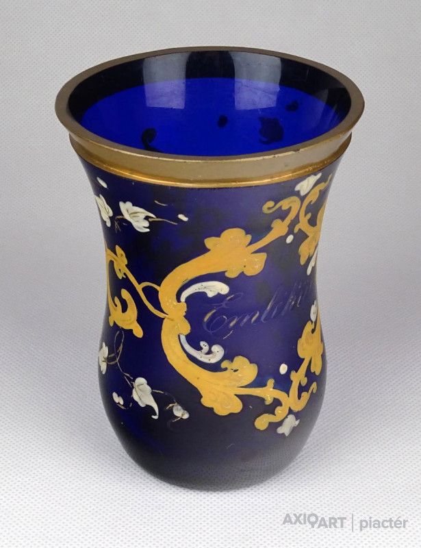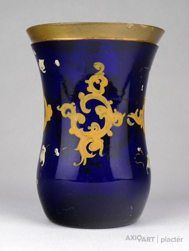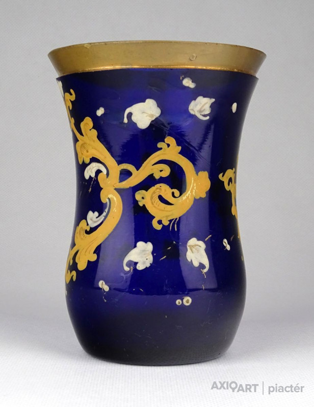 Antik, gyönyörű kobaltkék színű fújt üveg Biedermeier pohár, a XIX. századból. Oldalán kézzel festett, aranyozott díszítés látható.