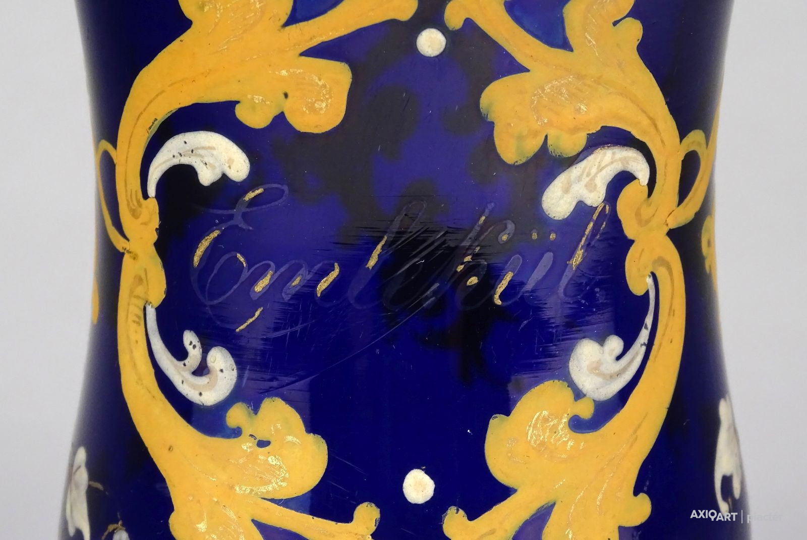 XIX. századi kézzel festett kobaltkék fújt üveg Biedermeier pohár 11.7 cm