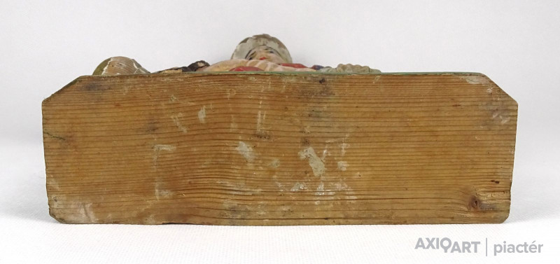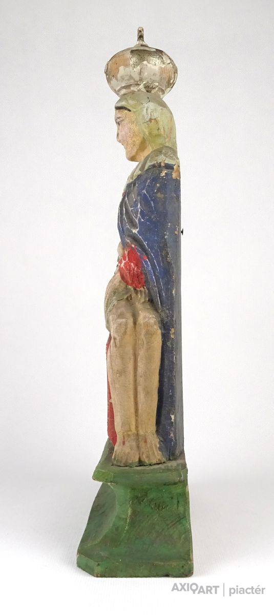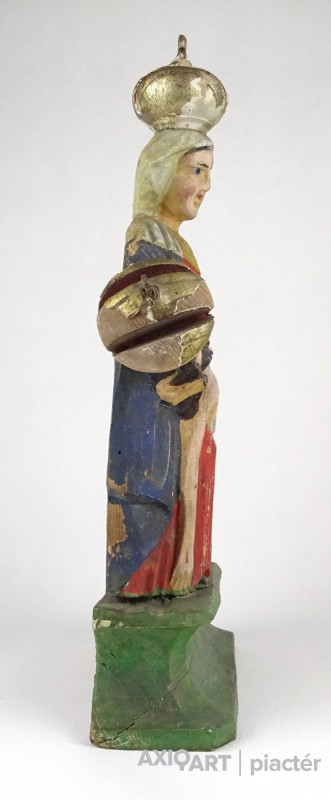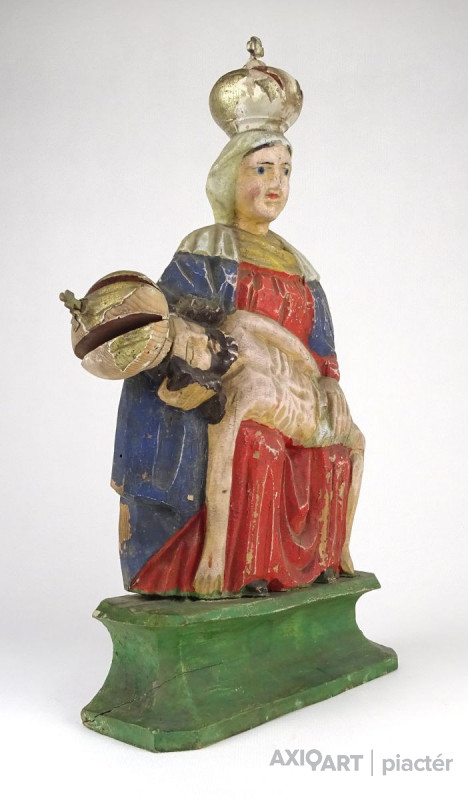 [1P663/X311] Antik, patinás állapotban lévő talapzaton álló sirató Mária szobor, ölében halott Jézus. Faragott, festett antik szobor, fafaragás. Magasság: 35 cm Szélesség: 22 cm Súly: 0.84 kg