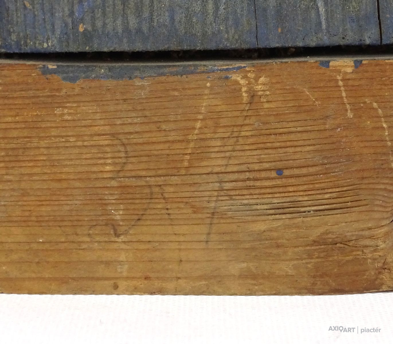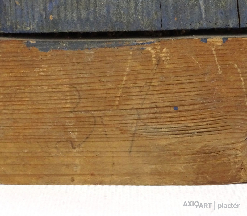 [1Y029/Z018] Olaj farost festmény, üveglap mögött, hibátlan képcsarnokos keretben. Hátoldalán Képcsarnok Vállalat papír címkéje: A művész neve: SCHÉNER MIHÁLY A kép címe: TÁJ Magasság: 66.5 cm Szélesség: 86 cm Súly: 6.54 kg Schéner Mihály festő, grafikus, szobrász, keramikus, bábtervező Medgyesegyháza, 1923-01-9 Elhalálozott: Budapest, 2009. május 11. Honlap: http://www.kormendigaleria.hu/kiadvany.html 1942-1947: Magyar Képzőművészeti Főiskola, tanára: Rudnay Gyula. 1978: Munkácsy-díj; 1984: érdemes művész; 1989: kiváló művész; 1995: Kossuth-díj. 1992-től a Magyar Művészeti Akadémia, 1993-tól a Széchenyi Irodalmi és Művészeti Akadémia tagja. 1956-ig tanított. 1982: Nagyatádi Faszobrász Alkotótelep, 1985: Nemzetközi Acélszobrász Alkotótelep, Dunaújváros. A stílusában felismerhető, mégis sokféle műtárgyat létrehozó ~ gazdag, állandóan alakuló életműve a folyton változó világban helyét kereső, az alkotói szabadságot megvalósító XX. századi képzőművész példázata lehetne. Magát expresszív-szürrealista alkotónak nevezi. Egyaránt dolgozik festékkel, textillel, fával, fémmel. Rajzol, szerkeszt, farag, épít, gyúr, varr és ragaszt, felhasználja a mézesbábok öntőformáit. Festő, rajzoló, textilszobor- és bábkészítő, fazekas, asztalos, esztergályos. Háromlépcsős folyamatban gondolkozik: rajzban tervez, majd fest, szobrot készít, “formába önt”, mindig a végső plasztikai megoldást keresi. Ami állandó és mégis játékosan változékony megjelenésű Schéner művészetében, az a gyermekkori emlékek által meghatározott népi mesterségek iránti tiszteletet kifejező motívumkincs, a tárgyi folklór formakészlete, amely már-már kézjegyként ismétlődik munkáin. Mitologikussá nőtt képzelete új lényeket teremt, pl: a Pigulát, amely disznótestű, emberfejű teremtmény. Schéner festményein a szürrealista motívumokat konstruktív szerkezetbe rendezi, a geometriát és az organikus természeti motívumokat egyaránt beépíti műveibe. A népi, népművészeti formakincsből merített lovas huszárok, betyárok, szegénylegények cifra szűr mentéje, piros csákója, fekete csizmája, az önálló életet élő zsinórdíszek és mézeskalács bábok, a kiskocsik a gyermekkori vásárok, búcsúk színes forgatagába vezet. A primér motívumokat aztán felváltják a vastagon felhordott felületbe karcolt jelek, vonalhálózatok, amelyek a játszó gyermek homokba rajzolt ábráit, a pásztorember fába vésett üzeneteit, az ősember barlang falába rótt mágikus jeleneteit idézik meg. A művész pillanatnyi érdeklődésének megfelelően a színek búvópatakként tűnnek el és jelennek meg ismét. A 60-as években leginkább a formákkal való játék érdekelte, a festmények felülete egyre gazdagodott: a táblaképek felületén applikációk jelentek meg, vagy lemállasztott rétegek hagyták maguk után hiányukat, motívumok nélküli ősformák, archetipikus képzetek bukkantak fel művészetében. A véletlenszerűnek látszó rétegekkel való játék azonban tudatos komponálás eredménye, amely később nyilvánvaló ritmusnak és formai szerkesztettségnek adja át a helyét, mint a Törvénytáblák c. sorozaton. A különböző művészi kifejezési formák egymásra termékenyítő hatással vannak, át- meg áthatják egymást. Textilszobrai, amelyekkel új műfajt teremtett, ugyanazzal az automatikus, expresszív-szürrealista módszerrel készülnek, mint festményei. A hagyományosan a népművészetben alkalmazott anyag, a filc lehetőséget ad a népi formakincs felelevenítésére, amely azonban a művész különös szürrealista átiratában jelenik meg. A szívekkel kivarrt, zsinórdíszes Posztókotlós c. művén mézesbábok lógnak, hátán huszárok lovagolnak. Egész sor textilből készült kéz-plasztikát alkot, amelyeket az ujjakra rávarrt díszekkel öltöztet, személyesít meg. A színes-különös világból aztán ~ újra puritán képi és formai rendbe juttatja el a nézőt, majd nemsokára tépett, gyűrt, vágott, csorgatott, repedezni hagyott szenvedélyesen vonagló képi felületeket hagy hátra. Schéner készített apró gyermekjátékokat, térstruktúra-tereket, mászókákat is. A magyar népi formák mellett szürreális játékaiban gyakran alkalmaz görög mitológiai alakokat, “elkentaurosodott” lovakat, Gorgó-fejeket, sellőket, hárpiákat, Pán-ábrázolásokat. Schéner nemcsak saját művészetéről publikál, hanem művésztársairól is számos írása jelenik meg, elsősorban az Új Auróra c. folyóiratban, amelynek egy ideig főmunkatársa volt. Irodalom kiállítása, Magyar Építőművészet, 1962/4. Húsz év után, Művészet, 1965/4. BOZÓKY M.: ~, Tiszatáj, 1968/5. PERNECZKY G.: Nincs uborkaszezon, Élet és Irodalom, 1969. augusztus 8. BARÁNSZKY-JÓB L.: ~, Művészet, 1969/9. LÁSZLÓ GY.: ~ kaposvári kiállítása, Jelenkor, 1969/4. MAJOR M.: Pásztorok, betyárok, huszárok - kezek, Tükör, 1970. szeptember 15. FRANK J.: Bemutatjuk ~t, Élet és Irodalom, 1972. május 6. ról kiállítása ürügyén, Képzőművészeti Almanach, Budapest, 1972 Sötétkék kokasok, Élet és Irodalom, 1973. szeptember 9. MAJOR M.: ~ játékai, Élet és Irodalom, 1974. július 27. BARTA J.: Egy különös művész, Alföld, 1974/6. VADAS J.: Szárnykészítők, Élet és Irodalom, 1975. október 4. JUHÁSZ F.: A halál ellen játszani, Élet és Irodalom, 1975. május 17. PAP G.: Kincsek és műkincsek, Művészet, 1975/6. P. SZŰCS J.: Az utak kettéválnak, Művészet, 1978/3. Békési művészet, Művészet, 1978/7. SZAMOSI F.: ~ [kismonográfia], Budapest, 1978 VADAS J.: Játék a játékkal, Élet és Irodalom, 1979. augusztus 18. NÉMETH L.: ~ műveiről, Művészet, 1979/4. MIKLÓS P.: Mit akar ez a múzeum?, Művésze