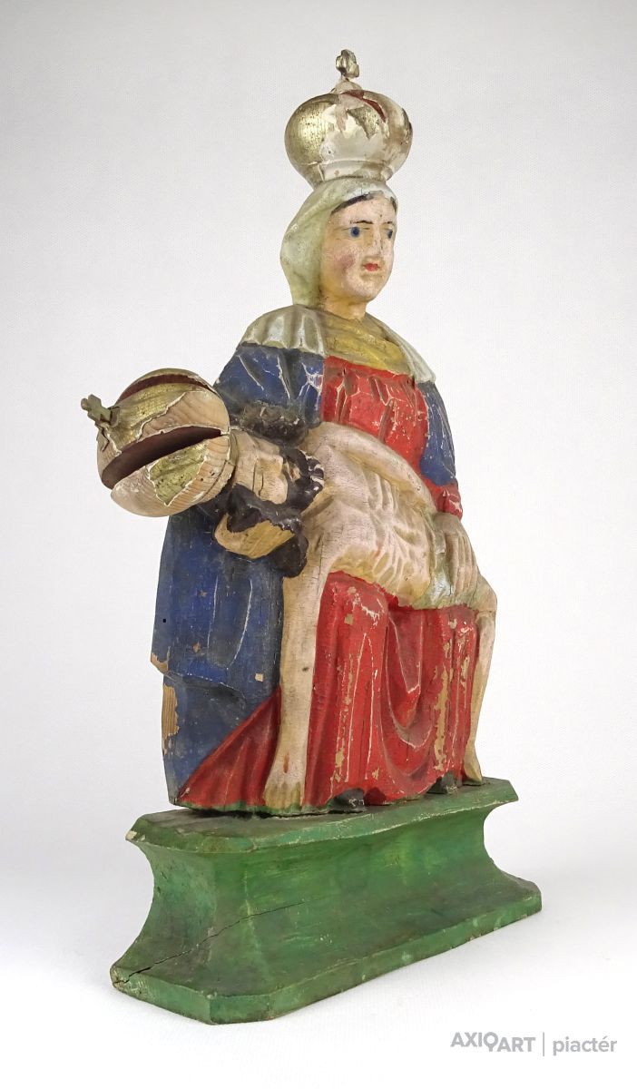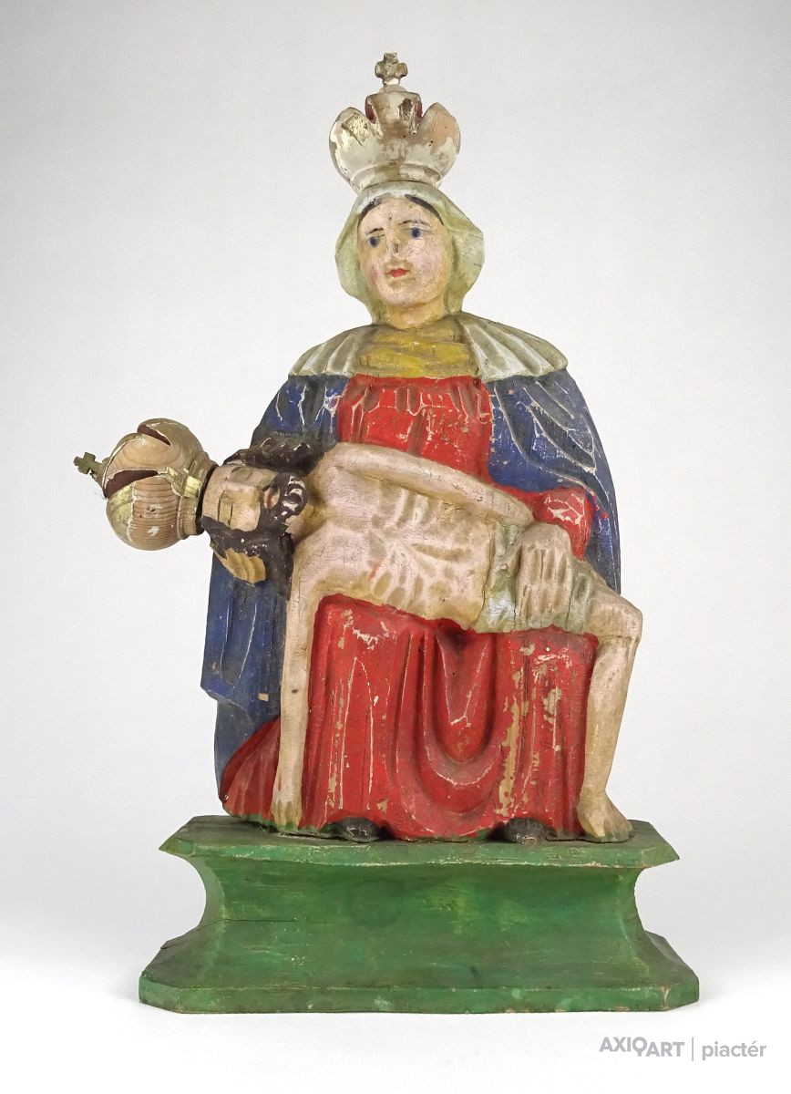 Antik, patinás állapotban lévő talapzaton álló sirató Mária szobor, ölében halott Jézus. Faragott, festett antik szobor, fafaragás.