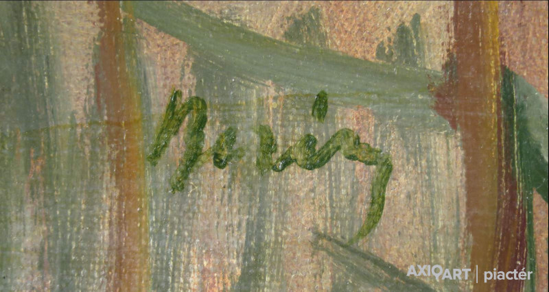 [FK0213/Bp405/17] A kép mérete: 50 x 60 cm keret nélkül. Készült: Olaj, Vászon A kép Hénel Gusztáv (Bustyaháza, 1887, Pápa, 1966) alkotása. Jelezve Balra fent "Hénel Gusztáv, 1934" A festmény jó állapotban van. Keret: Restaurált Magyar festők és grafikusok életrajzi lexikona I-II. Festő. Szinyei Merse Pál, Révész Imre és Aggházy Gyula tanítványa volt, Münchenben pedig Walter Thor iskolájában tanult. Legnagyobb szeretettel és megbecsüléssel azonban Mednyánszky Lászlót emlegette élete során, akivel hosszabb ideig dolgozott együtt a tízes évek elején. Másfél évtizedig mint rajztanár tevékenykedett. Tátrai képeire felfigyelt a szakma és ösztöndíjjal Svájcba ment havasokat festeni. Segantini piktúrájának hatását fedezhetjük fel gazdag színvilágú svájci festményein. Svájci, olasz, holland stb. városok voltak külhoni tanulmányútjainak, kiállításainak színhelyei. Itthon is főleg tájképeket festett, de alkotott figurális kompozíciókat és csendéletképeket is. 1913-tól sűrűn szerepelt fővárosi és vidéki bemutatókon. Utolsó éveit Pápán töltötte és többnyire oktatással foglalkozott. (Műv. 1966/4, Éber) Magyar festők és grafikusok életrajzi lexikona I-II. Műgyűjtők és kereskedők kézikönyve Festő. Szinyei Merse Pál, Révész Imre és Aggházy Gyula tanítványa volt. Münchenben pedig Walter Thor iskolájában tanult. Legnagyobb szeretettel és megbecsűléssel azonban Mednyánszky Lászlót emlegette élete során, akivel hosszabb ideig dolgozott együtt a tizes évek elején. Másfél évtizedig mint rajztanár dolgozott. Tátrai képeire felfigyelt a szakma és ösztöndíjjal ment Svájcba havasokat festeni. Se gantini piktúrájának hatását fedezhetjük fel gazdag színvilágú svájci festményein. Svájci, olasz, holland, stb. városok voltak külföldi tanulmányútjainak, kiállításainak színhelyei. Itthon is elsősorban tájakat festett, de alkotott alakos kompozíciókat és csendéletképeket is. 1913-tól sűrűn szerepelt fővárosi és vidéki bemutatókon. Utolsó éveit Pápán töltötte és többnyire oktatással foglalkozott. (Műv. - 1966/4) Magyar festők és grafikusok adattára Budapesten tanult s azután mint rajztanár működött. Táj- és csöndéletképeivel 1913 óta sűrűn vett részt a budapesti és vidéki tárlatokon. - Irod.: MTA, Jelencsik Sándor, Jókai Mór Városi Könyvtár, Pápa, 1985. nov. 14-i levele. Művészeti lexikon I-II. Budapesten tanult s azután mint rajztanár működött. Pápán él. Táj- és csendéletképeivel 1913 óta sűrűn vett részt a bpesti és vidéki tárlatokon.