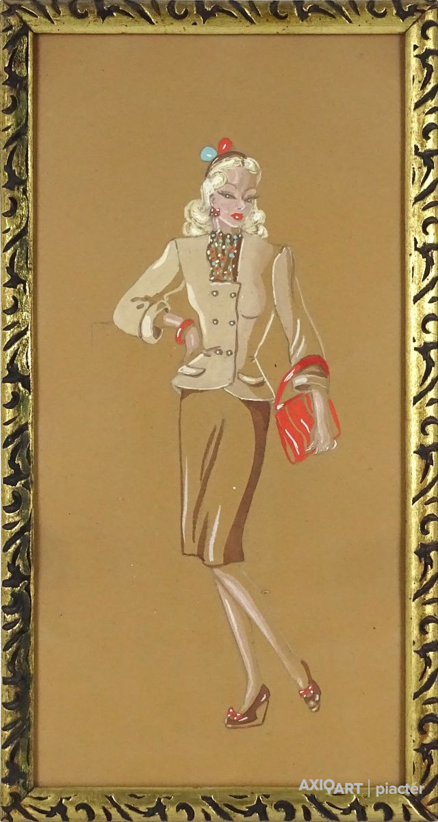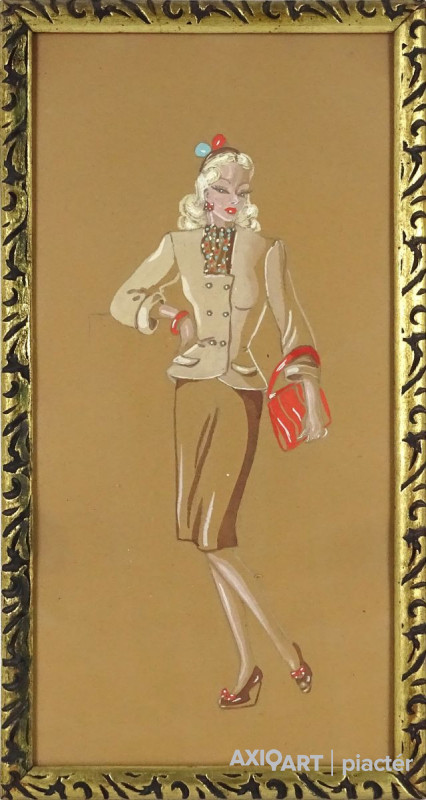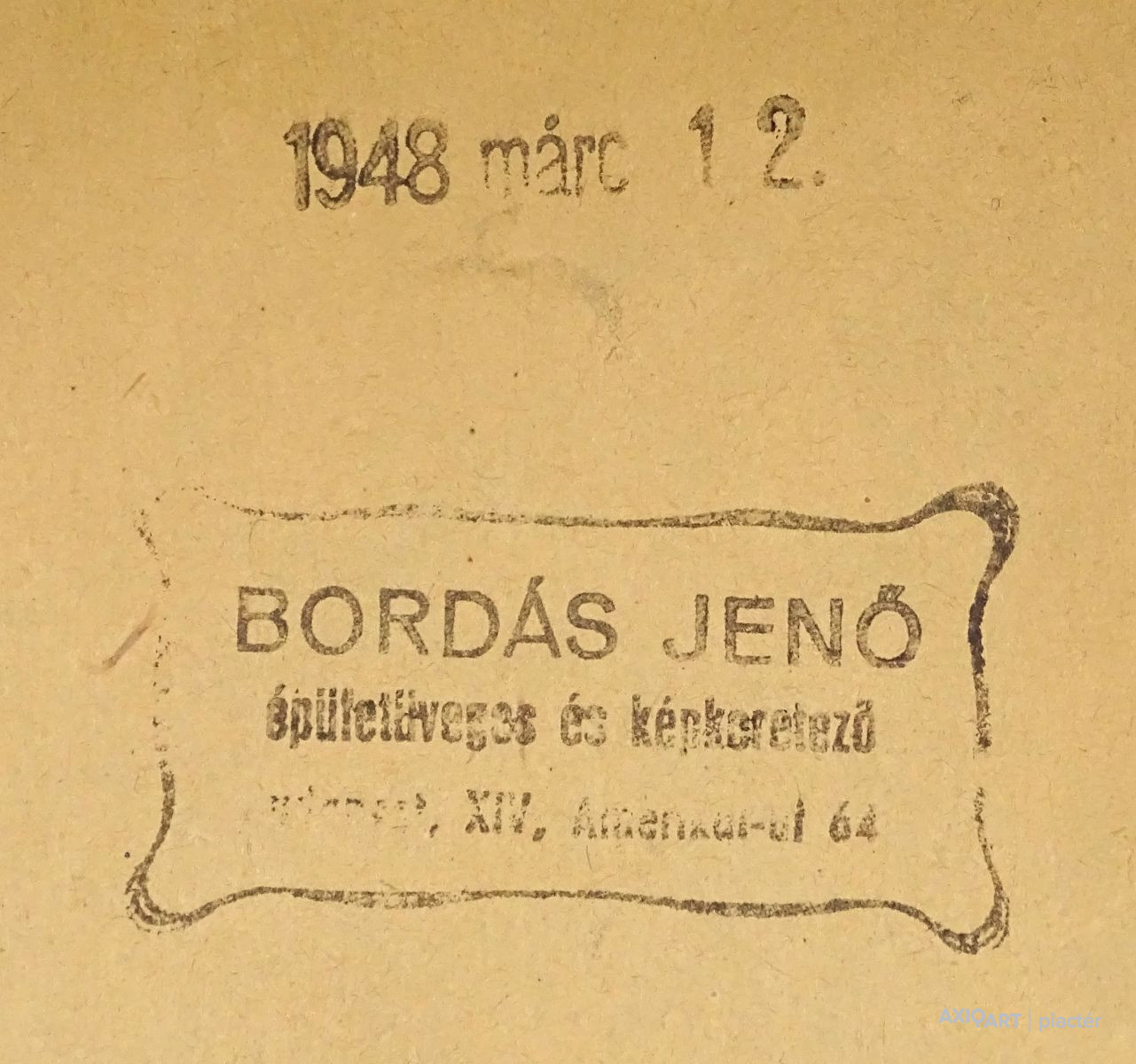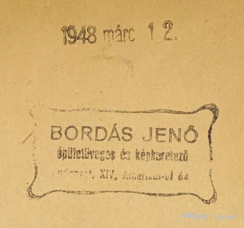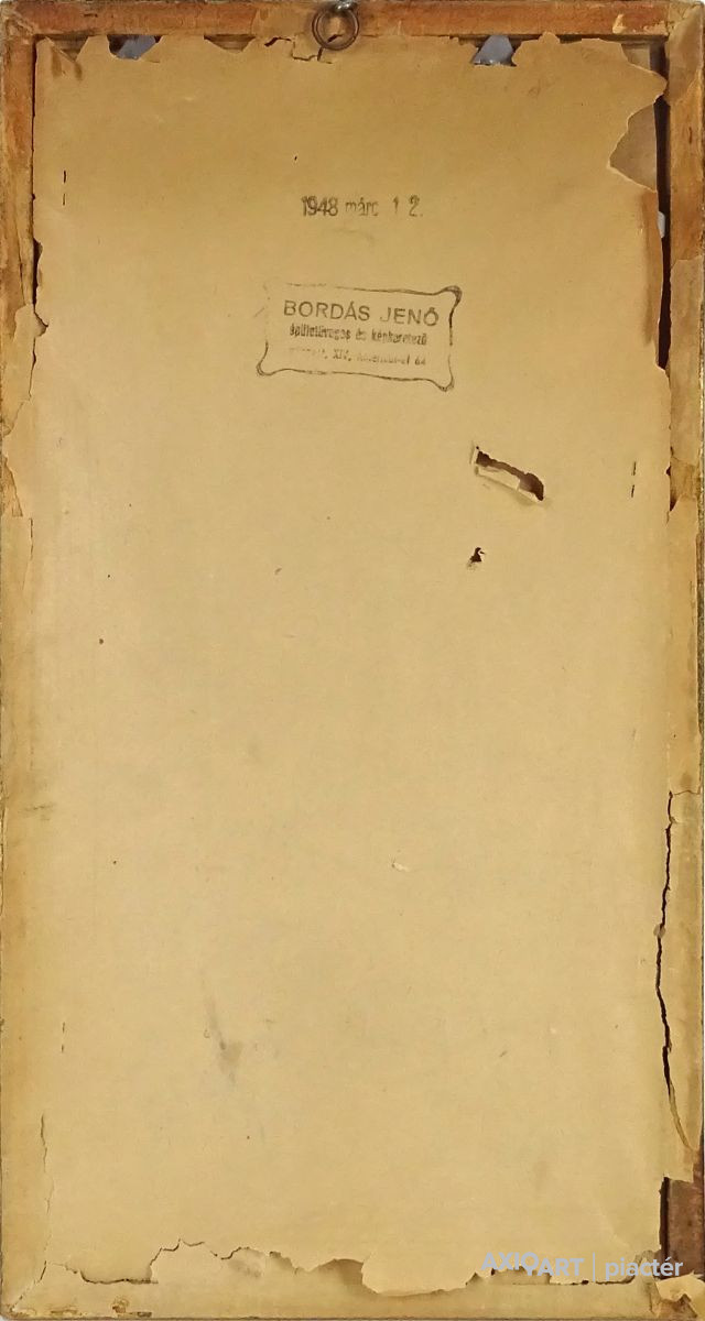 [1M387/079] Papír akvarell, ceruzarajz vegyes technika üveglap mögött, aranyozott keretben. Akasztási lehetőséggel rendelkezik. Hátoldalán bélyegző: 1948. márc. 12. BORDÁS JENŐ ÉPÜLETÜVEGES ÉS KÉPKERETEZŐ BUDAPEST Magasság: 34 cm Szélesség: 18 cm Súly: 0.38 kg