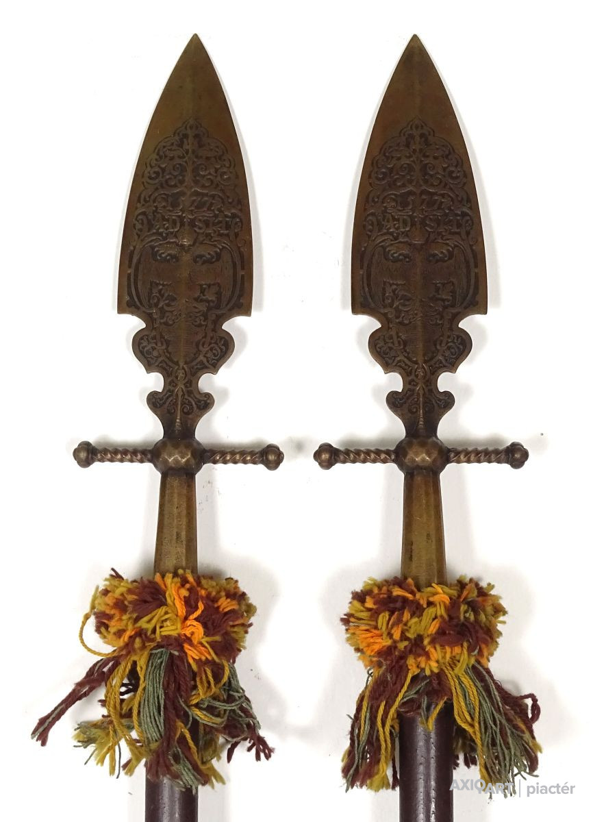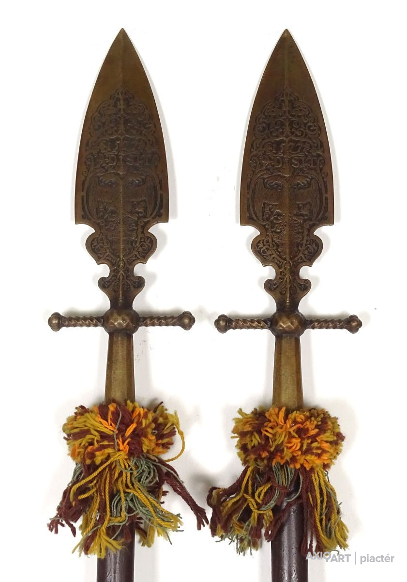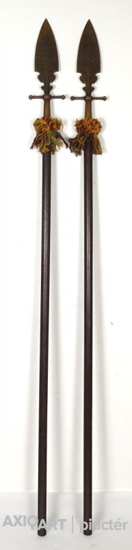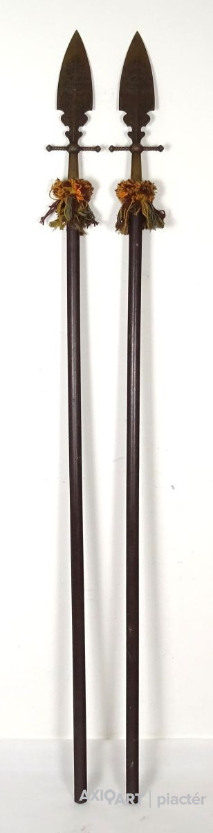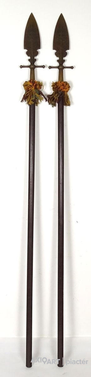 Igényes XX. századi partizán lándzsa másolat, replika pár. A lándzsa fején a díszítés II. Rudolf császár jelvényét tartalmazza, 1577-es dátum és a császár jelszava AD SIT (szó szerint: "Isten velem", de az Auxilium Domini mottó rövidítése is. Sit Iniquis Terror, "Isten segítsége rettegés a gonoszok számára"), egy kétfejű sas, birodalmi koronával, egyik karmában nyíllal.