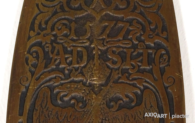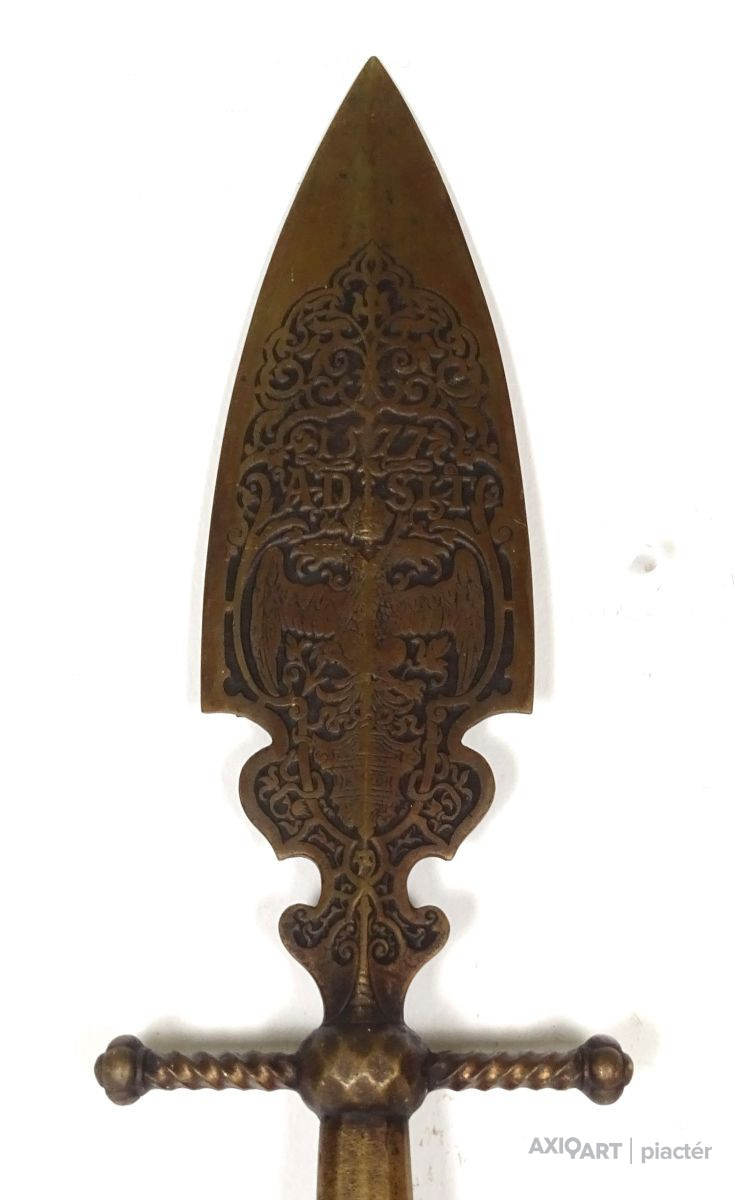 [1R076/KCS] Igényes XX. századi partizán lándzsa másolat, replika pár. A lándzsa fején a díszítés II. Rudolf császár jelvényét tartalmazza, 1577-es dátum és a császár jelszava AD SIT (szó szerint: "Isten velem", de az Auxilium Domini mottó rövidítése is. Sit Iniquis Terror, "Isten segítsége rettegés a gonoszok számára"), egy kétfejű sas, birodalmi koronával, egyik karmában nyíllal. Hosszúság: 191 cm Súly: 3.61 kg II. RUDOLF (1552-1612)     II. Rudolf 1552. július 18-án Bécsben született. I. Rudolf néven magyar király 1572-től 1608-ig, egyben II. Rudolf német-római császár és cseh király (1576-1612). Birodalma rovására sokat foglalkozott asztrológiával, mágiával és alkímiával. Prágai palotájában maga is kísérletezett aranycsinálással. Ehhez udvarába hívta a kor jelentős alkimistáit, például az angol Edward Kelley-t, a lengyel Michael Sendivogiust. A prágai Hradzsinban palotája mellett az alkimisták műhelyei kis utcácskát foglaltak el. II. Rudolf 1612. január 20-án halt meg Prágában. Az Országos Széchenyi Könyvtár kézirattárában van egy érdekes, alkimista recepteket tartalmazó munka, amelyet Rudolfnak ajánlottak (jele: 9/Duod. Grem.). A pergamenhártyára írt szöveget gondosan aranyozták. A címlapon Rudolf neve áll, a belső lapján szereplő sorok szerint pedig "...Main Bruder suchet Kronen, ich den Stein der Weisen". (A mondást Rudolfnak tulajdonítják.) Az egykori források arról számolnak be, hogy Rudolfnak birtokában is volt a bölcsek köve (Stein der Weisen, Lapis philosophorum, universaltinctura), amely a "tökéletlen" fémet arannyá és ezüstté változtatta. A tinktúrát Rudolf ezüstszelencében tartotta, és mindenhová magával vitte. Halála után állítólag működésének eredményét, a tégla alakú öntött aranyat is megtalálták.  Forrás: https://mek.oszk.hu/02000/02060/html/rudolf.htm