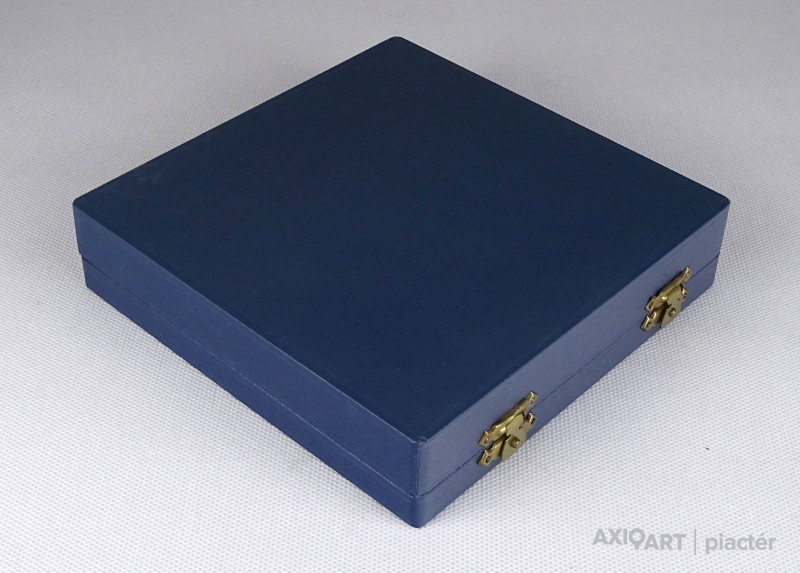 [1I390/X026] Hibátlan állapotú, jelzett bronz plakett szép bőrdíszműves bőr tokban. Elején plasztikus virágdíszítés mellett jelzés: KL Hátoldalán felirat: A KISZ. KIVÁLÓ PROPAGANDISTÁJA Súly: 0.485 kg Kutas László szobrász Budapest, 1936-04-17 Szerző: Matits Ferenc Gimnazistaként Sopronban Ágoston Ernő szabadiskolájában sajátította el a rajzművészet alapismereteit, majd 1954 és 1960 között a Magyar Képzőművészeti Főiskolára járt, ahol Gyenes Tamás és Pátzay Pál voltak a mesterei. Érzékletes mintázás, jó formaérzék, szellemes komponálás, választékos anyaghasználat tünteti ki plasztikai működését. A realista hagyományokra épülő, egyéni stílusát tükröző kő és bronz köztéri szobrokon kívül narratív kisplasztikákat, érmeket készít. A Magyar Nemzeti Bank pályázatain 11 alkalommal nyert emlékpénz készítésére megbízást. A firenzei Giorgio Vasari Nemzetközi emlékérem pályázaton 1974-ben I. díjat kapott, a Sportérem pályázaton 1975-ben II. és III. díjat, az Ezüstgerely pályázaton 1976-ban különdíjat érdemelt ki. 1979-ben a ravennai Dante Biennálé ezüst érmét, 1991-ben és 1995-ben pedig a soproni Országos Éremművészeti Biennálén Roisz Vilmos-díjat nyert. 1990 óta zsűritag a Ravennai Kisplasztikai Dante Biennálén. Figurális kisplasztikái egy-egy történetet mesélnek el. Az alakok kifejező megmintázása, környezetbe helyezése, dinamikus megfogalmazása elgondolkodásra késztetnek. Alkotásai népszerűek a hazai, valamint külföldi gyűjtők körében és szereztek a művésznek világhírnevet. Irodalom (kat. bev., Országos Széchenyi Könyvtár Galéria, 1994) ESZES A.: Otthon útközben. Műteremlátogatás ~nál, Anna, 1994/7. KOVÁCS P.: A tegnap szobrai, Szombathely, 1992 VEKERDY T.: ~ és szobrai, Várhely, 1997/3. Film BAYER I.: Művészportré, Civil Kurázsi Műsor, MTV, 1994-5. Egyéni kiállítások Egyéni kiállítások 1976 • Festőterem, Sopron • Haydn Művelődési Ház, Fertőd 1983 • Bank für Gemeinwirtschaft, Regensburg • Haydn Művelődési Ház, Fertőd • Munkás Művelődési Központ, Paks 1990 • Galerie Meerbusch, Düsseldorf 1993 • Városi Kórház Galéria, Grevenbroich (D) • Galerie Greve, Hamburg 1996 • G. P. Breughel, Venlo (gyűjt.) 1998 • Galéria, Tamási. Válogatott csoportos kiállítások Válogatott csoportos kiállítások Őszi Tárlatoknak és 1977-1999 • Országos Éremművészeti Biennáléknak. 1977-től vett részt a FIDEM nemzetközi kiállításain. A ravennai Dante Biennálén1975-ben, 1977-ben és 1979-ben vett részt. 1964 • Vásárhelyi Tárlatok 1954-1963, Magyar Nemzeti Galéria, Budapest 1968 • Az új Kecskeméti Művésztelep, Katona József Múzeum, Kecskemét 1970 • Kiállítás a Szakszervezetek Országos Tanácsa képzőművészeti pályázatára érkezett alkotásokból, Magyar Nemzeti Galéria, Budapest 1972 • 6. Balatoni Nyári Tárlat, Balatoni Múzeum, Keszthely 1974 • Vásárhelyi Tárlatok 1964-1973, Magyar Nemzeti Galéria, Budapest • G. Vasari nemzetközi Érembiennálé, Firenze 1976 • Balatoni Nyári Tárlat, Balatoni Múzeum, Keszthely 1979 • VI. Országos Kisplasztikai Biennálé, Pécs 1982 • Magyar mesterek, G. P. Breughel, Amszterdam 1990 • Ágoston Ernő tanítványai, Villamosipari Szakközépiskola Galéria, Sopron 1991 • Soproni Képes Céh Kiállítás, Collegium Hungaricum, Bécs • Soproni Képes Céh Kiállítás,Lajtaújfalu [Potzneusiedl] 1992 • Képes Céh Kiállítás, Lábasház, Sopron 1995 • Névjegy-érem kiállítás, OTP Galéria, Budapest 1996 • Képes Céh Kiállítás, Lábasház, Sopron. Művek közgyűjteményekben Művek közgyűjteményekben Királyi Éremtár, Stockholm Liszt Ferenc Múzeum, Sopron Városháza Gyűjteménye, Firenze Windsor Palota Gyűjteménye.  Forrás: artportal.hu