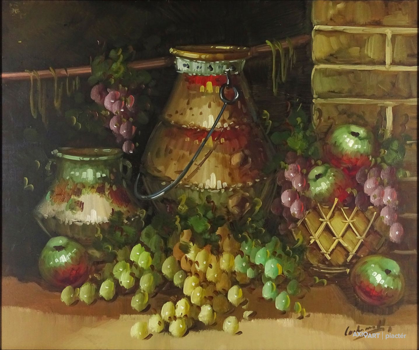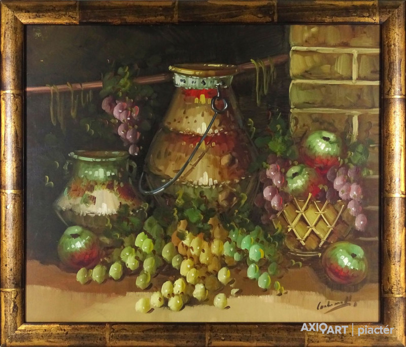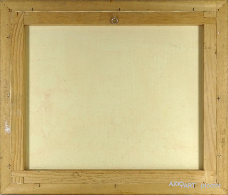 [FK0037/Z018] A kép mérete: 50 x 70 cm keret nélkül. Készült: Olaj, Vászon A kép Paizs László (Szentpéterúr, 1935) alkotása. Jelezve Jobbra lent "P. L." A festmény jó állapotban van. Keret: Ép A festmény hátoldalán a Képcsarnokvállalat címkéje található. Magyar festők és grafikusok életrajzi lexikona I-II. Festő. Tanulmányait a budapesti Iparművészeti Főiskolán végezte 1959-ben. Z. Gács György, Rákosy Zoltán és Szentiványi Lajos növendéke volt. A '60-as évek első felében hagyományosabb felfogású olajképeket festett, mozaikokat, freskókat, utóbb a pop-art körébe tartozó, a francia Arman munkáival rokon műveket alkotott. 1961 óta kiállító művész. Egyéni (Fényes Adolf Terem, Csók Galéria, Műcsarnok, Magyar Nemzeti Galéria, Halászbástya, Bástya Galéria, Vigadó Galéria, Budapest Galéria, Győr, Szombathely, Szeged, Zalaegerszeg, Duisburg, Aix-en-Provence, stb). és vegyes (Ernst Múzeum, Műcsarnok, Óbuda Galéria, Magyar Nemzeti Galéria, Csók Galéria, Vigadó Galéria, Székesfehérvár, Kaposvár, Pécs, Hódmezővásárhely, Firenze, Milano, Padova, Nápoly, Velence, Düsseldorf, Aachen, Genf, stb) tárlatokon vett részt. 1980-ban Munkácsy-díjjal jutalmazták, 1988-ban Érdemes Művész kitüntető elismerésben részesült. Munkáit őrzi a Magyar Nemzeti Galéria, a Fővárosi Képtár, a szombathelyi képtár, a pécsi Janus P. Múzeum, a székesfehérvári István Király Múzeum és a dunaszerdahelyi Kortárs Magyar Galéria. (H.B.: Műv, 1972/4, K.Gy.: Műv. 1977/2, K.G.: Műv. 1978/10, M.L.: Műv, 1983/5, R.G.: Műv, 1987/9, Sz.Gy.: Új Műv. 1995/4, MK) Magyar festők és grafikusok életrajzi lexikona I-II. Műgyűjtők és kereskedők kézikönyve Festő. Tanulmányait a bp.-i Iparművészeti Főiskolán végezte. Mozaikokat ferskókat, utóbb a pop-art körébe tartozó, a francia Arman műveivel rokon műveket alkotott. Mozaikok: a Szegedi Megyei Tanács, a Pécsi Óvoda, a Gödöllői Agrártudományi Egyetem. Freskók: Budapest - Csatárka úti Gyermekotthon. 1971-ben a Fényes Adolf Teremben volt kiállítása, 1983-ban pedig a szegedi Móra Ferenc Múzeumban nagyszabású tárlatokon mutatta be munkáit. 1988-ban érdemes művész kitüntető elismerésben részesült. (MK) Magyar festők és grafikusok adattára Az Iparművészeti Főiskolán végzett 1959-ben. Mozaikokat (Szeged, Megyei Tanács; Pécs, Óvoda; Gödöllő, Agrártudományi Egyetem), freskókat (Budapest, Csatárka úti Gyermekotthon), újabban a pop art körébe tartozó, a francia Arman műveivel rokon műveket alkotott. 1971-ben a Fényes Adolf Teremben nyílt kiállítása. 1983 februárjában a szegedi Móra Ferenc Múzeumban megrendezett nagyszabású tárlaton mutatta be alkotásait. 1988-ban érdemes művész kitüntető elismerésben részesült. - MK Művészeti lexikon I-IV. (Szentpéterur, 1935. dec. 26.- ): festő. Az Iparművészeti Főiskolán 1959-ben végzett Rákosy Zoltán, Z. Gách György és Szentiványi Lajos növendékeként. Épületdiszítő mozaikokat, (Szeged, Megyei Tanács, 1961; Pécs, Óvoda, 1964), műanyagfreskókat (Bp., Csatárka úti Gyermekotthon, 1964) és gobelinterveket készít. Kortárs magyar művészeti lexikon I-III. Festő, szobrász, grafikus. 1959: MIF, mesterei: Z. Gács György, Rákosy Zoltán, Szentiványi Lajos. 1980: Munkácsy-díj; 1988: érdemes művész. Főiskolás éveinek második felében, majd azt követően számos murális munka kivitelezésében vett részt, Fónyi Géza, Konecsni György, Z. Gács György, Rákosi Zoltán és Domanovszky Endre mellett dolgozva. A 60-as évek első felének hagyományosabb fölfogású olajképeket festett. 1964-ben a Velencei B.-n megismerkedett az amerikai pavilonban a pop art Európában akkor még újnak számító törekvésével, és részben ez inspirálta, hogy 1967-ben textil, fém, bőr anyagú "varrottas" képeket küldjön az FKS éves tárlatára; a megnyitó előtt többek között az ő munkáit is eltávolították a falról. A 70-es években pop art-os objekteket (A trónörököspár politikai gyilkosság áldozata lett, 1970, plexiüveg, újság, szarvasbogarak), majd konstruktív, átlátszó plexiüveg plasztikákat készített belső fénytörő határfelületekkel. A 80-as években készültek az anyagában színezett, konstruktív, nagyméretű poliészter szobrai, majd színes poliészter táblaképeket alkotott, mesterségesen roncsolt felületekkel, mintha régészeti leletek vagy atomtámadás utáni festmény-szurrogátumok lennének. Ekkor kezdett organikus plaszikájú bronzszobrokat is mintázni. A 90-es években, a táblaképek és szobrok mellett nagyméretű, egyedi grafikákat készített, formavilágában némileg a roncsolt táblaképekből kiindulva, de szinte kizárólag az emberi alakból elvonatkoztatott torzókat megjelenítve. Ek: 1966: Művészklub, Győr; 1971: Fényes A. T.; 1972: Bercsényi 28-30 G.; 1973: BME B-épület; 1976: Csók G.; 1977: G. Hildebrandt, Duisburg (NSZK); 1979: Bástya G., Halászbástya; Helyőrségi Műv. H., Nagyatád; József A. Műv. Közp., Szeged; Göcsej M., Zalaegerszeg; 1982: Bezzegh G., Küsnacht (CH); 1983: Móra F. M., Szeged; 1987: Műcsarnok (kat.); MNG; 1988: Pandora G., Badacsonytomaj; 1989: Parktheatter, Iserlohn (NSZK); Qualitas G.; Hevesi S. Színház, Zalaegerszeg; 1990: Vasarely Fondation (Ferdinánd Judittal, Fóth Ernővel), Aix-en-Provence (FR); 1994: Vigadó G.; 1997: Pest Center G.; 1998: Budapest G. (kat.); 1999: Pest Center G. (kat); G. Arcis, Sárvár; MMA, Bp.; 2001: SZK, Szhely; Ernst M. (kat.) Vcsk: 1961, 1964, 1966: FKS, Ernst M.; 1962: 9. Magyar Képzőműv. kiállítás, Műcsarnok; 1967: Mai magyar festészet, Új-Delhi; 1969: Vas megyei művészek, Savaria M., Szhely; V. Orsz. Grafikai B., Miskolc; 1971: Új művek, Műcsarnok; 1972: Fiatal művészek Budapestről. Likovni Salon, Újvidék (YU); 1972, 1973: Balatonboglár