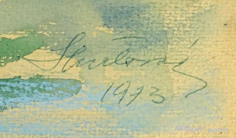 [1S133/138] 25% ÁRENGEDMÉNY MINDEN TERMÉKÜNKRE Dec. 14-ig Papír akvarell üveglap mögött, vajszínű keretben. Akasztási lehetőséggel rendelkezik. Jobbra lent datált jelzés: ... 1973 Magasság: 53.5 cm Szélesség: 67.5 cm Súly: 2.495 kg