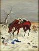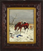 [0U895/W007] Olaj fatábla jelzett festmény, hibátlan állapotú aranyozott keretben. Jelzés balra lent: KURUCZ 932 Hátoldalán felirat ceruzával: TANYA TÉLEN Képcsarnok Vállalat címkéjén felirat: QURUCZ D. ISTVÁN TANYA TÉLEN Magasság: 66.5 cm Szélesség: 87.5 cm Súly: 3.7 kg Kurucz D. István festő Születési hely: Hódmezővásárhely Születési dátum: 1914 Honlap: Kiállítások az adatbázisban:  Mesterei: Rudnay Gyula, Benkhard Ágoston, Szőnyi István, Nagy Sándor. 1933: Szőnyi István magániskolájának növendéke; 1934-1940: Magyar Képzőművészeti Főiskola, mesterei: Rudnay Gyula, Benkhard Ágoston, Szőnyi István, Nagy Sándor. 1950: Munkácsy-díj; 1960: a VII. Vásárhelyi Őszi Tárlat Tornyai-plakettje; 1941-1942, 1961, 1983: római ösztöndíj; 1964: Szakszervezetek Országos Tanácsa-díj: 1971: érdemes művész; 1974: a Munka Érdemrend arany fokozata; 1977: Káplár Miklós-díj és emlékplakett; 1978: kiváló művész; 1984: Szocialista Magyarországért érdemrend; 1985: Kossuth-díj. 1940-ben Hódmezővásárhelyen telepedett le. 1943-1947 között bekapcsolódott szülővárosa művészeti és közéletébe, a Vásárhely Népe c. lap munkatársa, 1948-ban Budapestre költözött, a Kossuth Akadémia képzőművész körének vezetője volt. 1949-1959 között Szőnyi István tanársegédjeként freskótechnikát tanított a főiskolán. 1951-1952 között megszervezte a Honvédségi Képzőművészeti Stúdiót, majd kinevezték a Honvéd Képzőművészeti Iskola igazgatójának. 1953-ban vásárhelyi házában és műtermében megnyílt a Képzőművészeti Alap 8. sz. művésztelepe. 1962-ben kiállított a XXXI. Velencei Biennálén. 1963-tól Budapesten dolgozott. Tanulmányúton járt több kelet- és nyugat-európai országban, valamint Japánban, Mongóliában és Algériában. A vásárhelyi iskola reprezentáns egyéniségeként jelentős szerepe volt a Vásárhelyi Őszi Tárlatok elindításában. Megszervezte és vezette a Mednyánszky Társaságot, s haláláig a Hajdúsági Nemzetközi Művésztelep, valamint a Hortobágyi Alkotótábor elnöke volt. Képi világát és etikai alapállását tekintve a magyar piktúra fejlődésében különös szerepet játszó alföldi festészet folytatója, ám ezt a Tornyai és Koszta kezdeményezte népi realista irányzatot a társadalmi-gazdasági fejlődés aktuális fejleményeihez igazítva, egyéni felfogásban művelte. Szemlélődő habitusa jó fogódzóra lelt a temperafestés újrafelfedezésében, amelynek könnyed, levegős színharmóniái nála - az elődöktől eltérően - határozott rajzossággal és a tónusok árnyaltságával ötvöződtek. Első korszakában, a 40-es években még szorosan tapad a tradíciókhoz, amit az indulása mögé hátteret rajzoló valóság, ifjúságának szociális- és természetélményei magyaráznak. Korai művei (Disznóvásár, 1939; Kapu előtt, 1941; Tyúketetés, 1943) voltaképpen képi eszközökkel megoldott szociofotók, melyeket a közlés expresszív ereje, a visszafogott indulat és az ábrázoltakkal való együttérzés szemérmes lírája tesz hitelessé. A II. világháborút követő idők dinamikus atmoszférája jelentős változásokkal járt festészetében, ami tárgyköre kibővülése mellett kompozíciós módszereinek leegyszerűsödésében érhető tetten. Olykor a fogalmi érzékelésig eljutó jellemzése régi témáit is új tartalmakkal telíti: a paraszti életforma józan realitásai már nem a társadalmi mozdulatlanság, hanem a céltudatosan és hasznosan élt emberi élet, az erkölcsi értékek szimbólumaiként jelennek meg képein (Halászok, 1945, Földosztás, 1946). Különösen kifejezőek ebből a szempontból alakos ábrázolásai, melyeken az ikonszerű tömörséggel megfogalmazott figurák a földdel összenőtt ember sorsának természetes ethoszát alakítják képi emócióvá (Parasztasszony, Csikós, 1961). Más műveiben a mezei munka civilizálódását nyomozva a táj új típusú, "társadalmasított" ábrázolását, s vele a 60-as évek kollektivizálódott Alföld-képét teremti meg (Cséplés, 1958; Aratás, 1960). Az alföld problémakörhöz kapcsolódnak a 60-as években megszaporodó tájábrázolásai is, amelyek fő témája a mély horizontú, legtöbbször ember nélküli alföldi táj mindent magába olvasztó végtelensége (Fehér tanyák, Tél, 1963). A táji inspiráció forrása a 70-es évek közepétől már nem a távlati élmény, hanem a táj anyagi és szellemi mivoltát meghatározó természeti közeg, amelynek megjelenítésében - merészen átlépve a konvenciókon - a nonfiguratív festészet eszköztárát is felhasználja. Pályája utolsó harmadában festett Hortobágy-ábrázolásai immár a természet mélyebb struktúráit megismerő és átélő ember újszerű látomásai. Bár technikai felkészültsége és kompozíciós készsége szinte predesztinálták murális feladatok megoldására, alig néhány műve került megvalósításra. Több pannó- és freskóterve, így a Mohácsi csata és a Hajdúság története vázlatstádiumban maradt, vagy csak részben került kivitelezésre. Elméleti kérdések is foglalkoztatták, több cikket, tanulmányt írt a rajztanítás, a művészképzés, a műkereskedelem és a művészetpolitika kérdéseiről. Egyéni kiállítások 1960 • Műcsarnok, Budapest [Kamotsay Istvánnal] 1965, 1968 • Milánó 1970 • Csók Galéria, Budapest 1974 • Vaszary Terem, Kaposvár 1976 • Józsefvárosi Galéria, Budapest 1987 • Csók Galéria, Budapest • Művészetek Háza, Szekszárd • Hollósy Galéria, Budapest 1989 • Vármúzeum, Simontornya • Városi Kiállítóterem, Zalaegerszeg. Válogatott csoportos kiállítások Vásárhelyi Őszi Tárlatokon, a Hatvani Tájkép és Portrébiennálékon, a Szegedi Nyári Tárlatokon stb. Képei bemutatásra