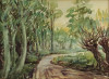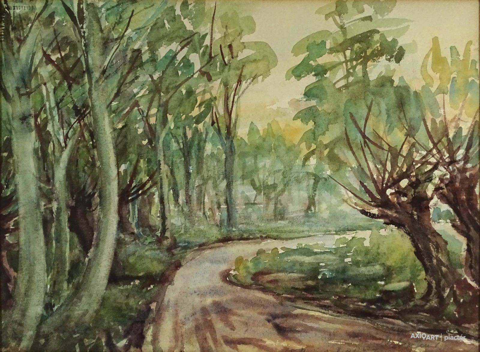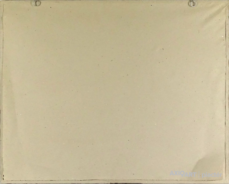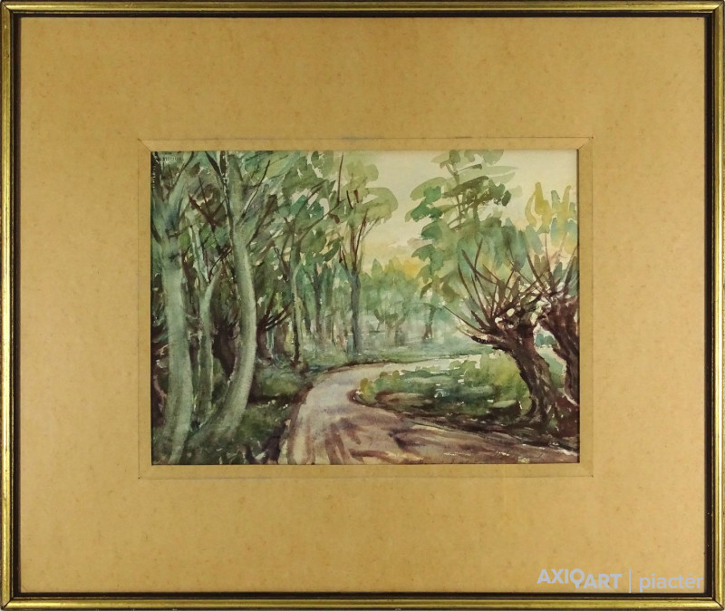 [FKA431/Bp305/89] A kép mérete: 14,5 x 13 cm keret nélkül. Készült: Akvarell, Papír A kép Hajdú László (Léva, 1938) alkotása. Jelezve jobbra fent "Hajdú L. 81" A festmény jó állapotban van. Keret: Ép Kortárs magyar művészeti lexikon I-III. Festő. Léva, 1938. dec. 17. 1957-63: MKF, mesterei: Domanovszky Endre, Kádár György, Barcsay Jenő. 1964-ben Stuttgart; München; 1971-ben Francia-, Olaszország; 1977-ben Pocitelju (YU) Nközi Művésztelep; 1965-82 között adriai-, égei-, földközi-tengeri utazásokat tett. 1966-69 között Derkovits-ösztöndíjas. 1984-ben elnyerte a Szentendrei Grafikai Műhely nagydíját. Alapító tagja a Szentendrei Grafikai Műhelynek, az Art'éria Galériának. 1989-től 1991-ig a Belvedere c. művészeti folyóirat képszerkesztője. 1968-tól Szentendrén él. Soha nem a naturalisztikus formától vagy konkrét tájélményből indul el a lírai absztrakt foltfestészet felé, hanem a természeti erők: víz, levegő, föld formáját kutatja. A 80-as évekre egy új tendencia mutatkozik az oeuvre-ben: az érzékeny, indulatosan megfestett felület mögül idolok, ferde tornyok sejlenek fel, sarkukra állított négyzetek állnak a pszeudohorizonton. A 90-es évek elején összefoglaló igényű kiállítást rendez a budapesti Francia Int.-ben, neogeometrikus sorozataiban Saint-John Perse gondolataira hivatkozva. Ezeken a munkákon mediterrán hangulatú emlékanyagra utalnak a mértanias formák. Négyzetei nem síkgeometriai jelek, hanem kultúrhistóriai szimbólumok. A 90-es évek derekára Hajdú festészete egyre filozofikusabbá válik. Tábláin okkerek, sárgák, szürkék különféle árnyalatai töltik ki a képmezőt. A felületet sötét, határozott vibrálások, diagonálisok, horizontális rendek tagolják. Archetipikus hangulatú munkáinak legjellemzőbb vonása a tér virtuális felosztása. Hajdú piktúrája mégis tartalmat szociális vonatkozásokat, amennyiben festészetét a monetáris világ elleni halk, de határozott tiltakozásnak tekinti. Ek.: 1975: Művésztelepi G., Szentendre, (kat.); 1977: Műcsarnok (kat.); 1986: Hotel Kastély G., Szirák; 1989: Dorottya u.-i G. (kat.); 1990: Francia Int., Bp., (kat.); 1991: Kunstsammlungen der Stadt Limburg (Farkas Ádámmal és Regős Istvánnal); 1992: Art'éria G., Szentendre; 1996: Kanzlei Gartner; Stübel, Baumann & Partner, Stuttgart; 1997: Kaposfüredi G., Kaposfüred. Vcsk: 1966: Stúdió '66, Ernst Ml; 1971: Új művek, Műcsarnok; 1976: Szentendrei Művészet, MNG; 1978: Festészet '77, Műcsarnok; 1983: Szentendrei Tárlat, Szentendrei Képtár, Szentendre; 1985: El Studio Grafico de Szentendre, Madrid; 1985: Szentendrei Tárlat, Szentendrei Képtár; 1986: Delmenhorst Zeitgenössische Kunst aus Ungarn; 1987: Art'éria G. kiállítása, Stadtm., Woerden (NL); Szentendrei Tárlat, Szentendrei Képtár, Szentendre; 1990: Otto Nagel, Hans der Staatlichen M., Berlin; 1993: Szentendre művészete, G. Contact, Böblingen (D); Az Art'éria művészei, Vigadó G.; 1996: Az én Múzeumom, A Vass-gyűjtemény, Ernst M.; 15 magyar művész, Hans Des Deutschen Oftens, München. Mk: Dajmanich J. M., Szolnok; Ferenczy M., Szentendre; MNG; Nközi Modern M., Hajdúszoboszló; R. Riz Collection, Bolzano; Kim Colleciton, Szöul. Km: mozaik (1970, Lábatlan, Papírgyár); gobelin (1970, Lábatlan, Papírgyár); mozaik (1983, Bp., Pest megyei Köjál) Irod.: Mucsi A.: Előszó Hajdú kiállításához (kat., bev., Szentendre, 1975); Mucsi A.: Előszó Hajdú kiállításához (kat., bev., Műcsarnok, 1977); Horváth Gy.: Hajdú képei a Műcsarnokban, Új Tükör, 1977. márc. 6; Hann F.: Mai mitológiák Hajdú kiállítása a Dorottya utcában, Belvedere, 1989/2; Wehner T.: (kat., előszó, Dorottya u. G.); Van Dam J.: Utazás a háromszög körül. Hajdú képeiről, MŰV. 1989/9; Hann F.: (kat., előszó, Francia Int., Bp.); Hann F.: HL-GEO, Playboy G., 1993; Wehner T.: Ék-képek. Hajdú festészetéről, Kortárs, 1994/7.; Sík Cs.: Mégsem veszett el. Hajdú retrospektív katalógusa, 1996; Krimmel G.: Helyzetek és érzetek. Hajdú festészete, ÚJ, 1997. máj-jún. Portréfilm: Gulyás J.: Hajdú kiállítása a Kaposfüredi Galériában MTV, 1997 (H.F.) Magyar festők és grafikusok életrajzi lexikona I-II. Műgyűjtők és kereskedők kézikönyve Léva, 1938 - Festő. Székesfehérvárott Áron Nagy Lajos szakkörében ismerkedett meg a rajzolás és festés alapelemeivel. A bp.-i Képzőművészeti Főiskolán Domanovszky Endre és Kádár György tanítványa volt. A főiskola után két évig általános iskolában tanított. 1969 óra Szentendrén dolgozik és azóta szerepel különböző hazai és külhoni tárlatokon. Sokszor szerepelt országos tárlatokon, Stúdió Kiállításokon. 1974-ben bemutatkozott Párizsban is, a fiatal magyar festők tárlatán. 1967-1970 k. Derkovits-ösztöndíjban részesült. Színgazdag műveinek tárgya a természet és a tenger. Lendületes ecsetvonásokkal alakít ki vibráló, lüktető foltokat. Festői előadása a nonfiguráció kereteiben mozog. Táblaképei mellett jelentősek kárpitjai, kék, fekete, szürke, barna színekre komponált faliszőnyegei. Mozaiktervezéssel is foglalkozik. (MÉ, M.M.: Műv.-1970/9, K.Gy.: műv.-1970/10, Máv.-1977/1) Magyar festők és grafikusok életrajzi lexikona I-II. Léva, 1938 - Festő. Székesfehérvárott Áron Nagy Lajos szakkörében ismerkedett meg a rajzolás és festés alapelemeivel. A budapesti Képzőművészeti Főiskolán Domanovszky Endre és Kádár György tanítványa volt. A főiskola után két évig általános iskolában dolgozott, mint pedagógus. 1968 óta Szentendrén dolgozik és azóta szerepel hazai és külhoni tárlatokon. Sokszor szerepelt országos bemutatókon, Stúdió kiállításokon. 1974-ben bemutatkozott Párizsban is, a fiatal magyar festők tárlatán. 1967-1970 között Derkovits-ösztöndíjban részesült. Német-, Francia-