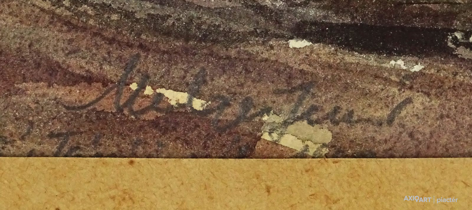 [1L992/038] Papír akvarell festmény üveglap mögött, aranyozott keretben. Akasztási lehetőséggel rendelkezik. Jelezve jobbra lent, lásd fotó. ... JENŐ HEVESI ... Balra fent: VERITABLE PAPIER D'ARCHES FIN Magasság: 52 cm Szélesség: 62 cm Súly: 2.26 kg