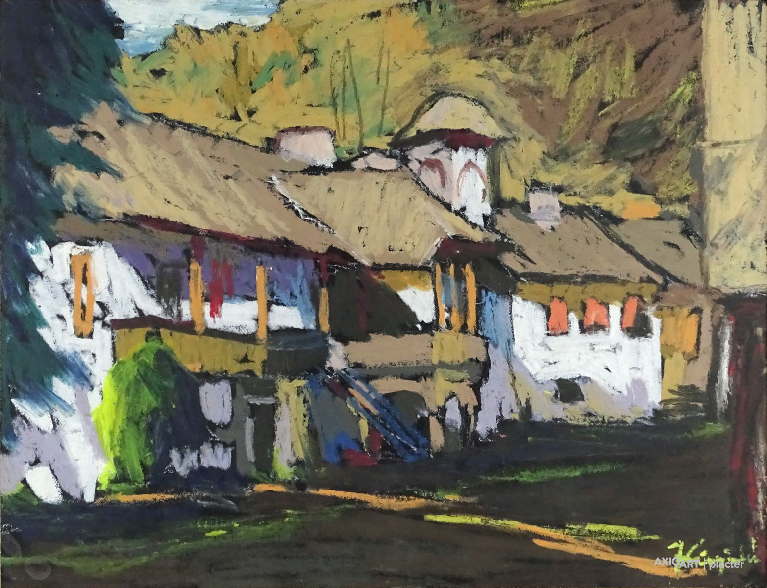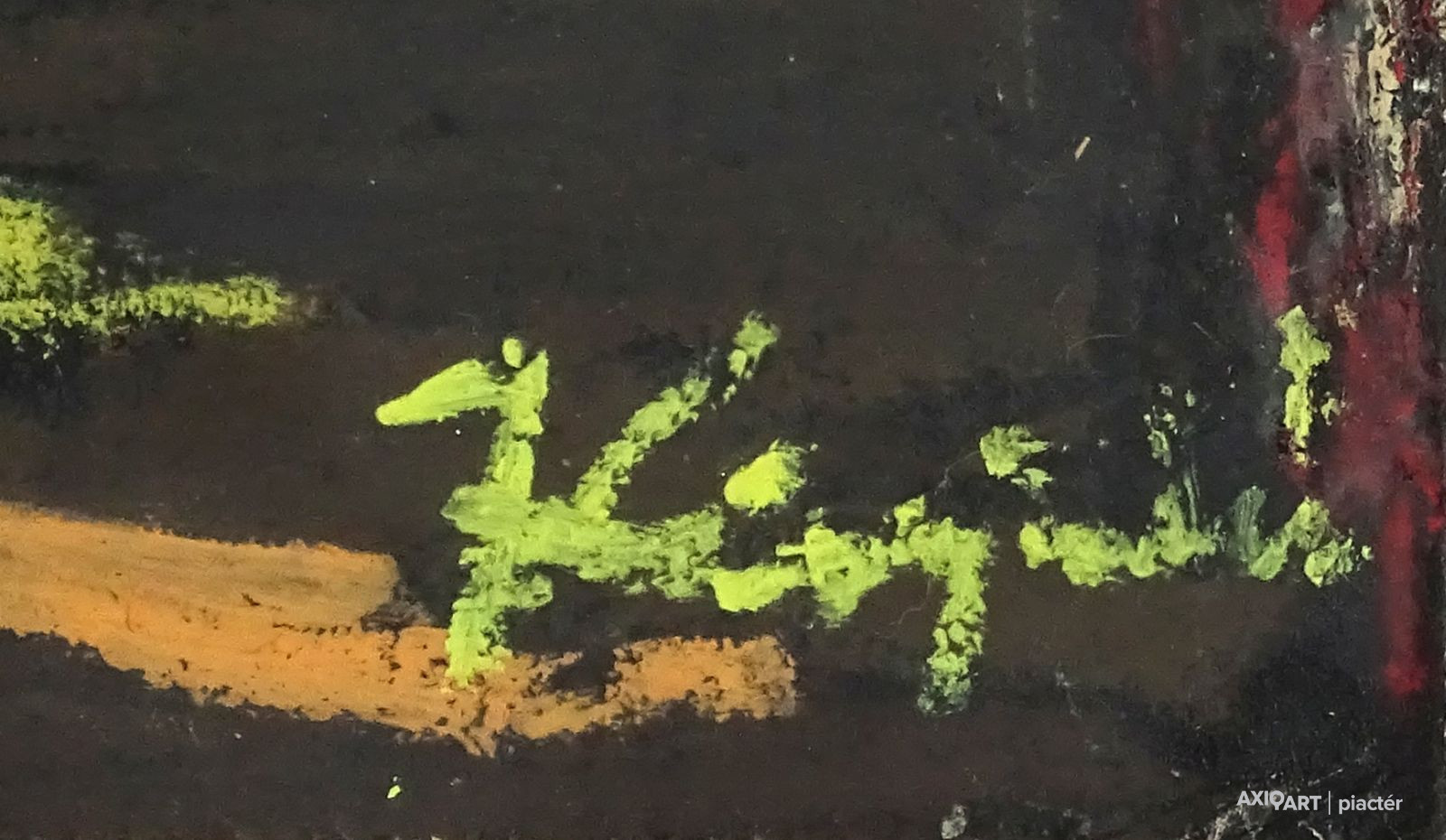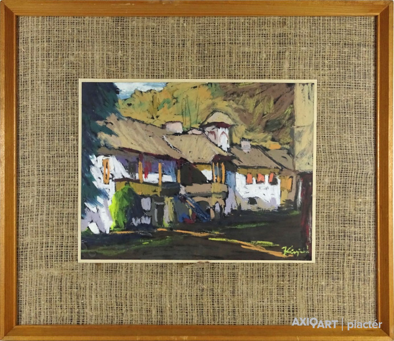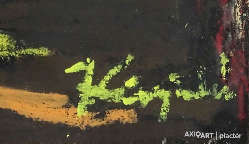 [1Y029/Z018] Olaj farost festmény, üveglap mögött, hibátlan képcsarnokos keretben. Hátoldalán Képcsarnok Vállalat papír címkéje: A művész neve: SCHÉNER MIHÁLY A kép címe: TÁJ Magasság: 66.5 cm Szélesség: 86 cm Súly: 6.54 kg Schéner Mihály festő, grafikus, szobrász, keramikus, bábtervező Medgyesegyháza, 1923-01-9 Elhalálozott: Budapest, 2009. május 11. Honlap: http://www.kormendigaleria.hu/kiadvany.html 1942-1947: Magyar Képzőművészeti Főiskola, tanára: Rudnay Gyula. 1978: Munkácsy-díj; 1984: érdemes művész; 1989: kiváló művész; 1995: Kossuth-díj. 1992-től a Magyar Művészeti Akadémia, 1993-tól a Széchenyi Irodalmi és Művészeti Akadémia tagja. 1956-ig tanított. 1982: Nagyatádi Faszobrász Alkotótelep, 1985: Nemzetközi Acélszobrász Alkotótelep, Dunaújváros. A stílusában felismerhető, mégis sokféle műtárgyat létrehozó ~ gazdag, állandóan alakuló életműve a folyton változó világban helyét kereső, az alkotói szabadságot megvalósító XX. századi képzőművész példázata lehetne. Magát expresszív-szürrealista alkotónak nevezi. Egyaránt dolgozik festékkel, textillel, fával, fémmel. Rajzol, szerkeszt, farag, épít, gyúr, varr és ragaszt, felhasználja a mézesbábok öntőformáit. Festő, rajzoló, textilszobor- és bábkészítő, fazekas, asztalos, esztergályos. Háromlépcsős folyamatban gondolkozik: rajzban tervez, majd fest, szobrot készít, “formába önt”, mindig a végső plasztikai megoldást keresi. Ami állandó és mégis játékosan változékony megjelenésű Schéner művészetében, az a gyermekkori emlékek által meghatározott népi mesterségek iránti tiszteletet kifejező motívumkincs, a tárgyi folklór formakészlete, amely már-már kézjegyként ismétlődik munkáin. Mitologikussá nőtt képzelete új lényeket teremt, pl: a Pigulát, amely disznótestű, emberfejű teremtmény. Schéner festményein a szürrealista motívumokat konstruktív szerkezetbe rendezi, a geometriát és az organikus természeti motívumokat egyaránt beépíti műveibe. A népi, népművészeti formakincsből merített lovas huszárok, betyárok, szegénylegények cifra szűr mentéje, piros csákója, fekete csizmája, az önálló életet élő zsinórdíszek és mézeskalács bábok, a kiskocsik a gyermekkori vásárok, búcsúk színes forgatagába vezet. A primér motívumokat aztán felváltják a vastagon felhordott felületbe karcolt jelek, vonalhálózatok, amelyek a játszó gyermek homokba rajzolt ábráit, a pásztorember fába vésett üzeneteit, az ősember barlang falába rótt mágikus jeleneteit idézik meg. A művész pillanatnyi érdeklődésének megfelelően a színek búvópatakként tűnnek el és jelennek meg ismét. A 60-as években leginkább a formákkal való játék érdekelte, a festmények felülete egyre gazdagodott: a táblaképek felületén applikációk jelentek meg, vagy lemállasztott rétegek hagyták maguk után hiányukat, motívumok nélküli ősformák, archetipikus képzetek bukkantak fel művészetében. A véletlenszerűnek látszó rétegekkel való játék azonban tudatos komponálás eredménye, amely később nyilvánvaló ritmusnak és formai szerkesztettségnek adja át a helyét, mint a Törvénytáblák c. sorozaton. A különböző művészi kifejezési formák egymásra termékenyítő hatással vannak, át- meg áthatják egymást. Textilszobrai, amelyekkel új műfajt teremtett, ugyanazzal az automatikus, expresszív-szürrealista módszerrel készülnek, mint festményei. A hagyományosan a népművészetben alkalmazott anyag, a filc lehetőséget ad a népi formakincs felelevenítésére, amely azonban a művész különös szürrealista átiratában jelenik meg. A szívekkel kivarrt, zsinórdíszes Posztókotlós c. művén mézesbábok lógnak, hátán huszárok lovagolnak. Egész sor textilből készült kéz-plasztikát alkot, amelyeket az ujjakra rávarrt díszekkel öltöztet, személyesít meg. A színes-különös világból aztán ~ újra puritán képi és formai rendbe juttatja el a nézőt, majd nemsokára tépett, gyűrt, vágott, csorgatott, repedezni hagyott szenvedélyesen vonagló képi felületeket hagy hátra. Schéner készített apró gyermekjátékokat, térstruktúra-tereket, mászókákat is. A magyar népi formák mellett szürreális játékaiban gyakran alkalmaz görög mitológiai alakokat, “elkentaurosodott” lovakat, Gorgó-fejeket, sellőket, hárpiákat, Pán-ábrázolásokat. Schéner nemcsak saját művészetéről publikál, hanem művésztársairól is számos írása jelenik meg, elsősorban az Új Auróra c. folyóiratban, amelynek egy ideig főmunkatársa volt. Irodalom kiállítása, Magyar Építőművészet, 1962/4. Húsz év után, Művészet, 1965/4. BOZÓKY M.: ~, Tiszatáj, 1968/5. PERNECZKY G.: Nincs uborkaszezon, Élet és Irodalom, 1969. augusztus 8. BARÁNSZKY-JÓB L.: ~, Művészet, 1969/9. LÁSZLÓ GY.: ~ kaposvári kiállítása, Jelenkor, 1969/4. MAJOR M.: Pásztorok, betyárok, huszárok - kezek, Tükör, 1970. szeptember 15. FRANK J.: Bemutatjuk ~t, Élet és Irodalom, 1972. május 6. ról kiállítása ürügyén, Képzőművészeti Almanach, Budapest, 1972 Sötétkék kokasok, Élet és Irodalom, 1973. szeptember 9. MAJOR M.: ~ játékai, Élet és Irodalom, 1974. július 27. BARTA J.: Egy különös művész, Alföld, 1974/6. VADAS J.: Szárnykészítők, Élet és Irodalom, 1975. október 4. JUHÁSZ F.: A halál ellen játszani, Élet és Irodalom, 1975. május 17. PAP G.: Kincsek és műkincsek, Művészet, 1975/6. P. SZŰCS J.: Az utak kettéválnak, Művészet, 1978/3. Békési művészet, Művészet, 1978/7. SZAMOSI F.: ~ [kismonográfia], Budapest, 1978 VADAS J.: Játék a játékkal, Élet és Irodalom, 1979. augusztus 18. NÉMETH L.: ~ műveiről, Művészet, 1979/4. MIKLÓS P.: Mit akar ez a múzeum?, Művésze