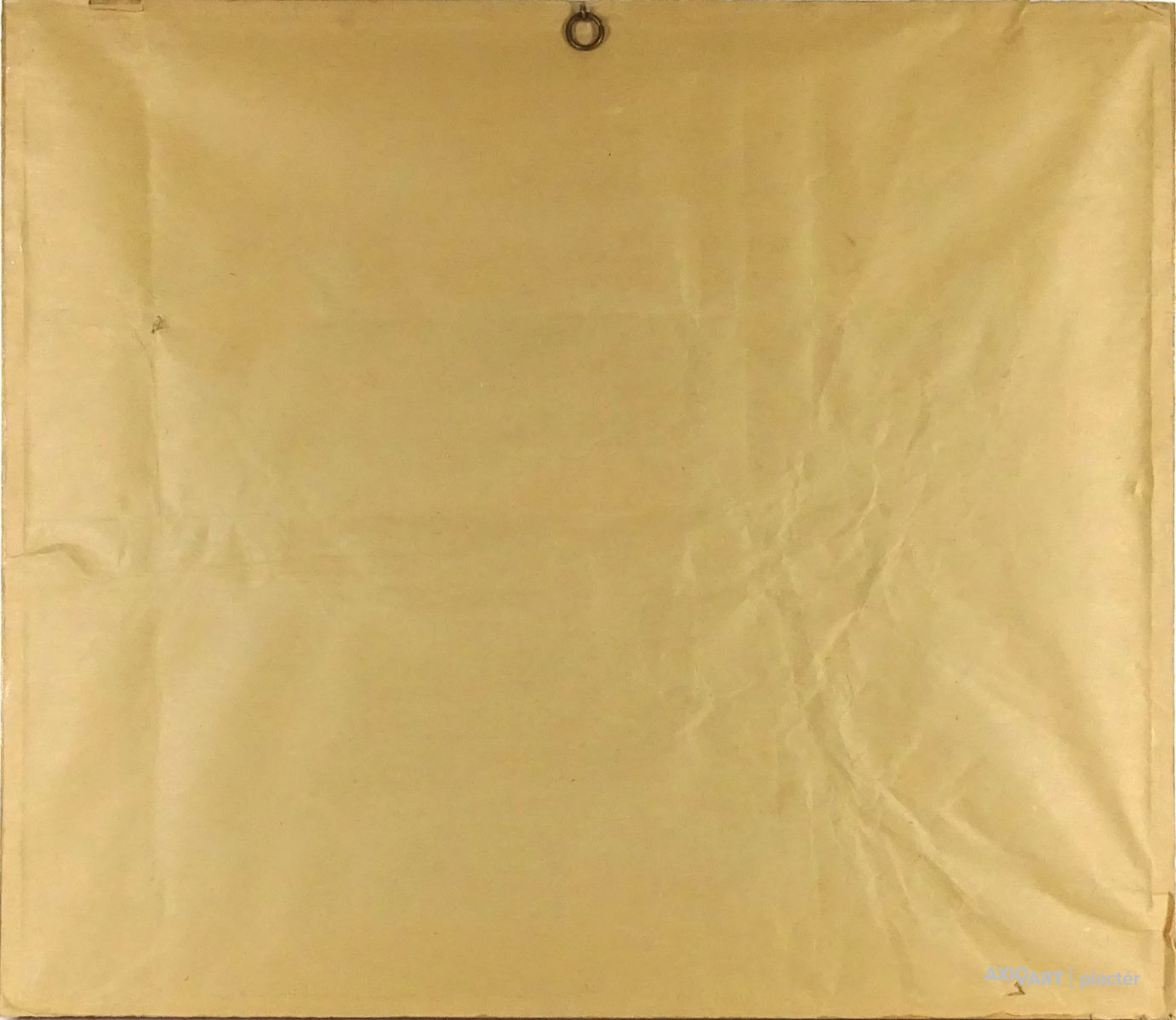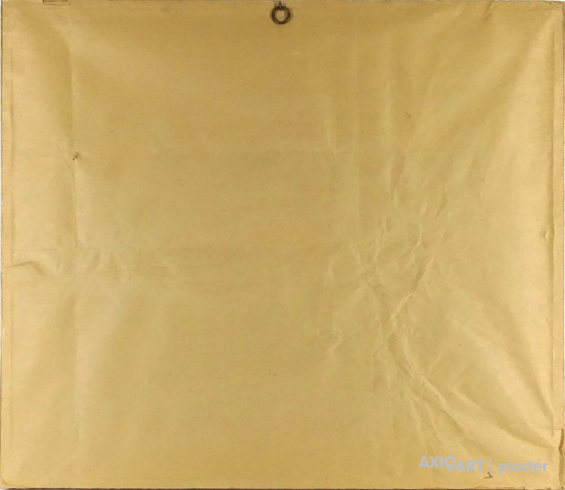 [1N254/043] Papír zsírkréta, tempera, akvarell vegyes technika üveglap mögött, zsákvászon háttér előtt, egyszerű fenyőfa keretben. Akasztási lehetőséggel rendelkezik. Jelzés jobbra lent, lásd fotó. Magasság: 45.5 cm Szélesség: 52.5 cm Súly: 1.91 kg