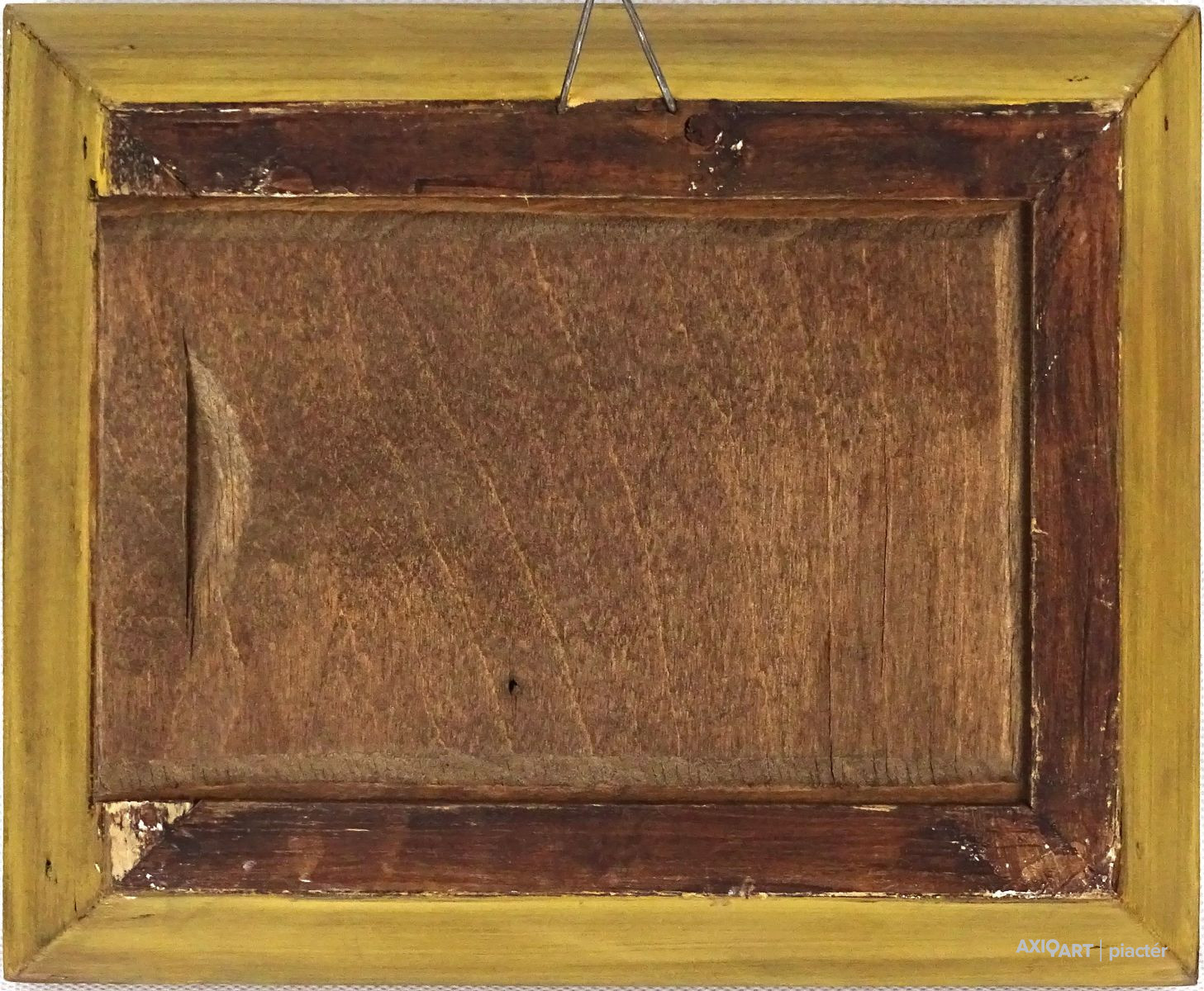[1M334/121] 25% ÁRENGEDMÉNY MINDEN TERMÉKÜNKRE Dec. 14-ig Olaj rézlemez festmény hibátlan állapotú aranyozott ökörszemes keretben. Akasztási lehetőséggel rendelkezik. Azonnal ajándékba adható állapotban van. Hátoldalán, eltolható fa hátlap mögött felirat: LAJOS BÁTYÁMNAK 70. SZÜLETÉSNAPJÁRA OTTÓ Magasság: 18 cm Szélesség: 22 cm Súly: 0.475 kg