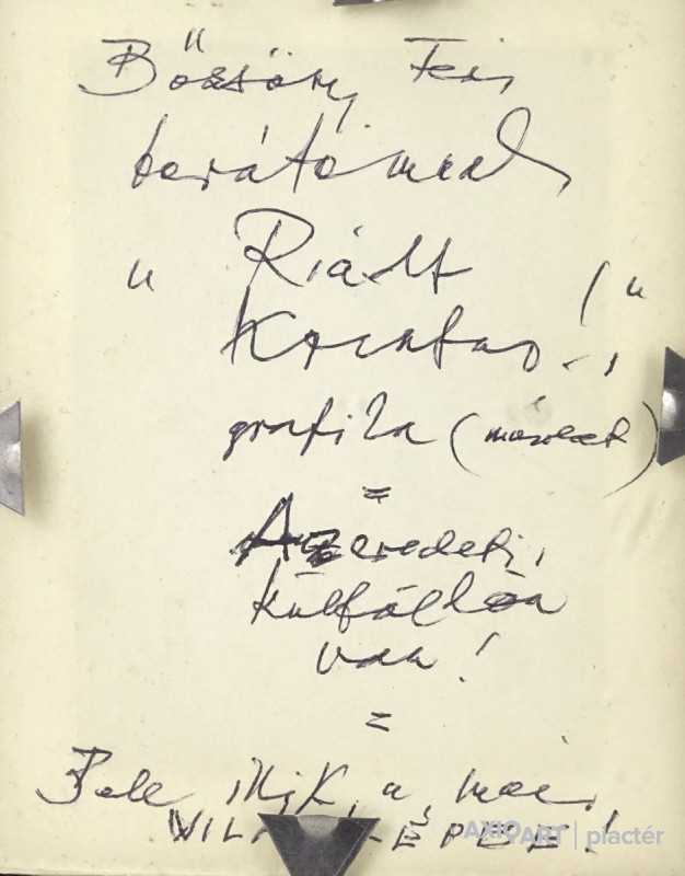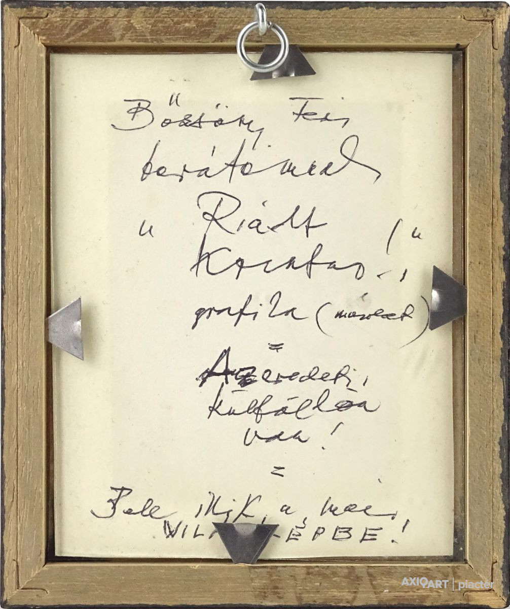 [1Y034/Z018] Olaj vászon festmény, üveglap mögött, szép állapotú képcsarnokos keretben. Akasztási lehetőséggel rendelkezik. Jelezve jobbra lent: Balog A. Hátoldalán a kereten Képcsarnok Vállalat címke töredék látható, rajta felirat: A művészeti alkotás címe: LEÁNY Magasság: 86 cm Szélesség: 66 cm Súly: 5.37 kg Balogh András (képei szignóján az 1960-as évektől Balog) (Budapest, 1919. március 14. — Budapest, 1992. március 18.) festőművész, kerttervező, művészeti szakíró, c. egyetemi tanár. Életpályája és munkássága Apai ágon a géresi Baloghok Szatmár megyéből a dél-erdélyi Alsó-Fehér megyébe származtak, anyai fölmenői a Székelyföldön: Csíkban, ill. Háromszéken éltek. Szülei az 1900-as évek elején költöztek Budapestre. A Képzőművészeti Főiskolán 1937-ben kezdte meg tanulmányait Burghardt Rezső tanítványaként. 1950-töl 1980-ig a Kertészeti Főiskolán (később Kertészeti Egyetem) tanított a kerttervezési tanszéken művészettörténetet, szabadkézi rajzot, ábrázoló geometriát és kertesztétikát. Az Iparművészeti Főiskolán óraadóként kertesztétikát adott elő. 1971-ben részt vett a firenzei Palazzo Strozziban rendezett biennálén, ahol aranyéremmel tüntették ki. Rendszeres önálló és csoportos kiállítások sora következett ezután nemcsak Magyarországon, hanem Olaszország és Németország számtalan városában, kiállított Finnországban, Kanadában is. Egyéni kiállításai gyakran katalógusokkal jelentek meg.[1][2][3] Nyaranként Tihanyban vagy Zsennyén alkotott. Festészetét poétikus realizmus jellemzi, dekoratív elrendezésű kompozíciói és lágy színvilága bensőséges hangulatot, szépséget, harmóniát árasztanak. (Lány egyszarvúval; Alvó, Emberpár és táj, stb.) Nagyon sok tájképet és portrét festett, történelmi személyiségekről is, 1978 és 1989 közt megfestette Mindszenty József bíboros portréját. Képei a Magyar Nemzeti Galériában, vidéki múzeumainkban, olasz, német, finn, észak-amerikai, kanadai, ausztráliai gyűjteményekben vannak.