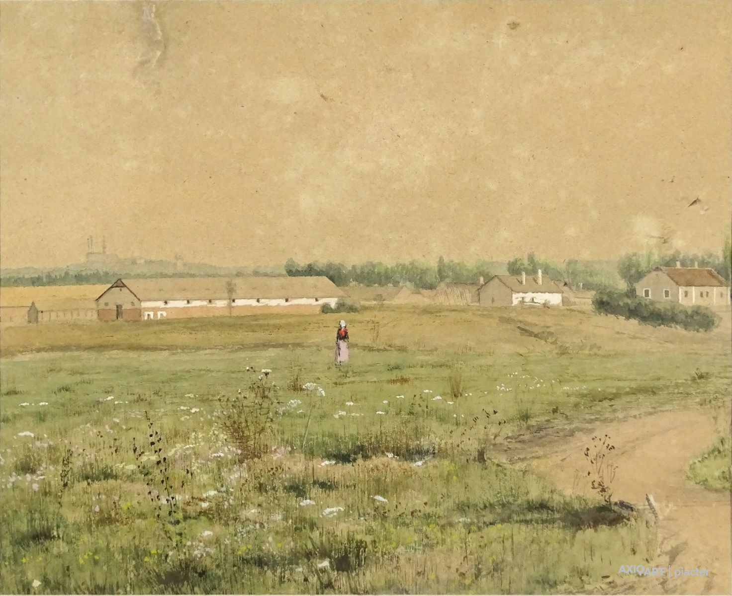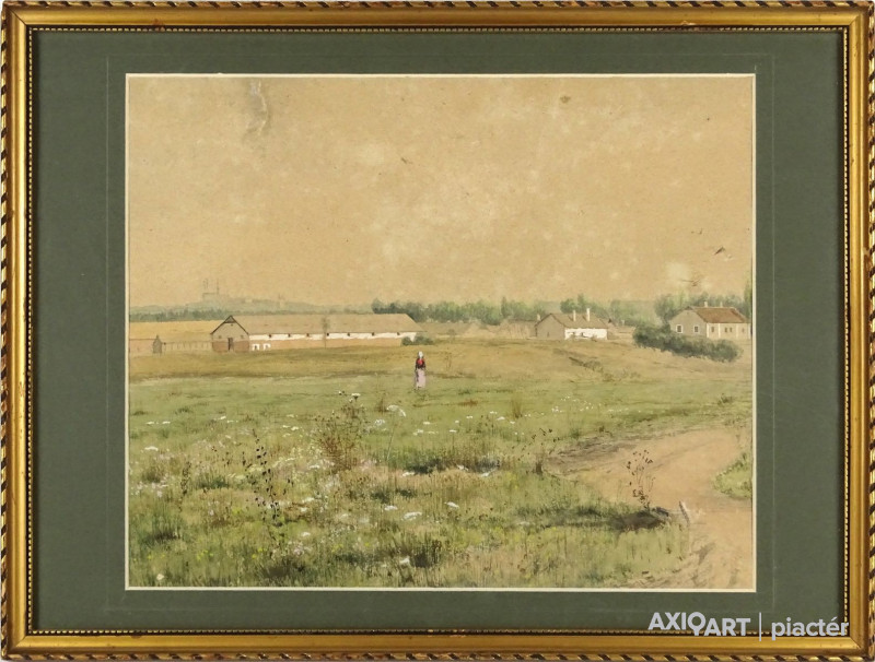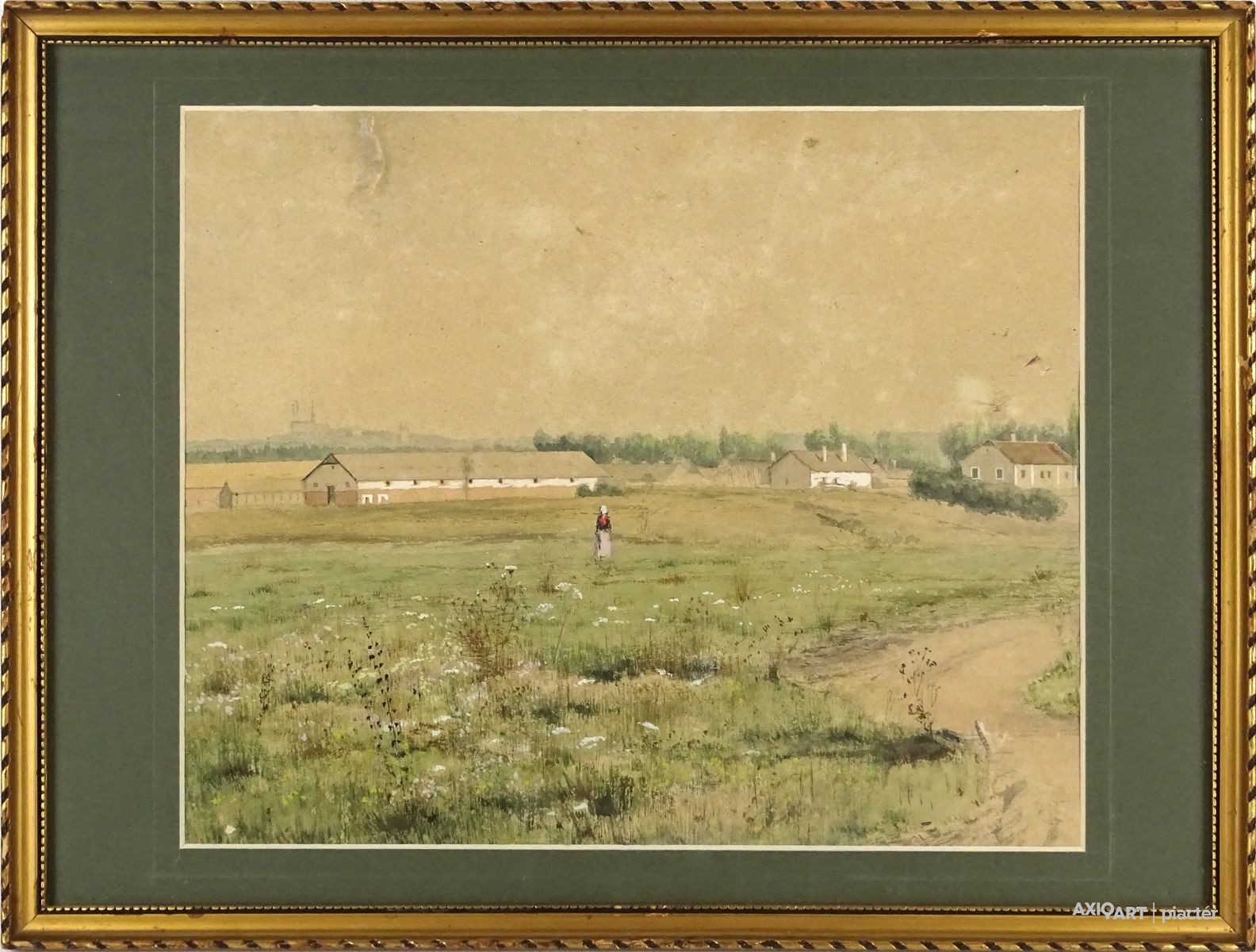 Papír akvarell üveglap mögött, zöld paszpartuban, régi aranyozott keretben. Akasztási lehetőséggel rendelkezik.