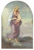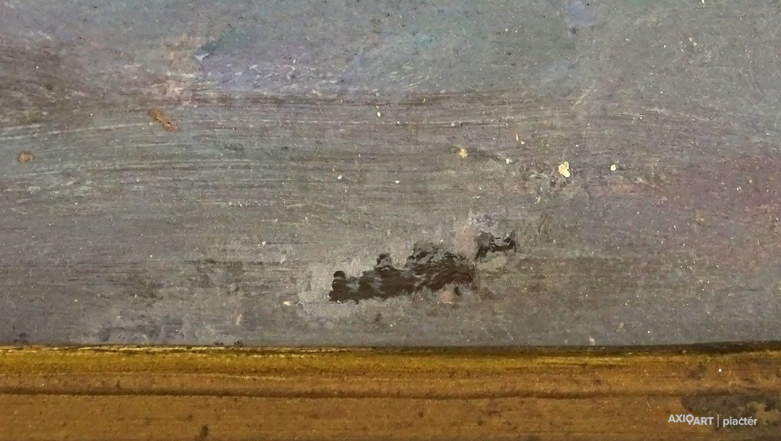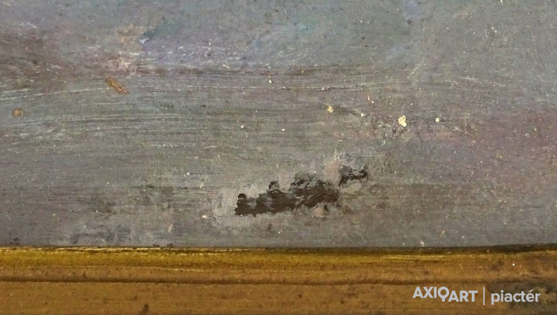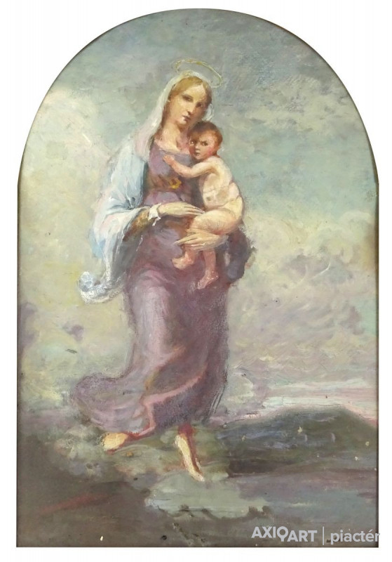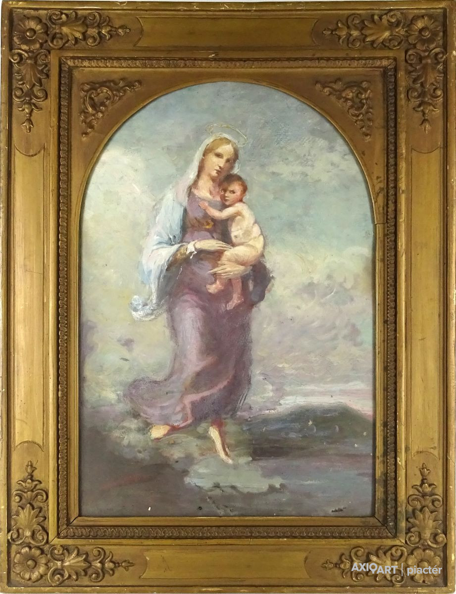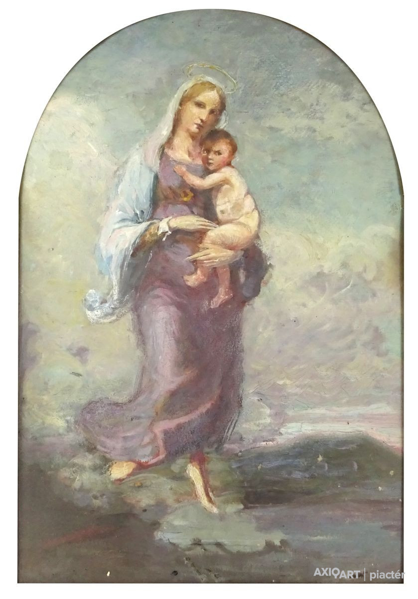 Olaj karton festmény, kis méretű oltárkép eredeti aranyozott keretében, üveglap mögött. Akasztási lehetőséggel rendelkezik.