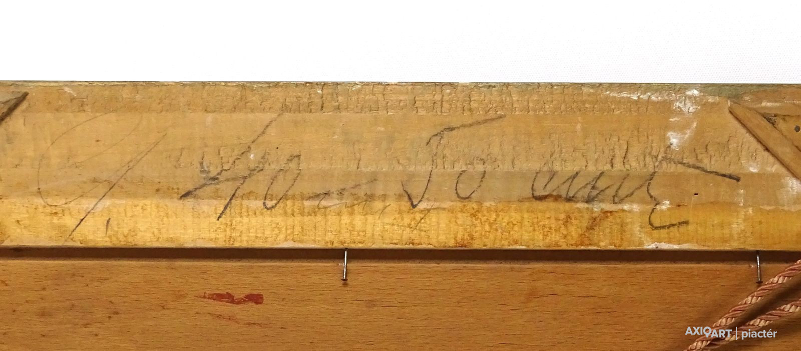 [FK0037/Z018] A kép mérete: 50 x 70 cm keret nélkül. Készült: Olaj, Vászon A kép Paizs László (Szentpéterúr, 1935) alkotása. Jelezve Jobbra lent "P. L." A festmény jó állapotban van. Keret: Ép A festmény hátoldalán a Képcsarnokvállalat címkéje található. Magyar festők és grafikusok életrajzi lexikona I-II. Festő. Tanulmányait a budapesti Iparművészeti Főiskolán végezte 1959-ben. Z. Gács György, Rákosy Zoltán és Szentiványi Lajos növendéke volt. A '60-as évek első felében hagyományosabb felfogású olajképeket festett, mozaikokat, freskókat, utóbb a pop-art körébe tartozó, a francia Arman munkáival rokon műveket alkotott. 1961 óta kiállító művész. Egyéni (Fényes Adolf Terem, Csók Galéria, Műcsarnok, Magyar Nemzeti Galéria, Halászbástya, Bástya Galéria, Vigadó Galéria, Budapest Galéria, Győr, Szombathely, Szeged, Zalaegerszeg, Duisburg, Aix-en-Provence, stb). és vegyes (Ernst Múzeum, Műcsarnok, Óbuda Galéria, Magyar Nemzeti Galéria, Csók Galéria, Vigadó Galéria, Székesfehérvár, Kaposvár, Pécs, Hódmezővásárhely, Firenze, Milano, Padova, Nápoly, Velence, Düsseldorf, Aachen, Genf, stb) tárlatokon vett részt. 1980-ban Munkácsy-díjjal jutalmazták, 1988-ban Érdemes Művész kitüntető elismerésben részesült. Munkáit őrzi a Magyar Nemzeti Galéria, a Fővárosi Képtár, a szombathelyi képtár, a pécsi Janus P. Múzeum, a székesfehérvári István Király Múzeum és a dunaszerdahelyi Kortárs Magyar Galéria. (H.B.: Műv, 1972/4, K.Gy.: Műv. 1977/2, K.G.: Műv. 1978/10, M.L.: Műv, 1983/5, R.G.: Műv, 1987/9, Sz.Gy.: Új Műv. 1995/4, MK) Magyar festők és grafikusok életrajzi lexikona I-II. Műgyűjtők és kereskedők kézikönyve Festő. Tanulmányait a bp.-i Iparművészeti Főiskolán végezte. Mozaikokat ferskókat, utóbb a pop-art körébe tartozó, a francia Arman műveivel rokon műveket alkotott. Mozaikok: a Szegedi Megyei Tanács, a Pécsi Óvoda, a Gödöllői Agrártudományi Egyetem. Freskók: Budapest - Csatárka úti Gyermekotthon. 1971-ben a Fényes Adolf Teremben volt kiállítása, 1983-ban pedig a szegedi Móra Ferenc Múzeumban nagyszabású tárlatokon mutatta be munkáit. 1988-ban érdemes művész kitüntető elismerésben részesült. (MK) Magyar festők és grafikusok adattára Az Iparművészeti Főiskolán végzett 1959-ben. Mozaikokat (Szeged, Megyei Tanács; Pécs, Óvoda; Gödöllő, Agrártudományi Egyetem), freskókat (Budapest, Csatárka úti Gyermekotthon), újabban a pop art körébe tartozó, a francia Arman műveivel rokon műveket alkotott. 1971-ben a Fényes Adolf Teremben nyílt kiállítása. 1983 februárjában a szegedi Móra Ferenc Múzeumban megrendezett nagyszabású tárlaton mutatta be alkotásait. 1988-ban érdemes művész kitüntető elismerésben részesült. - MK Művészeti lexikon I-IV. (Szentpéterur, 1935. dec. 26.- ): festő. Az Iparművészeti Főiskolán 1959-ben végzett Rákosy Zoltán, Z. Gách György és Szentiványi Lajos növendékeként. Épületdiszítő mozaikokat, (Szeged, Megyei Tanács, 1961; Pécs, Óvoda, 1964), műanyagfreskókat (Bp., Csatárka úti Gyermekotthon, 1964) és gobelinterveket készít. Kortárs magyar művészeti lexikon I-III. Festő, szobrász, grafikus. 1959: MIF, mesterei: Z. Gács György, Rákosy Zoltán, Szentiványi Lajos. 1980: Munkácsy-díj; 1988: érdemes művész. Főiskolás éveinek második felében, majd azt követően számos murális munka kivitelezésében vett részt, Fónyi Géza, Konecsni György, Z. Gács György, Rákosi Zoltán és Domanovszky Endre mellett dolgozva. A 60-as évek első felének hagyományosabb fölfogású olajképeket festett. 1964-ben a Velencei B.-n megismerkedett az amerikai pavilonban a pop art Európában akkor még újnak számító törekvésével, és részben ez inspirálta, hogy 1967-ben textil, fém, bőr anyagú "varrottas" képeket küldjön az FKS éves tárlatára; a megnyitó előtt többek között az ő munkáit is eltávolították a falról. A 70-es években pop art-os objekteket (A trónörököspár politikai gyilkosság áldozata lett, 1970, plexiüveg, újság, szarvasbogarak), majd konstruktív, átlátszó plexiüveg plasztikákat készített belső fénytörő határfelületekkel. A 80-as években készültek az anyagában színezett, konstruktív, nagyméretű poliészter szobrai, majd színes poliészter táblaképeket alkotott, mesterségesen roncsolt felületekkel, mintha régészeti leletek vagy atomtámadás utáni festmény-szurrogátumok lennének. Ekkor kezdett organikus plaszikájú bronzszobrokat is mintázni. A 90-es években, a táblaképek és szobrok mellett nagyméretű, egyedi grafikákat készített, formavilágában némileg a roncsolt táblaképekből kiindulva, de szinte kizárólag az emberi alakból elvonatkoztatott torzókat megjelenítve. Ek: 1966: Művészklub, Győr; 1971: Fényes A. T.; 1972: Bercsényi 28-30 G.; 1973: BME B-épület; 1976: Csók G.; 1977: G. Hildebrandt, Duisburg (NSZK); 1979: Bástya G., Halászbástya; Helyőrségi Műv. H., Nagyatád; József A. Műv. Közp., Szeged; Göcsej M., Zalaegerszeg; 1982: Bezzegh G., Küsnacht (CH); 1983: Móra F. M., Szeged; 1987: Műcsarnok (kat.); MNG; 1988: Pandora G., Badacsonytomaj; 1989: Parktheatter, Iserlohn (NSZK); Qualitas G.; Hevesi S. Színház, Zalaegerszeg; 1990: Vasarely Fondation (Ferdinánd Judittal, Fóth Ernővel), Aix-en-Provence (FR); 1994: Vigadó G.; 1997: Pest Center G.; 1998: Budapest G. (kat.); 1999: Pest Center G. (kat); G. Arcis, Sárvár; MMA, Bp.; 2001: SZK, Szhely; Ernst M. (kat.) Vcsk: 1961, 1964, 1966: FKS, Ernst M.; 1962: 9. Magyar Képzőműv. kiállítás, Műcsarnok; 1967: Mai magyar festészet, Új-Delhi; 1969: Vas megyei művészek, Savaria M., Szhely; V. Orsz. Grafikai B., Miskolc; 1971: Új művek, Műcsarnok; 1972: Fiatal művészek Budapestről. Likovni Salon, Újvidék (YU); 1972, 1973: Balatonboglár