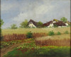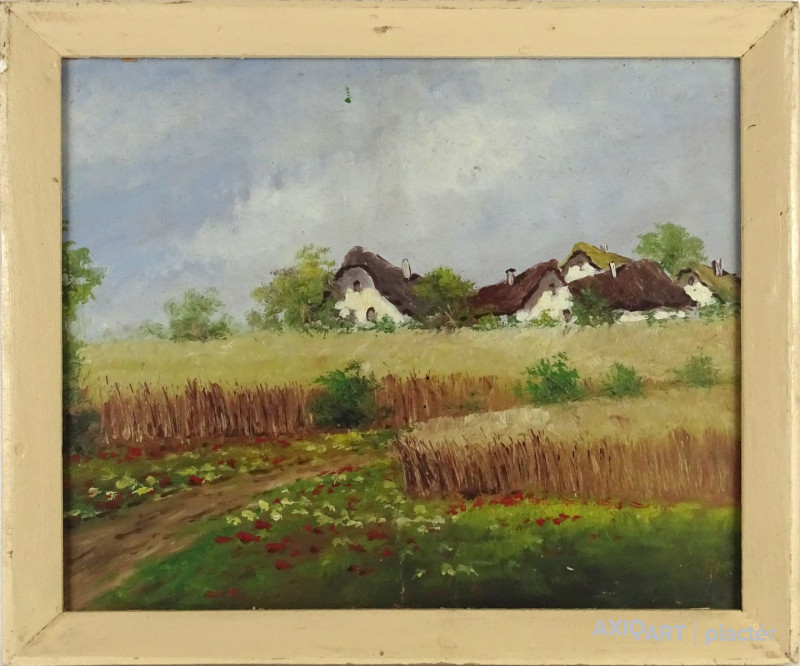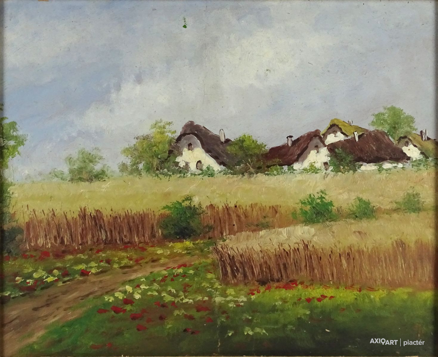 [1O094/026] 25% ÁRENGEDMÉNY MINDEN TERMÉKÜNKRE Dec. 14-ig Olaj karton festmény üveglap mögött, régi keretben. Akasztási lehetőséggel rendelkezik. Hátoldalán felirat: JÚNIUSI BÚZÁK Magasság: 27 cm Szélesség: 32.5 cm Súly: 0.605 kg