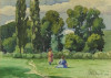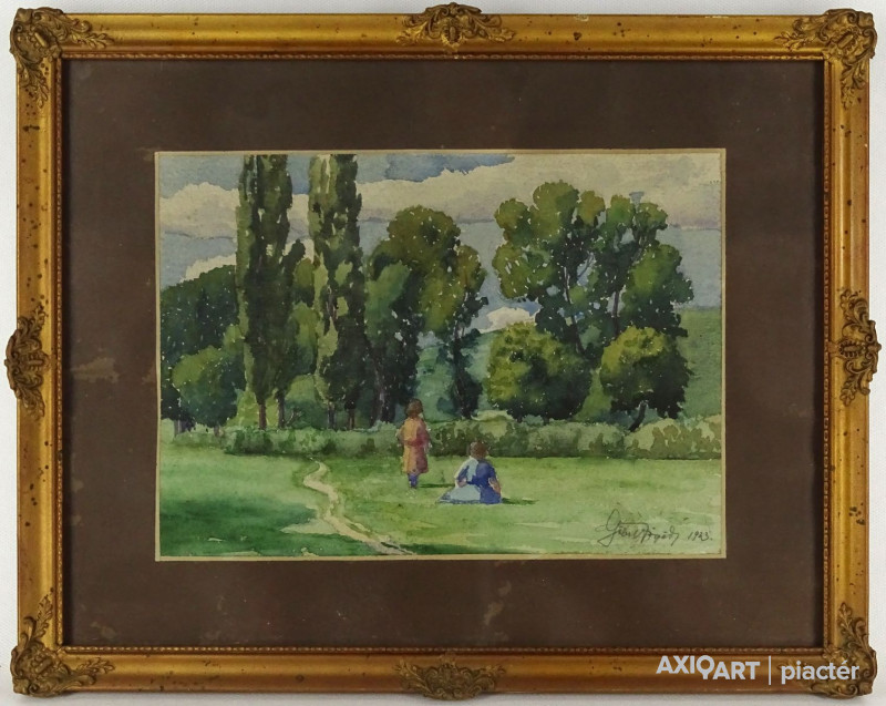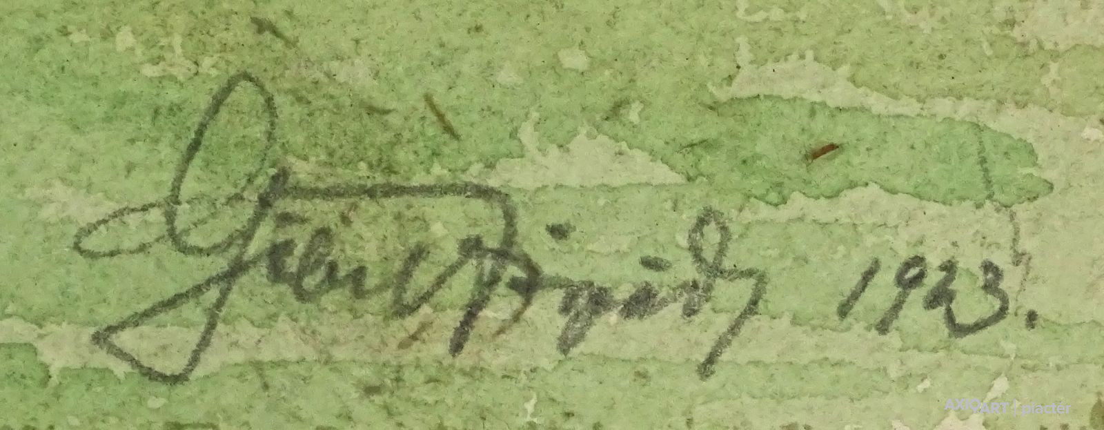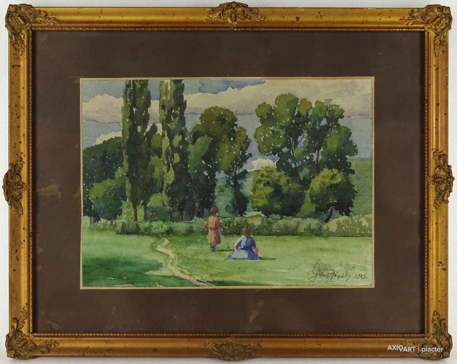 [1S176/094] Papír akvarell üveglap mögött, régi aranyozott Blondel keretben. Akasztási lehetőséggel rendelkezik. Datált jelzés jobbra lent, lásd fotó: ... 1923 Magasság: 31 cm Szélesség: 39 cm Súly: 0.755 kg