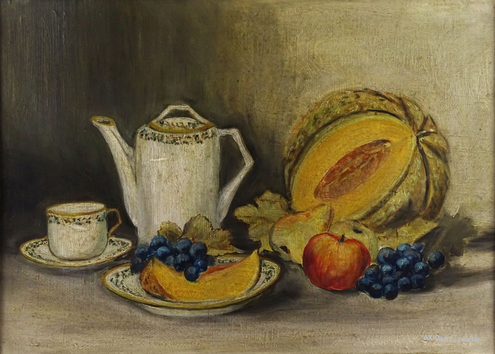 [1T604/144] Olaj karton festmény, régi aranyozott keretben. Akasztási lehetőséggel rendelkezik. Asztali csendélet gyümölcsökkel, teáskészlettel. Magasság: 46 cm Szélesség: 61.5 cm Súly: 2.05 kg