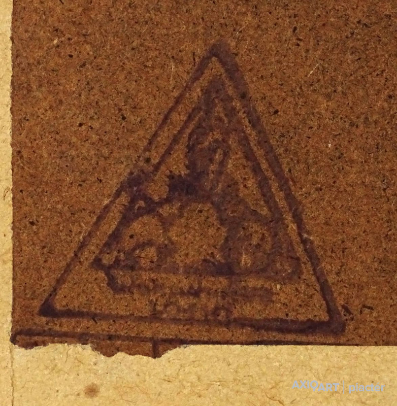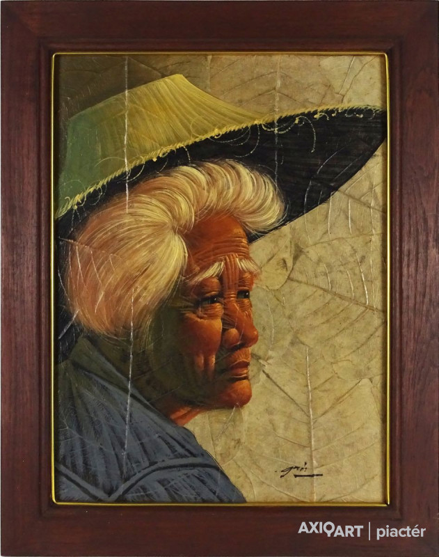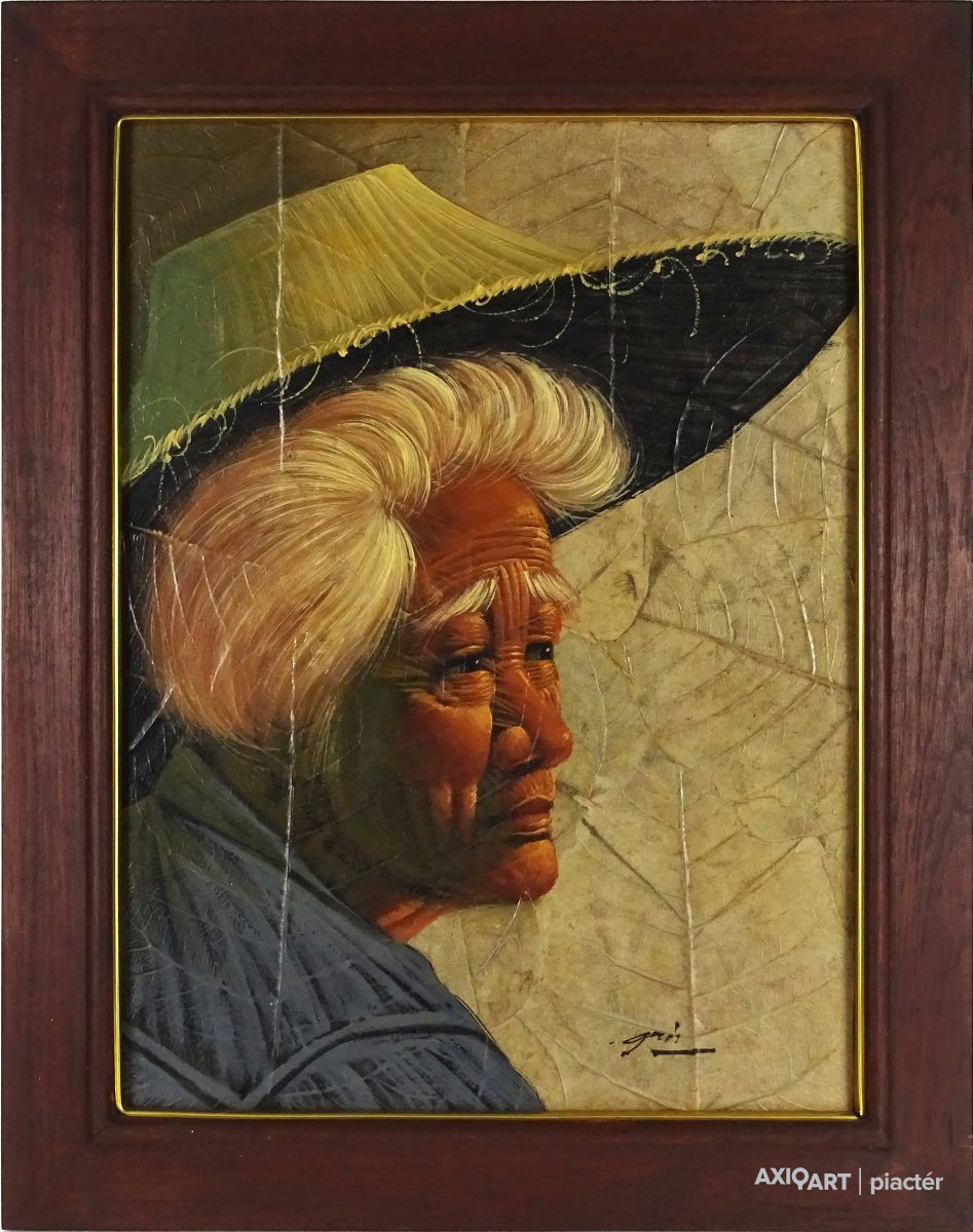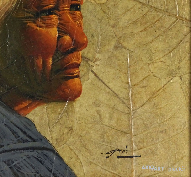 [1M474/027] Olaj farost festmény barna keretben. A festék alatt a hordozó felületen nagy méretű valódi falevelek találhatók, ezzel különleges alapot és struktúrát adva a képnek. Akasztási lehetőséggel rendelkezik. Jelzés jobbra lent, lásd fotó. Magasság: 49 cm Szélesség: 39 cm Súly: 0.925 kg