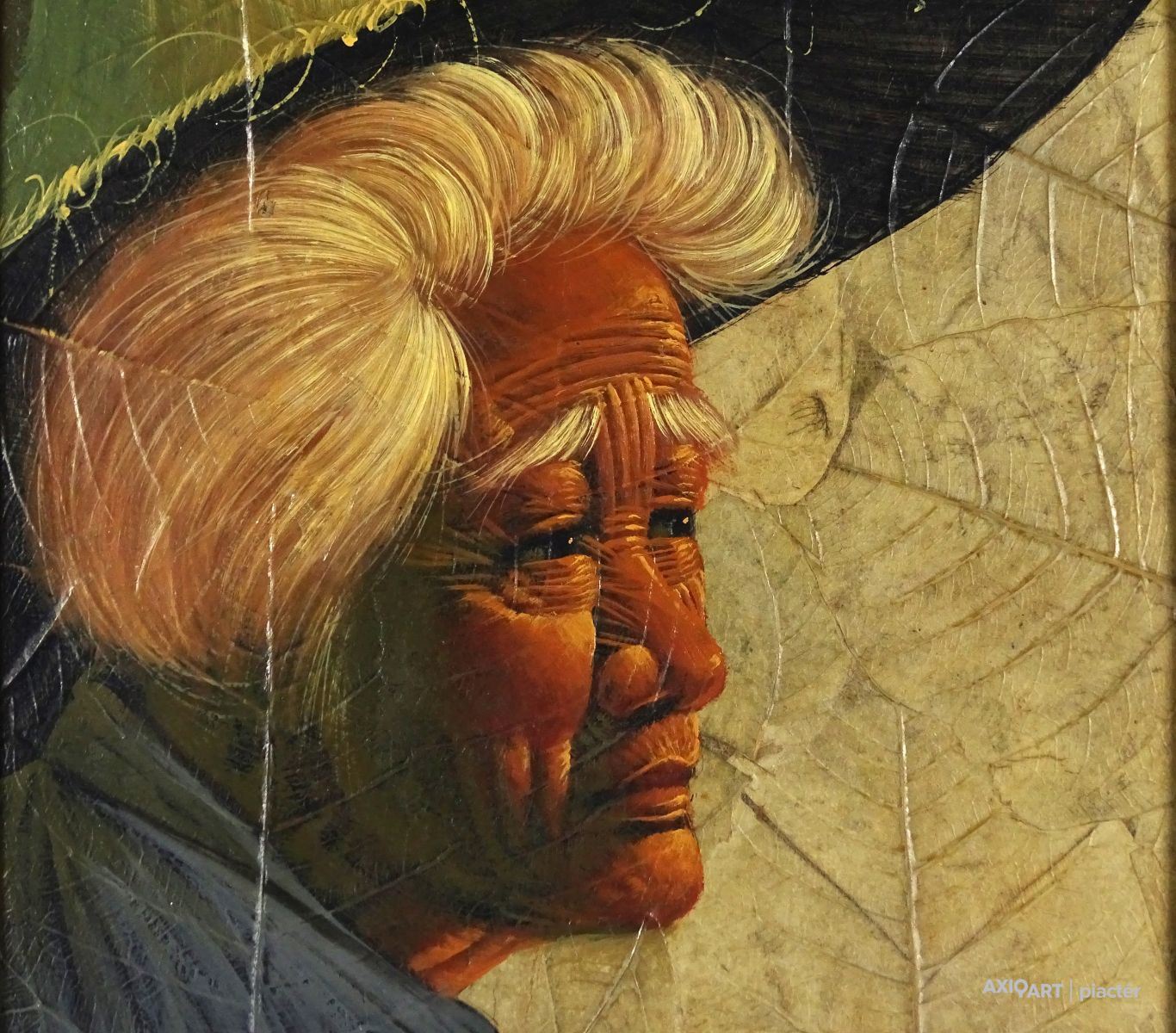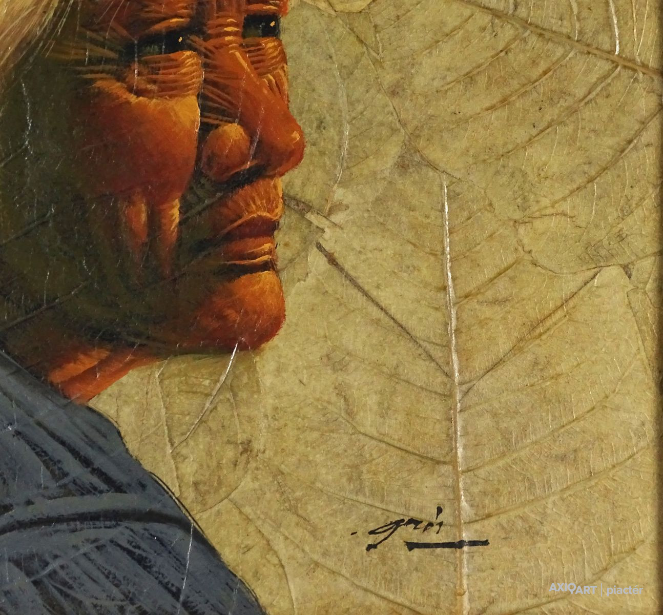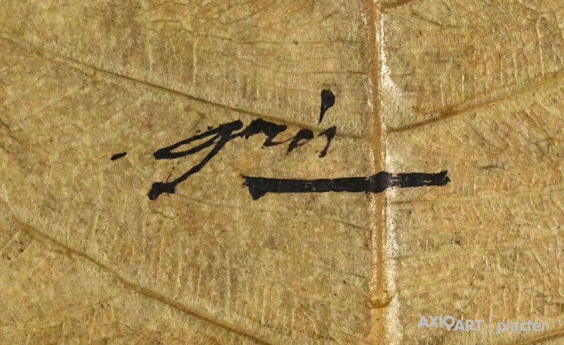 Olaj farost festmény barna keretben. A festék alatt a hordozó felületen nagy méretű valódi falevelek találhatók, ezzel különleges alapot és struktúrát adva a képnek. Akasztási lehetőséggel rendelkezik.