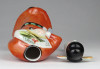 [1J507/BX-2] Régi, hibátlan állapotú kézzel festett keleti porcelán figura. Népviseletes kínai férfi, kezében pagoda díszes legyező. Feje kivehető, oldal irányba bólogat. Magasság: 12.5 cm Szélesség: 7 cm Súly: 0.16 kg