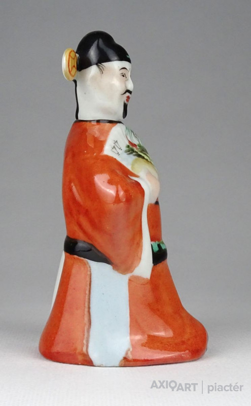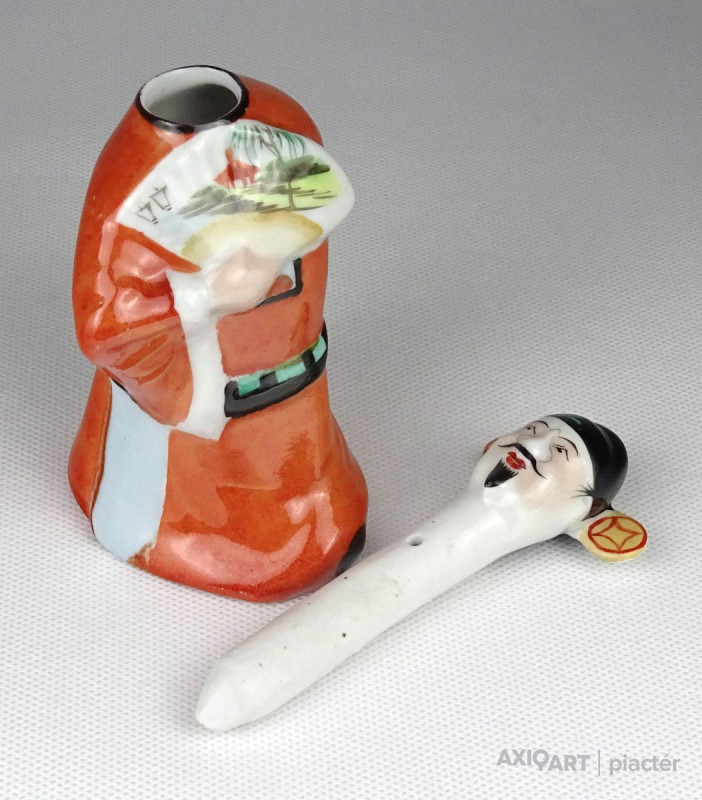 Régi, hibátlan állapotú kézzel festett keleti porcelán figura. Népviseletes kínai férfi, kezében pagoda díszes legyező. Feje kivehető, oldal irányba bólogat.