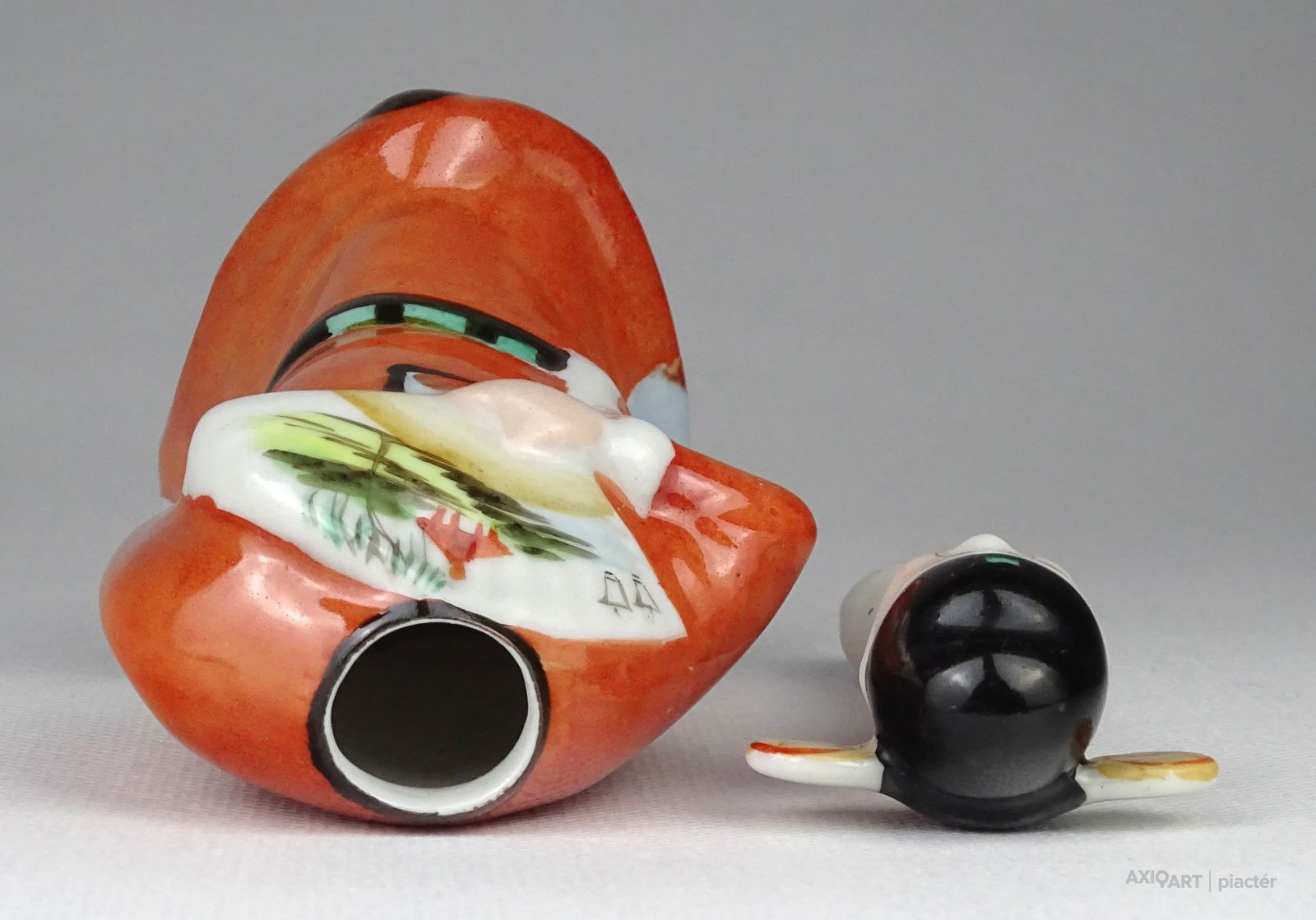 [1N579/X225] Hibátlan állapotú, jelzett porcelán figura. Ülő, galambot etető nő figura. Alján zöld Kőbányai Porcelángyár márkajelzés és felirat: KP KÉZIFESTÉS Kézifestés monogramja: ZM (Z.M.) Magasság: 12.7 cm Szélesség: 18.5 cm Súly: 0.305 kg Egy kis történelem Kőbányai Porcelángyár a hatvanas években, fekete-fehér képekből összeállítva, színezve; Fotó: ismeretlen   Az ős gyár Alois Miesbach X. Külső Jászberényi út 41. téglagyárának kibővítése révén jött létre. A termelés 1846.-ban indult meg és 1908.-ig kizárólag tégla, tetőcserép és keramit útburkoló kockákat gyártottak. A társulat a fajansz- és porcelángyárat 1908.-ban hozta létre. A termelés főként falburkoló áruk, műszaki és egészségügyi porcelánok készítésével folyt. A díszmű gyártás, bár erről pontos adatok nem állnak rendelkezésre, a húszas évek elejéig tarthatott és 1936.-ig a Porcelángyár újraindításáig megint csak ipari és egészségügyi árut termelt. 1936.-tól ismét beindult a díszműgyártás. A gyárat 1941.-ben hadiüzemmé nyilvánították, majd 1944.-ben súlyos bombatalálat érte. A termelés a szovjet parancsnokság alatt 1945.-ben indult be újra. 1949.-ben a Kőszénbánya és Téglagyár Társulat Pesten (azelőtt Drasche) államosításakor három téglagyárra, egy tűzállógyárra és a Drasche Porcelángyár Nemzeti Vállalatra osztották.   A gyár profilja műszaki porcelán, edény és díszműporcelán lett. 1949. május 31-től a Nagybátony-Újlaki Téglagyár telepén működött elektrokerámiai üzemet átadták a Porcelángyárnak. Ezzel egy időben megkezdődött Kőbányán a szteatit szigetelők és pirolit nevü hőtechnikai szigetelők gyártása is. Az elektrokerámiai (híradástechnikai) üzemet először a megszűnt edénygyár területére helyezték, később 1953 végén külön épületet kapott. Fotó: ismeretlen, 1975, a kémény mögött a magas Drasche lakóházon jól látszik a később épített felső szint, az utca felé a gyár épületén még csak a vörös csillag van, nincs ott a nagy "Finomkerámiaipari Művek", aminek a helyére a KŐPORC felirat került később. Fotó: archivum.mtva.hu, 1961, Liget utcai telephely 1950-51-ben új laboratórium épült a gyárban. A modern 5 szintes épületben az anyagvizsgáló kémiai laboratóriumon kívül itt kapott helyet a híradástechnikai fejlesztés-, és vizsgálólabor, valamint új nagyfeszültségű vizsgálólabor is. A gyárban a termelést gyáregységekbe szervezték. Így alakult ki a porcelán, a híradástechnikai és gépészeti gyáregység. A gépészeti gyáregységben a folyamatos karbantartási munkák mellett jelentős helyet foglalt el a gépfejlesztés, azaz új célgépek és kemencék tervezése és kivitelezése. A híradástechnikai gyáregység részére terveztek és készítettek számos speciális gyártó és szerelő gépet, automatákat. Fotó: ismeretlen, a massza üzem eleje Fotó: ismeretlen, a mai Porcelán utca a 70-es években 1951 Kőbányai Porcelángyár lett a gyár neve. 1954-ben a megszűnt Solus Csiszolókoronggyár kőbányai Liget utcai telepét a gyárhoz csatolták, ahol sajtolt porcelánszerelési cikkeket, porcelán díszműárut, kordierit-, és pirolit hőtechnikai termékeket állítottak elő. 1969-ben a Budapesti Porcelángyár nógrádverőcei telepét a gyárhoz csatolták, ahol laboratóriumi porcelánokat gyártottak. A Liget utcai telepet 1969-ben átadták a Hollóházi Porcelángyárnak, ezzel megszűnt a díszmű gyártás. A festést végző dolgozókkal együtt a tervező csapat is a Hollóházi Porcelángyárhoz került. A széntüzelésű, szennyező kemencéket bezárták. Fotó: ismeretlen, 1976(?), főbejárat A híradástechnikai gyáregységben a kísérleti és kutatómunka alapján megkezdték a csőkondenzátorok gyártását. Ezek égetésére előbb egy periódikusan működő, gáztüzelésű (Pb-gáz), majd egy folyamatos üzemű gáztüzelésű, tolólapos kemencét építettek. 1957-ben megkezdték a trimmer kondenzátorok gyártását. Úgyszintén eredményesen végződtek a lágymágnes-ferrit termékek gyártására megindított kísérletek is és ferrit gyártó üzem létesült. Fotó: ismeretlen, 1982 előtt 1959-60-ban jelentős beruházások kezdődtek. Megkezdődött a porcelán gyáregység rekonstrukciója. Ennek keretében újjáépítették, ill. korszerűsítették a nyersanyagtárolót és a porcelánmassza üzemet. 1970-ben sajtolómassza előkészítésére porlasztószárítási (atomizer) technológiát vezettek be. Fotó: ismeretlen, 1976(?) A gyár 1960-ban új telephelyet létesített Balassagyarmaton, ahol saját tervezésű és készítésű célgépekkel kondenzátor termékeket gyártottak. A IV. ötéves terv keretében Debrecenben és Bernecebarátiban létesült híradástechnikai üzem. Fotó: Bognár József - KŐPORC 1836-1988, 1982(?)   1982 Átnevezik KŐPORC Elektronikai Alkatrész és Műszaki Kerámiagyártó Vállalat névre a gyárat. A kilencvenes évek felé az elektronika-technikai fejlődés annyira felgyorsult, hogy a hagyományos termékek folyamatosan kiszorultak a piacról. Ez és a KGST piac összeomlása azt eredményezte, hogy a gyár fokozatosan megszűntetni kényszerült először a vidéki telephelyeit, majd Budapesten is megszűnt a híradástechnikai termékek gyártása. A porcelánszigetelő gyártmányok iránt is csökkent a kereslet, ezért a porcelán gyáregység átszervezésére is sor került. Fotó: ismeretlen, 1982 előtt, még a FINOMKERÁMIAIPARI MŰVEK felirat látható 1990 Megkezdődött a privatizáció. A minisztériumi felügyelet átkerült az Állami Vagyonügynökséghez. Az új vevő a termelést leállította és nem is kívánta folytatni. Az értékes berendezések jelentős része tönkrement, a kemencéket lebontották, fejlesztési laboratóriu