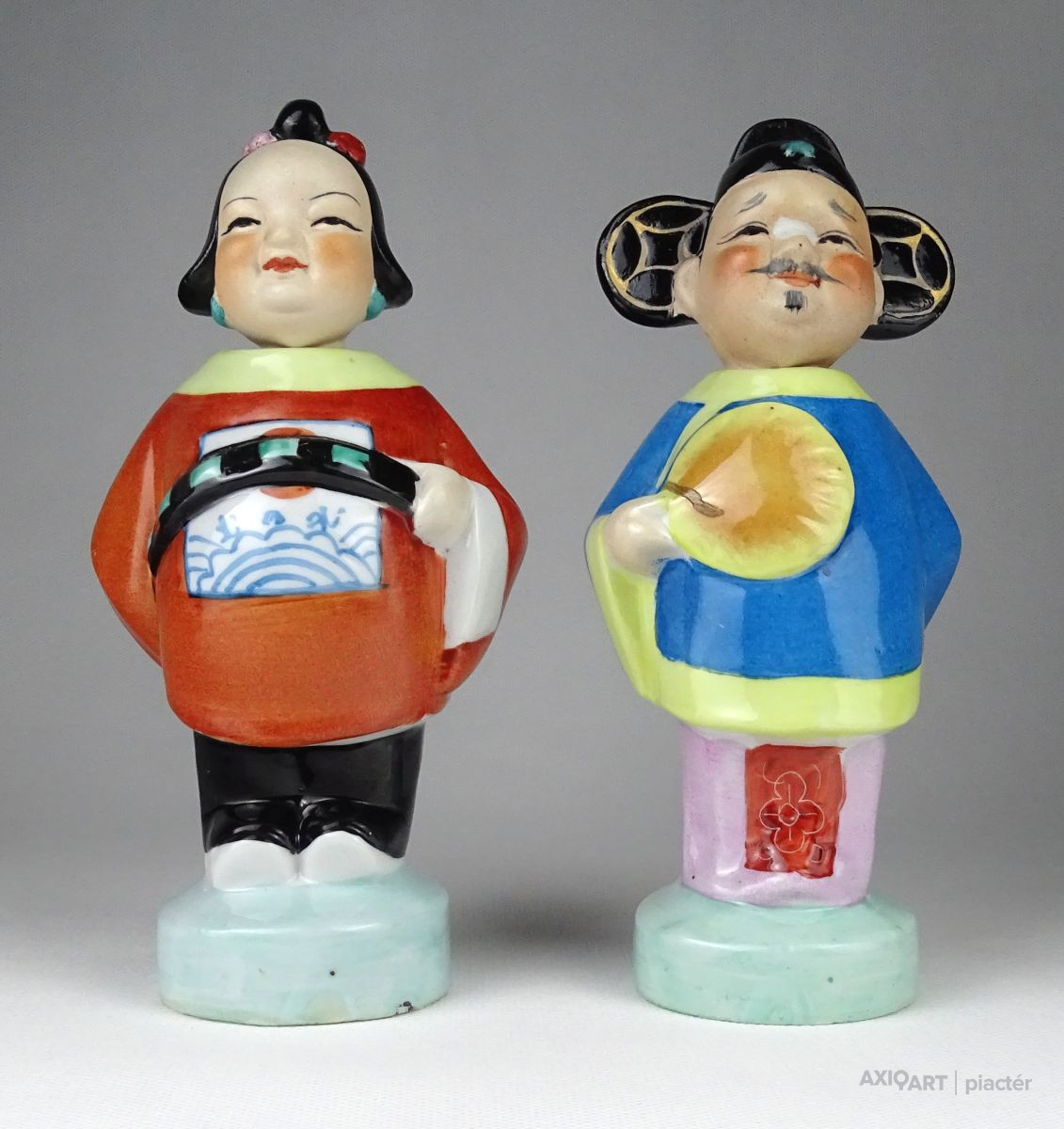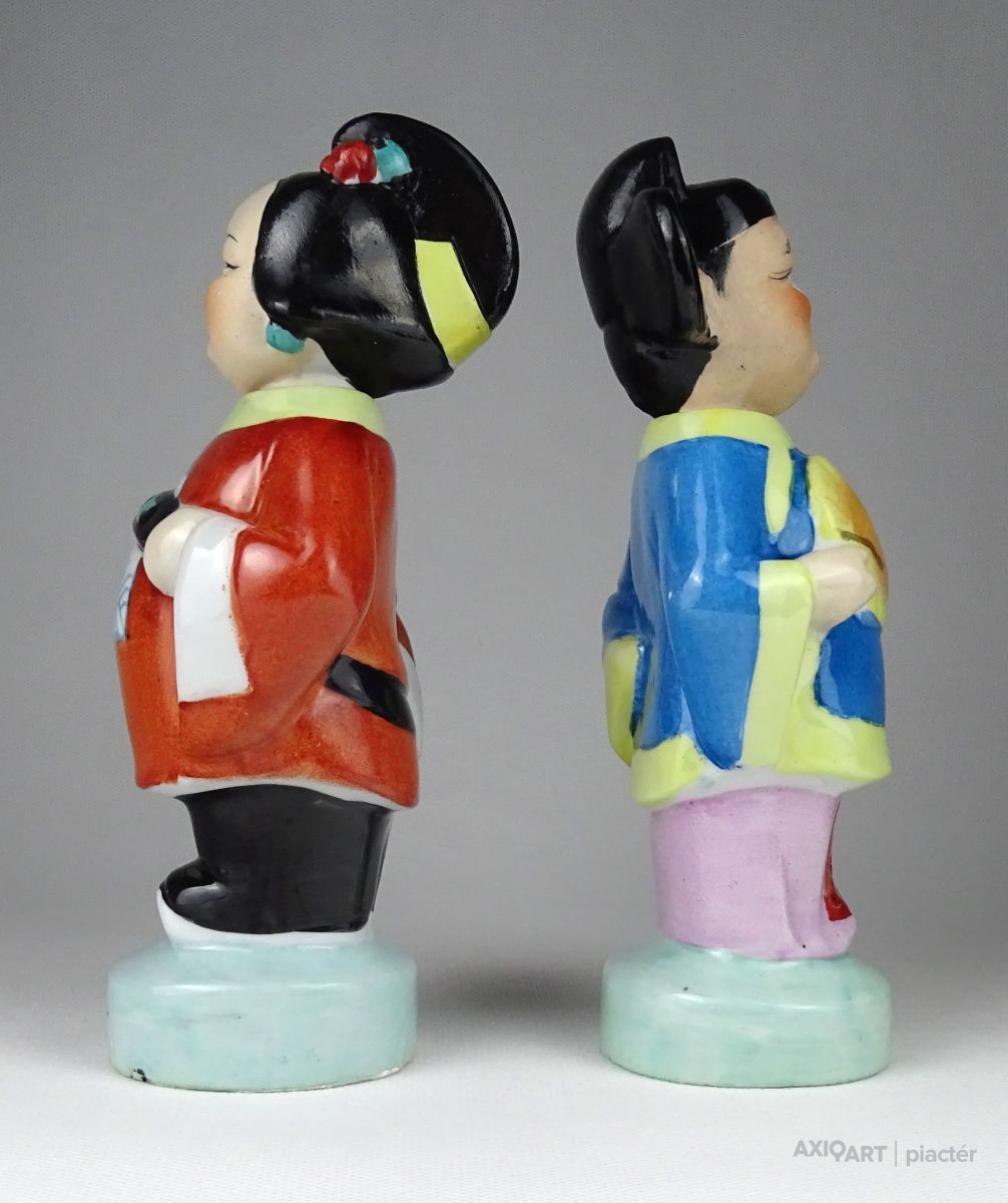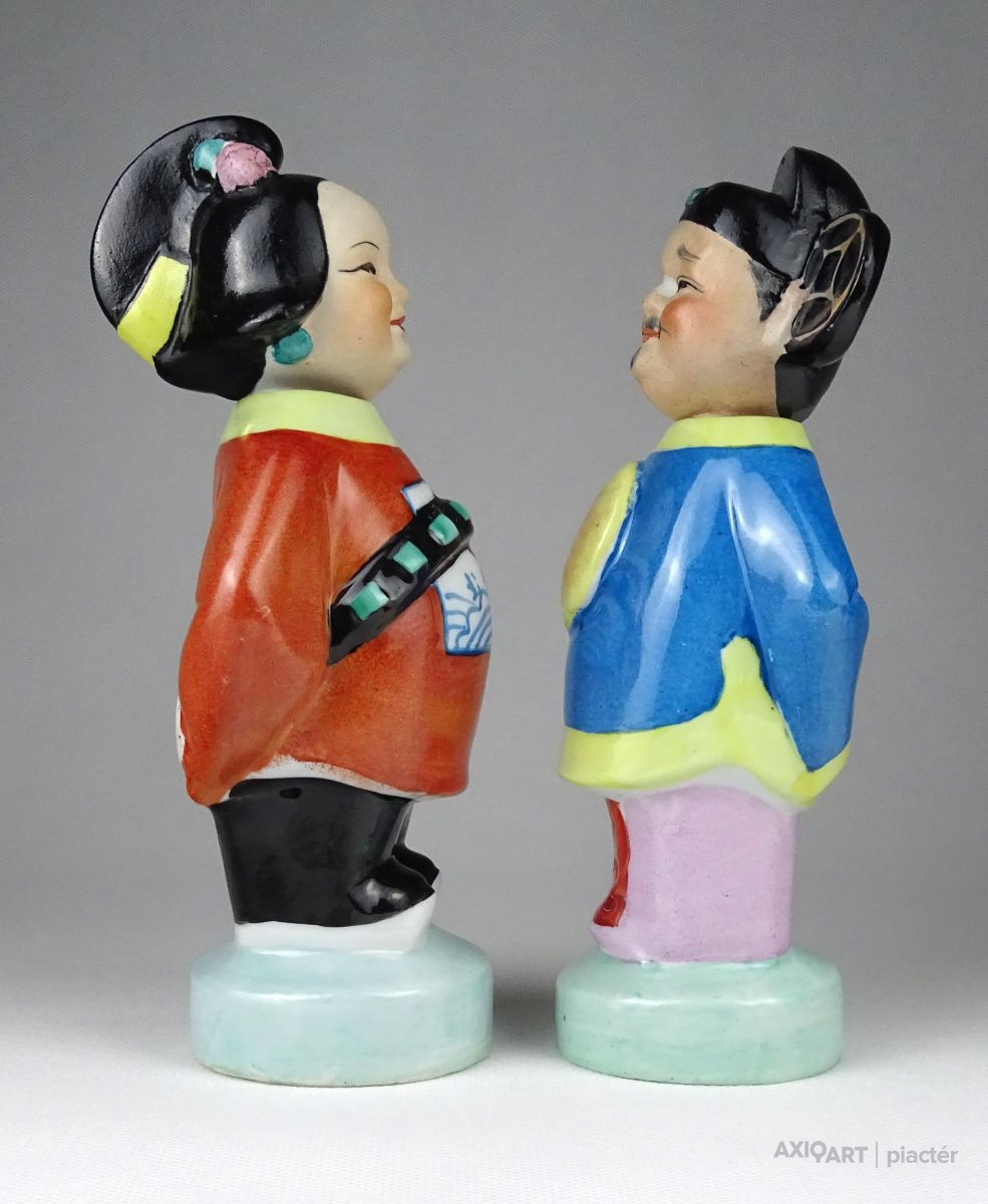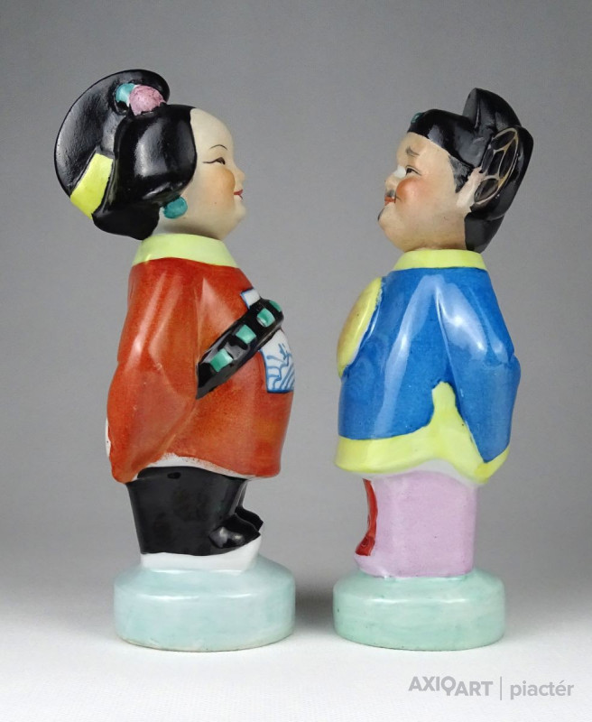 Régi, hibátlan állapotú kézzel festett keleti porcelán figura pár. Népviseletes kínai férfi és nő talapzaton. Fejük kivehető, oldal irányba bólogatnak.