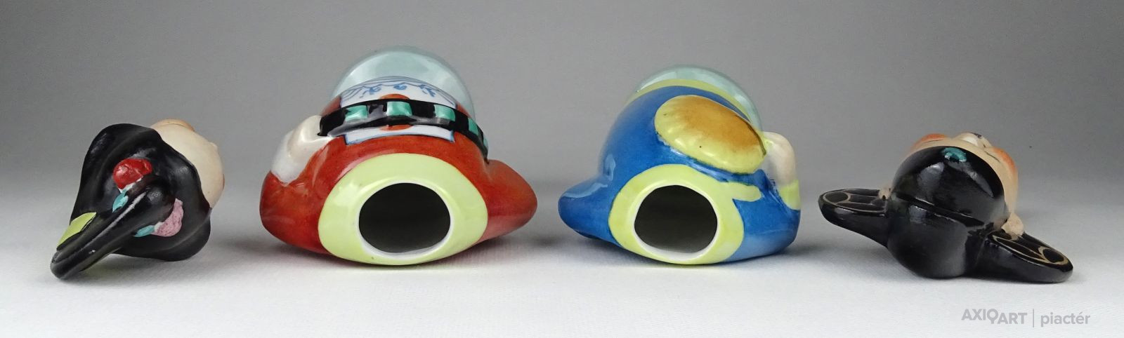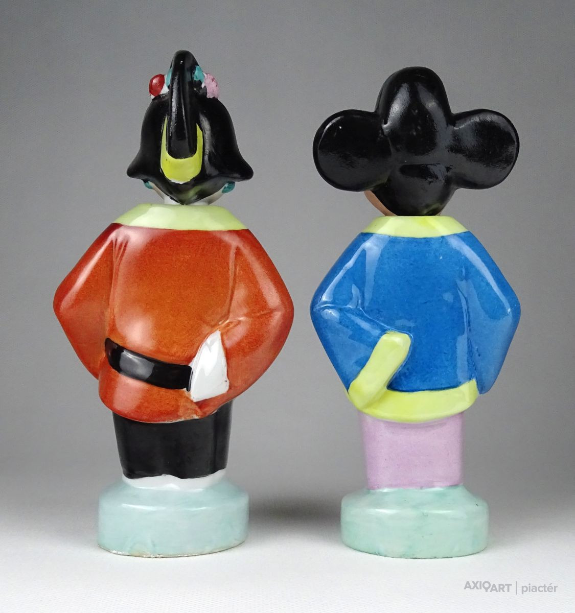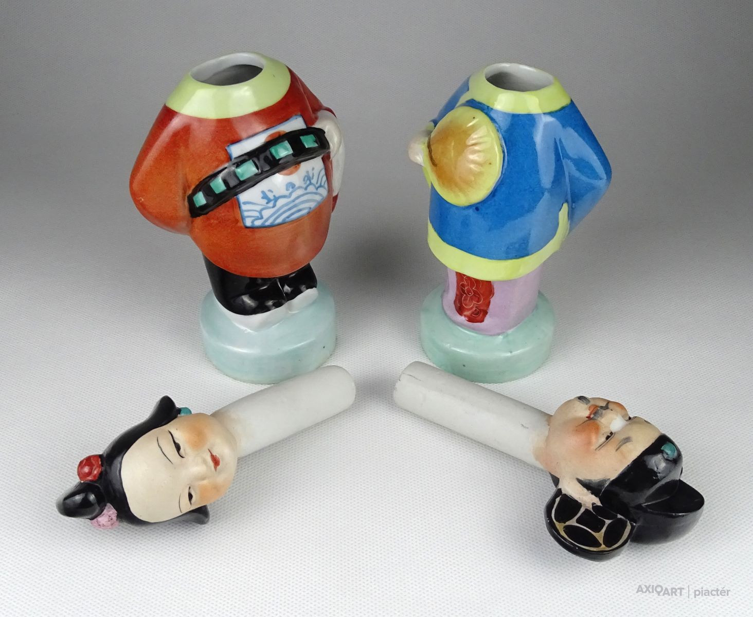Régi, hibátlan állapotú kézzel festett keleti porcelán figura pár. Népviseletes kínai férfi és nő talapzaton. Fejük kivehető, oldal irányba bólogatnak.