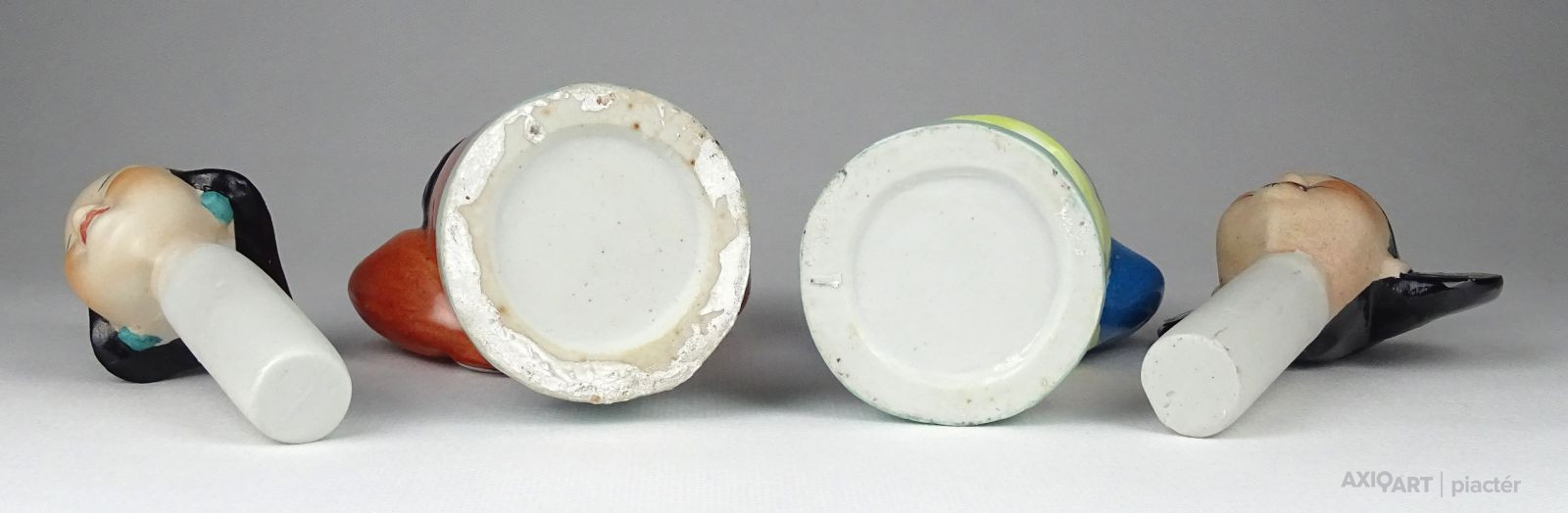 [1N579/X225] Hibátlan állapotú, jelzett porcelán figura. Ülő, galambot etető nő figura. Alján zöld Kőbányai Porcelángyár márkajelzés és felirat: KP KÉZIFESTÉS Kézifestés monogramja: ZM (Z.M.) Magasság: 12.7 cm Szélesség: 18.5 cm Súly: 0.305 kg Egy kis történelem Kőbányai Porcelángyár a hatvanas években, fekete-fehér képekből összeállítva, színezve; Fotó: ismeretlen   Az ős gyár Alois Miesbach X. Külső Jászberényi út 41. téglagyárának kibővítése révén jött létre. A termelés 1846.-ban indult meg és 1908.-ig kizárólag tégla, tetőcserép és keramit útburkoló kockákat gyártottak. A társulat a fajansz- és porcelángyárat 1908.-ban hozta létre. A termelés főként falburkoló áruk, műszaki és egészségügyi porcelánok készítésével folyt. A díszmű gyártás, bár erről pontos adatok nem állnak rendelkezésre, a húszas évek elejéig tarthatott és 1936.-ig a Porcelángyár újraindításáig megint csak ipari és egészségügyi árut termelt. 1936.-tól ismét beindult a díszműgyártás. A gyárat 1941.-ben hadiüzemmé nyilvánították, majd 1944.-ben súlyos bombatalálat érte. A termelés a szovjet parancsnokság alatt 1945.-ben indult be újra. 1949.-ben a Kőszénbánya és Téglagyár Társulat Pesten (azelőtt Drasche) államosításakor három téglagyárra, egy tűzállógyárra és a Drasche Porcelángyár Nemzeti Vállalatra osztották.   A gyár profilja műszaki porcelán, edény és díszműporcelán lett. 1949. május 31-től a Nagybátony-Újlaki Téglagyár telepén működött elektrokerámiai üzemet átadták a Porcelángyárnak. Ezzel egy időben megkezdődött Kőbányán a szteatit szigetelők és pirolit nevü hőtechnikai szigetelők gyártása is. Az elektrokerámiai (híradástechnikai) üzemet először a megszűnt edénygyár területére helyezték, később 1953 végén külön épületet kapott. Fotó: ismeretlen, 1975, a kémény mögött a magas Drasche lakóházon jól látszik a később épített felső szint, az utca felé a gyár épületén még csak a vörös csillag van, nincs ott a nagy "Finomkerámiaipari Művek", aminek a helyére a KŐPORC felirat került később. Fotó: archivum.mtva.hu, 1961, Liget utcai telephely 1950-51-ben új laboratórium épült a gyárban. A modern 5 szintes épületben az anyagvizsgáló kémiai laboratóriumon kívül itt kapott helyet a híradástechnikai fejlesztés-, és vizsgálólabor, valamint új nagyfeszültségű vizsgálólabor is. A gyárban a termelést gyáregységekbe szervezték. Így alakult ki a porcelán, a híradástechnikai és gépészeti gyáregység. A gépészeti gyáregységben a folyamatos karbantartási munkák mellett jelentős helyet foglalt el a gépfejlesztés, azaz új célgépek és kemencék tervezése és kivitelezése. A híradástechnikai gyáregység részére terveztek és készítettek számos speciális gyártó és szerelő gépet, automatákat. Fotó: ismeretlen, a massza üzem eleje Fotó: ismeretlen, a mai Porcelán utca a 70-es években 1951 Kőbányai Porcelángyár lett a gyár neve. 1954-ben a megszűnt Solus Csiszolókoronggyár kőbányai Liget utcai telepét a gyárhoz csatolták, ahol sajtolt porcelánszerelési cikkeket, porcelán díszműárut, kordierit-, és pirolit hőtechnikai termékeket állítottak elő. 1969-ben a Budapesti Porcelángyár nógrádverőcei telepét a gyárhoz csatolták, ahol laboratóriumi porcelánokat gyártottak. A Liget utcai telepet 1969-ben átadták a Hollóházi Porcelángyárnak, ezzel megszűnt a díszmű gyártás. A festést végző dolgozókkal együtt a tervező csapat is a Hollóházi Porcelángyárhoz került. A széntüzelésű, szennyező kemencéket bezárták. Fotó: ismeretlen, 1976(?), főbejárat A híradástechnikai gyáregységben a kísérleti és kutatómunka alapján megkezdték a csőkondenzátorok gyártását. Ezek égetésére előbb egy periódikusan működő, gáztüzelésű (Pb-gáz), majd egy folyamatos üzemű gáztüzelésű, tolólapos kemencét építettek. 1957-ben megkezdték a trimmer kondenzátorok gyártását. Úgyszintén eredményesen végződtek a lágymágnes-ferrit termékek gyártására megindított kísérletek is és ferrit gyártó üzem létesült. Fotó: ismeretlen, 1982 előtt 1959-60-ban jelentős beruházások kezdődtek. Megkezdődött a porcelán gyáregység rekonstrukciója. Ennek keretében újjáépítették, ill. korszerűsítették a nyersanyagtárolót és a porcelánmassza üzemet. 1970-ben sajtolómassza előkészítésére porlasztószárítási (atomizer) technológiát vezettek be. Fotó: ismeretlen, 1976(?) A gyár 1960-ban új telephelyet létesített Balassagyarmaton, ahol saját tervezésű és készítésű célgépekkel kondenzátor termékeket gyártottak. A IV. ötéves terv keretében Debrecenben és Bernecebarátiban létesült híradástechnikai üzem. Fotó: Bognár József - KŐPORC 1836-1988, 1982(?)   1982 Átnevezik KŐPORC Elektronikai Alkatrész és Műszaki Kerámiagyártó Vállalat névre a gyárat. A kilencvenes évek felé az elektronika-technikai fejlődés annyira felgyorsult, hogy a hagyományos termékek folyamatosan kiszorultak a piacról. Ez és a KGST piac összeomlása azt eredményezte, hogy a gyár fokozatosan megszűntetni kényszerült először a vidéki telephelyeit, majd Budapesten is megszűnt a híradástechnikai termékek gyártása. A porcelánszigetelő gyártmányok iránt is csökkent a kereslet, ezért a porcelán gyáregység átszervezésére is sor került. Fotó: ismeretlen, 1982 előtt, még a FINOMKERÁMIAIPARI MŰVEK felirat látható 1990 Megkezdődött a privatizáció. A minisztériumi felügyelet átkerült az Állami Vagyonügynökséghez. Az új vevő a termelést leállította és nem is kívánta folytatni. Az értékes berendezések jelentős része tönkrement, a kemencéket lebontották, fejlesztési laboratóriu