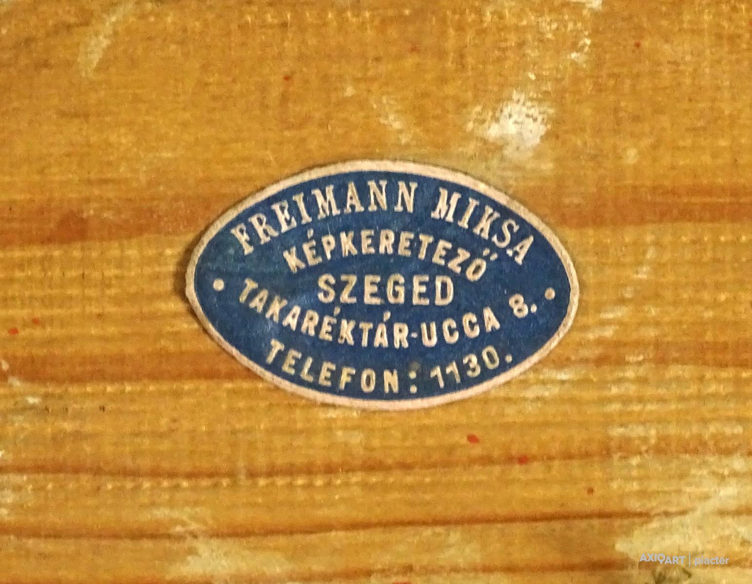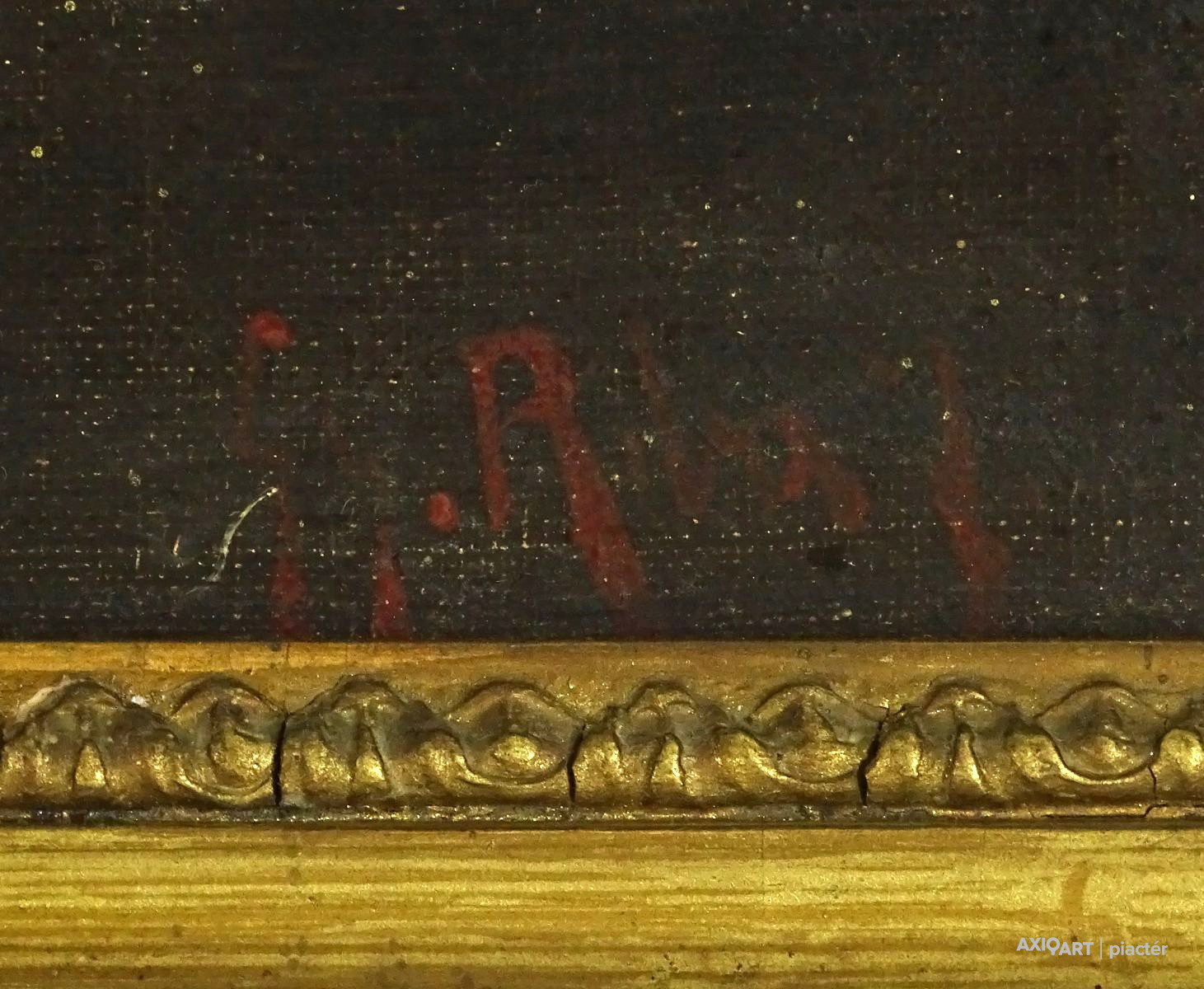 [1H372/008] Olaj vászon festmény, régi aranyozott Blondel keretben. Akasztási lehetőséggel rendelkezik. Jelzés jobbra lent: GY. RÁBA T. (?) Hátoldalán képkeretezői címke: FREIMANN MIKSA KÉPKERETEZŐ SZEGED TAKARÉKTÁR UCCA 8. Magasság: 66 cm Szélesség: 76 cm Súly: 4.19 kg