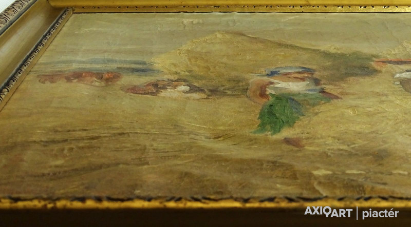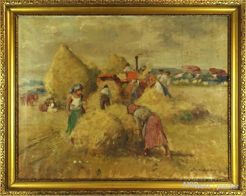 [FK2668/Bp301/4] A kép mérete: 50,5 x 80,5 cm keret nélkül. Készült: Olaj, Vászon A kép Moldován István (Kolozsvár, 1911) alkotása. Jelezve Jobbra lent "Moldován István" A festmény jó állapotban van. Keret: Ép A festmény hátoldalán a Képcsarnokvállalat raglapja láltható. Magyar festők és grafikusok életrajzi lexikona I-II. Festő. Tanulmányait Kolozsvárott, a Szépművészeti Főiskolán kezdte 1930-ban. A következő esztendőben a nagybányai Szépművészeti Iskolában Thorma János és Krizsán János korrektúráján képezte magát. 1931-ben a budapesti Képzőművészeti Főiskola hallgatója lett. Réti István, később Szőnyi István volt a mestere. Már mint főiskolás sok díjat és kitüntetést nyert. 1948-ban megkapta a római ösztöndíjat, de lemondva róla, Erdélybe ment. 1948-1950 között Erdélyben élt, és népművészetben gazdag vidékein festett. 1943-ban Kolozsvárott, 1946-ban Gyöngyösön, 1955-ben, 1959-ben és 1962-ben a Kulturális Kapcsolatok Intézetében, illetve a Csók Galériában rendezett egyéni bemutatókat. Ezen kívül több Európai országban, az USA-ban, Kanadában és Indiában is bemutatta munkáit. Eleinte sajátos atmoszférájú, lírai tájképeket, eleven színvilágú képmásokat festett, később mondernebb, erőteljesebben szerkesztett művekkel jelentkezett. A Pécsi Tanárképző Főiskola számára mozaikot készített. Erdély szerelmese volt. A székely népművészet gazdag formavilágának hatása döntő jelentőségűvé vált sokoldalú művészetében. Műv. díjak: a Szinyei Társaság elismerő oklevele, a Főváros festészeti-díja, "Kolozsvár a képzőművészetben" II. díj, állami ösztöndíj, római ösztöndíj, a Képzőművészek Szövetsége Észak-Magyarországi festészeti díja, SZOT festészeti díj. Több murális művet (mozaik) alkotott. A Magyar Nemzeti Galéria több alkotását őrzi. (M. L.: Műv. 1967/6, RI-NM) Magyar festők és grafikusok életrajzi lexikona I-II. Műgyűjtők és kereskedők kézikönyve Festő. Tanulmányait a kolozsvári Szépművészeti Főiskolán kezdte 1930-ban. A nagybányai szabadiskolában is megfordult. Itt Thorma János és Krizsán János korrektúráján képezte magát. 1931-ben Budapesten a Képzőművészeti Főiskola hallgatója lett. Réti István, később Szőnyi István volt a mestere. Már mint főiskolás sok díjat nyert. 1948-ban megkapta a római ösztöndíjat, de lemondva róla, Erdélybe ment. 1948-1950 k. Erdélyben élt, és népművészetben gazdag vidékein festett. 1943-ban Kolozsváron, 1946-ban Gyöngyösön, 1955-ben, 1959-ben és 1962-ben a Kulturális Kapcsolatok Intézetében, illetve a Csók Galériában rendezett önálló kiállítást. Ezen kívül több Európai országban, az USA-ban, Kanadában és Indiában is bemutatta műveit. Eleinte sajátos atmoszférájú, lírai tájképeket, eleven színvilágú képmásokat festett, később mondernebb, erőteljesebben szerkesztett művekkel jelentkezett. A Pécsi Tanárképző Főiskola számára mozaikot készített. Erdély szerelmese volt. A székely népművészet gazdag formavilágának hatása döntő jelentőségűvé vált sokoldalú művészetében. 1942-ben megkapta a Szinyei Társaság elismerését, és a Főváros festészeti-díjat,1943-ban elnyerte a "Kolozsvár a képzőművészetben" c. díjat. 1947-ben állami ösztöndíjat,1948-ban a római ösztöndíjat, 1972-ben a Képzőművészek Szövetsége Észak-Magyarországi festészeti díját kapta meg. A MNG több művét őrzi. (M. L.: Műv.-1976/6) Magyar festők és grafikusok adattára Tanulmányait Kolozsvárott a Képzőművészeti Főiskolán, majd Nagybányán Thorma János és Krizsán János irányítása mellett kezdte, 1931-től Budapesten megszakításokkal a Képzőművészeti Főiskolán Réti István és Szőnyi István növendékeként fejezte be. 1949-ben és 1950-ben ösztöndíjjal dolgozott Erdélyben, majd hosszú tanulmányutakra indult Nyugat-Európába, az Egyesült Államokba, s a Szovjetunióba. Először Kolozsvárott lépett a nyilvánosság elé 1943-ban, majd 1946-ban Egerben és Gyöngyösön, 1947-ben Miskolcon, 1948-ban Hatvanban, 1955, 1961 és 1981-ben a Csók Galériában, 1959-ben a KKI-ben, 1960-ban Nagykanizsán, 1963-ban Kiskunfélegyházán, 1966-ban Debrecenben, 1969 és 1975-ben Békéscsabán, 1971-ben a Mednyánszky Teremben, 1973-ban Gyöngyösön és Debrecenben, 1977-ben Egerben, 1979-ben Veszprémben, 1983-ban Miskolcon, 1984-ben Csepelen, 1986-ban a Vigadó Galériában rendezett önálló kiállítást. Külföldi kiállításai: Moszkva, Varsó, India, Szófia, Párizs, Bukarest, Belgrád, New York, Montreál és Toronto. Eddig közel kétezer színes táblaképet festett, de szívesen foglalkozik mozaikkészítéssel is. 1964-ben a Pécsi Pedagógiai Főiskola, 1968-ban a Salgótarjáni Kórház, 1969-ben a názáreti templom és 1970-ben a Videoton Vállalat díszterme részére mozaikot készített. - Erdély szerelmese. A székely népművészet gazdag formavilágának hatása döntő jelentőségűvé vált festészetében. Olyan formanyelvet alakított ki magának, amely színvilágában és summázó formaalakításában sajátos erdélyi zamat érződik, ugyanakkor korszerűen modern is konstruktivista stílusa. Munkásságát 1942-ben a Szinyei Társaság elismerésével és a Fővárosi festészeti-díjjal, 1943-ben Római-ösztöndíjjal, 1947-ben Állam ösztöndíjjal (Románai), 1963-ben a SZOT festészeti-díjával, 1972-ben a Képzőművészek Szövetsége Észak-Magyarországi festészeti-díjával tüntették ki. - Irod.: Bíró Béla: Kolozsváry Moldován István. Erdélyi Helikon, 1943.; Felvinczi Takács Zoltán: Kolozsváry Moldován István. Kolozsvár, 1943.; Dutka Mária: Magyar Nemzet, 1961.; Maksay László: Moldován István. Művészet, 1965.; D. Fehér Zsuzsa. Moldován István, Bp. 1971.; Theisler G