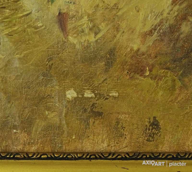 [FK0037/Z018] A kép mérete: 50 x 70 cm keret nélkül. Készült: Olaj, Vászon A kép Paizs László (Szentpéterúr, 1935) alkotása. Jelezve Jobbra lent "P. L." A festmény jó állapotban van. Keret: Ép A festmény hátoldalán a Képcsarnokvállalat címkéje található. Magyar festők és grafikusok életrajzi lexikona I-II. Festő. Tanulmányait a budapesti Iparművészeti Főiskolán végezte 1959-ben. Z. Gács György, Rákosy Zoltán és Szentiványi Lajos növendéke volt. A '60-as évek első felében hagyományosabb felfogású olajképeket festett, mozaikokat, freskókat, utóbb a pop-art körébe tartozó, a francia Arman munkáival rokon műveket alkotott. 1961 óta kiállító művész. Egyéni (Fényes Adolf Terem, Csók Galéria, Műcsarnok, Magyar Nemzeti Galéria, Halászbástya, Bástya Galéria, Vigadó Galéria, Budapest Galéria, Győr, Szombathely, Szeged, Zalaegerszeg, Duisburg, Aix-en-Provence, stb). és vegyes (Ernst Múzeum, Műcsarnok, Óbuda Galéria, Magyar Nemzeti Galéria, Csók Galéria, Vigadó Galéria, Székesfehérvár, Kaposvár, Pécs, Hódmezővásárhely, Firenze, Milano, Padova, Nápoly, Velence, Düsseldorf, Aachen, Genf, stb) tárlatokon vett részt. 1980-ban Munkácsy-díjjal jutalmazták, 1988-ban Érdemes Művész kitüntető elismerésben részesült. Munkáit őrzi a Magyar Nemzeti Galéria, a Fővárosi Képtár, a szombathelyi képtár, a pécsi Janus P. Múzeum, a székesfehérvári István Király Múzeum és a dunaszerdahelyi Kortárs Magyar Galéria. (H.B.: Műv, 1972/4, K.Gy.: Műv. 1977/2, K.G.: Műv. 1978/10, M.L.: Műv, 1983/5, R.G.: Műv, 1987/9, Sz.Gy.: Új Műv. 1995/4, MK) Magyar festők és grafikusok életrajzi lexikona I-II. Műgyűjtők és kereskedők kézikönyve Festő. Tanulmányait a bp.-i Iparművészeti Főiskolán végezte. Mozaikokat ferskókat, utóbb a pop-art körébe tartozó, a francia Arman műveivel rokon műveket alkotott. Mozaikok: a Szegedi Megyei Tanács, a Pécsi Óvoda, a Gödöllői Agrártudományi Egyetem. Freskók: Budapest - Csatárka úti Gyermekotthon. 1971-ben a Fényes Adolf Teremben volt kiállítása, 1983-ban pedig a szegedi Móra Ferenc Múzeumban nagyszabású tárlatokon mutatta be munkáit. 1988-ban érdemes művész kitüntető elismerésben részesült. (MK) Magyar festők és grafikusok adattára Az Iparművészeti Főiskolán végzett 1959-ben. Mozaikokat (Szeged, Megyei Tanács; Pécs, Óvoda; Gödöllő, Agrártudományi Egyetem), freskókat (Budapest, Csatárka úti Gyermekotthon), újabban a pop art körébe tartozó, a francia Arman műveivel rokon műveket alkotott. 1971-ben a Fényes Adolf Teremben nyílt kiállítása. 1983 februárjában a szegedi Móra Ferenc Múzeumban megrendezett nagyszabású tárlaton mutatta be alkotásait. 1988-ban érdemes művész kitüntető elismerésben részesült. - MK Művészeti lexikon I-IV. (Szentpéterur, 1935. dec. 26.- ): festő. Az Iparművészeti Főiskolán 1959-ben végzett Rákosy Zoltán, Z. Gách György és Szentiványi Lajos növendékeként. Épületdiszítő mozaikokat, (Szeged, Megyei Tanács, 1961; Pécs, Óvoda, 1964), műanyagfreskókat (Bp., Csatárka úti Gyermekotthon, 1964) és gobelinterveket készít. Kortárs magyar művészeti lexikon I-III. Festő, szobrász, grafikus. 1959: MIF, mesterei: Z. Gács György, Rákosy Zoltán, Szentiványi Lajos. 1980: Munkácsy-díj; 1988: érdemes művész. Főiskolás éveinek második felében, majd azt követően számos murális munka kivitelezésében vett részt, Fónyi Géza, Konecsni György, Z. Gács György, Rákosi Zoltán és Domanovszky Endre mellett dolgozva. A 60-as évek első felének hagyományosabb fölfogású olajképeket festett. 1964-ben a Velencei B.-n megismerkedett az amerikai pavilonban a pop art Európában akkor még újnak számító törekvésével, és részben ez inspirálta, hogy 1967-ben textil, fém, bőr anyagú "varrottas" képeket küldjön az FKS éves tárlatára; a megnyitó előtt többek között az ő munkáit is eltávolították a falról. A 70-es években pop art-os objekteket (A trónörököspár politikai gyilkosság áldozata lett, 1970, plexiüveg, újság, szarvasbogarak), majd konstruktív, átlátszó plexiüveg plasztikákat készített belső fénytörő határfelületekkel. A 80-as években készültek az anyagában színezett, konstruktív, nagyméretű poliészter szobrai, majd színes poliészter táblaképeket alkotott, mesterségesen roncsolt felületekkel, mintha régészeti leletek vagy atomtámadás utáni festmény-szurrogátumok lennének. Ekkor kezdett organikus plaszikájú bronzszobrokat is mintázni. A 90-es években, a táblaképek és szobrok mellett nagyméretű, egyedi grafikákat készített, formavilágában némileg a roncsolt táblaképekből kiindulva, de szinte kizárólag az emberi alakból elvonatkoztatott torzókat megjelenítve. Ek: 1966: Művészklub, Győr; 1971: Fényes A. T.; 1972: Bercsényi 28-30 G.; 1973: BME B-épület; 1976: Csók G.; 1977: G. Hildebrandt, Duisburg (NSZK); 1979: Bástya G., Halászbástya; Helyőrségi Műv. H., Nagyatád; József A. Műv. Közp., Szeged; Göcsej M., Zalaegerszeg; 1982: Bezzegh G., Küsnacht (CH); 1983: Móra F. M., Szeged; 1987: Műcsarnok (kat.); MNG; 1988: Pandora G., Badacsonytomaj; 1989: Parktheatter, Iserlohn (NSZK); Qualitas G.; Hevesi S. Színház, Zalaegerszeg; 1990: Vasarely Fondation (Ferdinánd Judittal, Fóth Ernővel), Aix-en-Provence (FR); 1994: Vigadó G.; 1997: Pest Center G.; 1998: Budapest G. (kat.); 1999: Pest Center G. (kat); G. Arcis, Sárvár; MMA, Bp.; 2001: SZK, Szhely; Ernst M. (kat.) Vcsk: 1961, 1964, 1966: FKS, Ernst M.; 1962: 9. Magyar Képzőműv. kiállítás, Műcsarnok; 1967: Mai magyar festészet, Új-Delhi; 1969: Vas megyei művészek, Savaria M., Szhely; V. Orsz. Grafikai B., Miskolc; 1971: Új művek, Műcsarnok; 1972: Fiatal művészek Budapestről. Likovni Salon, Újvidék (YU); 1972, 1973: Balatonboglár