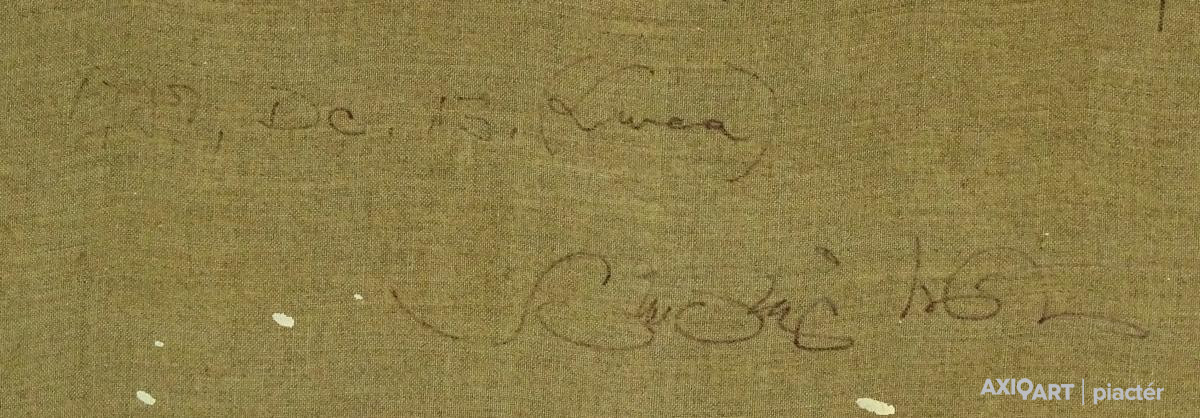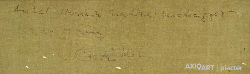 Hátoldalán művész által kézzel írt, szignált ajándékozási feljegyzés: