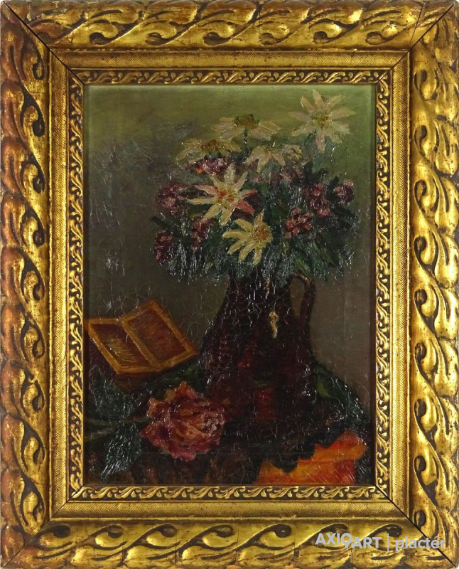 [1H055/083] Olaj vászon festmény régi aranyozott keretben. Falra akasztási lehetőséggel rendelkezik. Asztali virágcsendélet kancsóval és könyvvel. Magasság: 53.5 cm Szélesség: 43.5 cm Súly: 2.05 kg