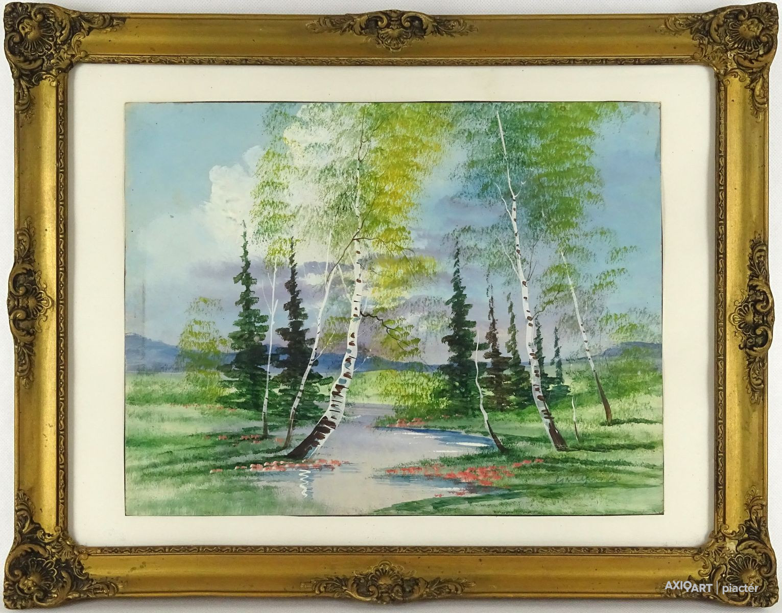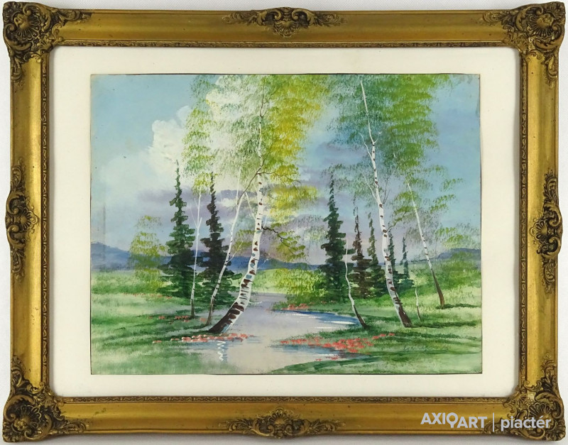 Papír akvarell festmény üveglap mögött, régi aranyozott Blondel keretben.