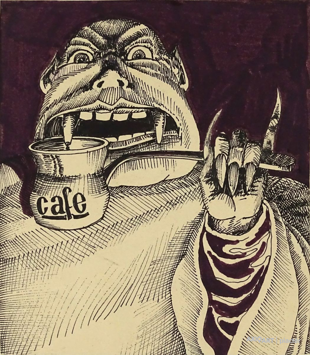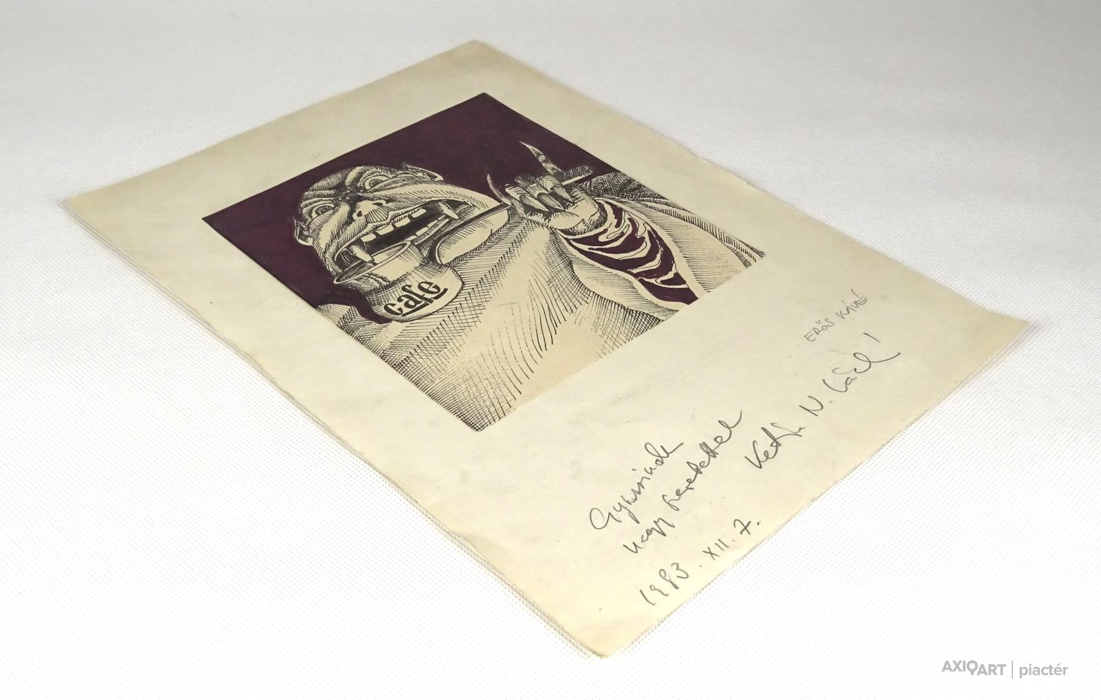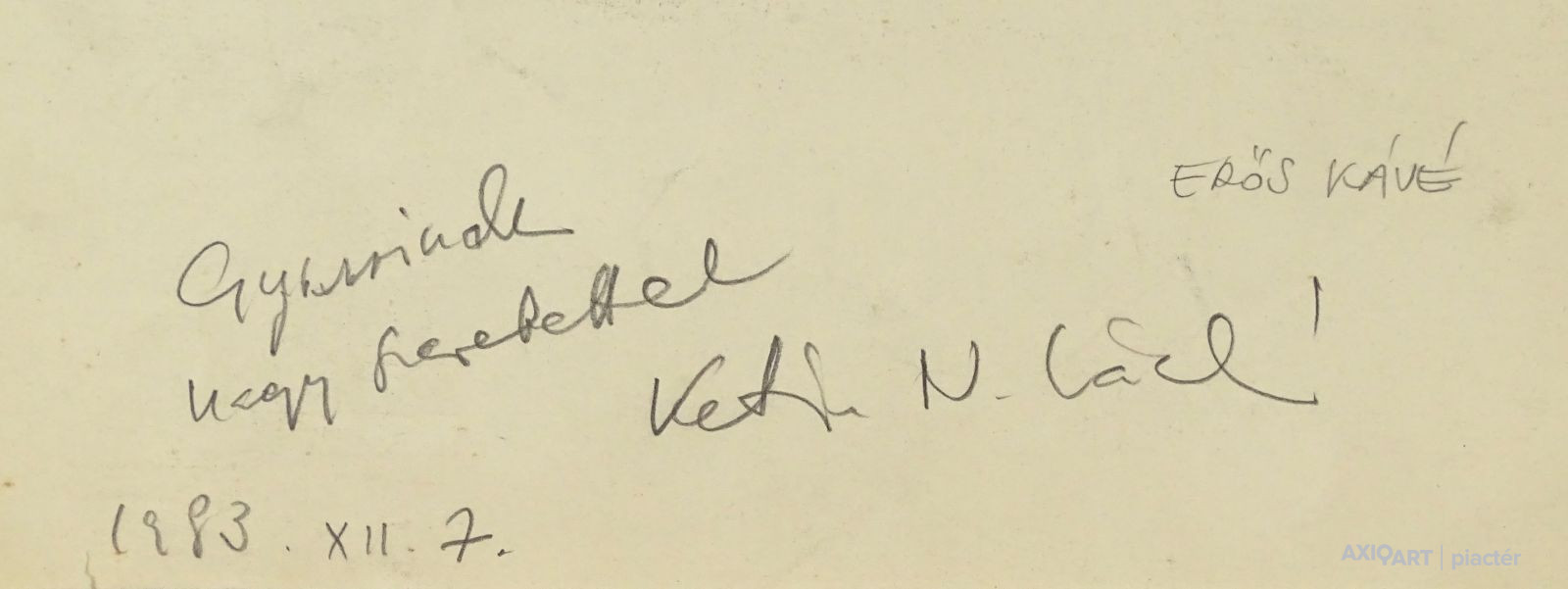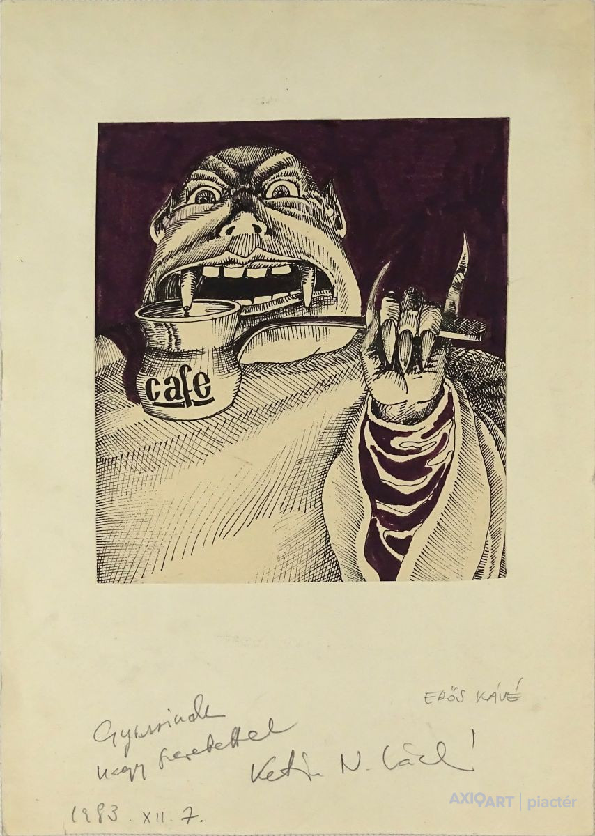 [1E006/047] Színezett papír tusrajz, keret nélkül. Kép címe jobbra lent: ERŐS KÁVÉ Rajta datált ajándékozási feljegyzés ceruzával, lásd fotó. Magasság: 30.5 cm Szélesség: 21.5 cm Súly: 0.02 kg