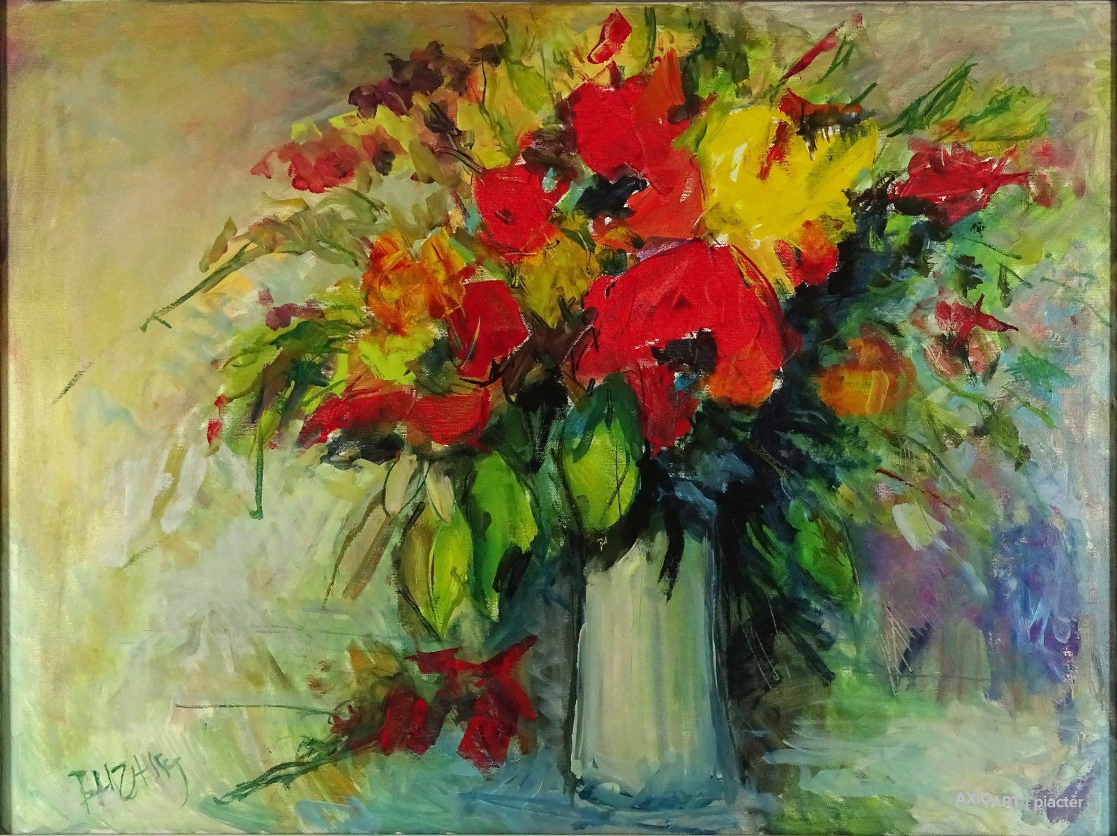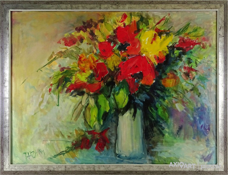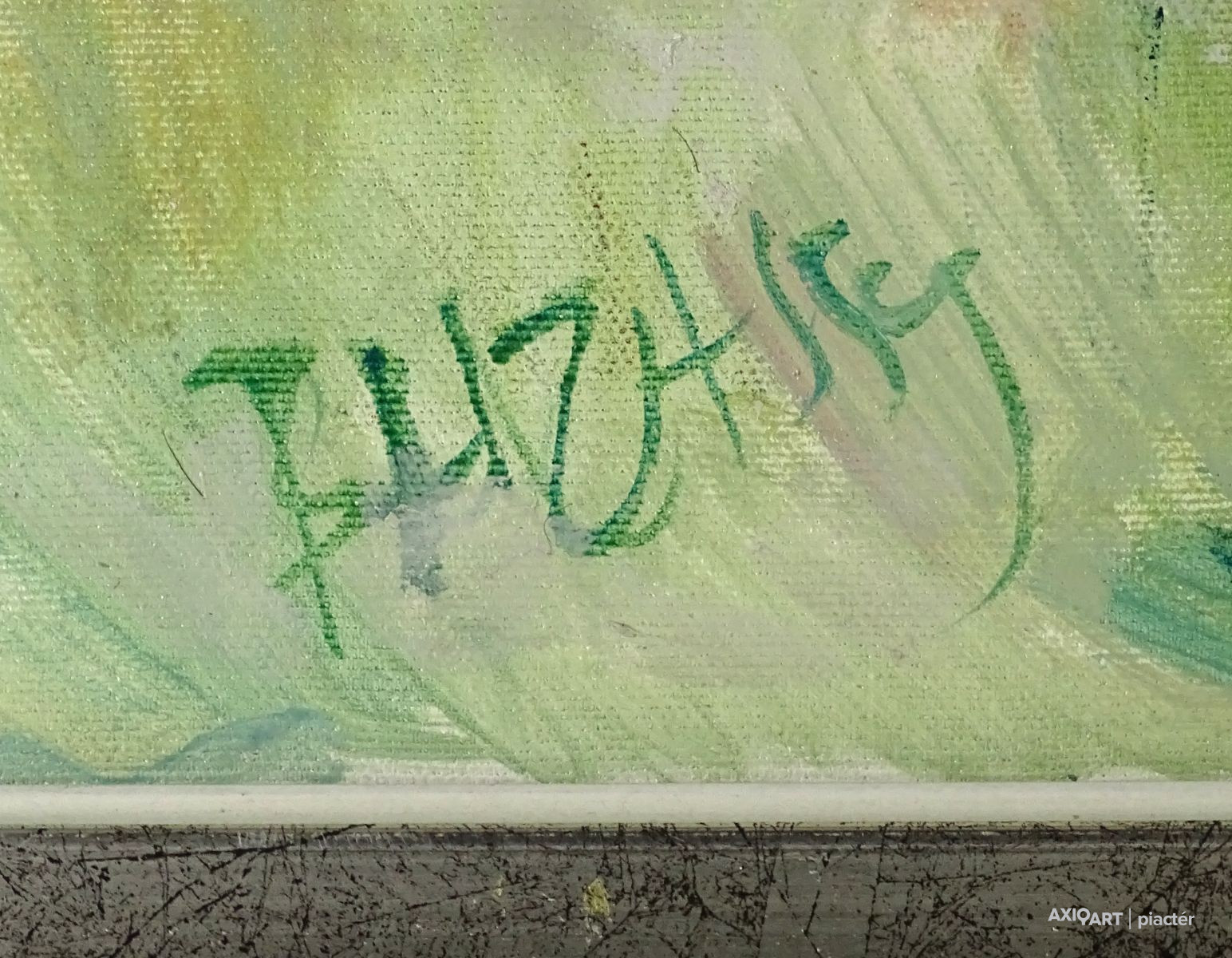 [FK0037/Z018] A kép mérete: 50 x 70 cm keret nélkül. Készült: Olaj, Vászon A kép Paizs László (Szentpéterúr, 1935) alkotása. Jelezve Jobbra lent "P. L." A festmény jó állapotban van. Keret: Ép A festmény hátoldalán a Képcsarnokvállalat címkéje található. Magyar festők és grafikusok életrajzi lexikona I-II. Festő. Tanulmányait a budapesti Iparművészeti Főiskolán végezte 1959-ben. Z. Gács György, Rákosy Zoltán és Szentiványi Lajos növendéke volt. A '60-as évek első felében hagyományosabb felfogású olajképeket festett, mozaikokat, freskókat, utóbb a pop-art körébe tartozó, a francia Arman munkáival rokon műveket alkotott. 1961 óta kiállító művész. Egyéni (Fényes Adolf Terem, Csók Galéria, Műcsarnok, Magyar Nemzeti Galéria, Halászbástya, Bástya Galéria, Vigadó Galéria, Budapest Galéria, Győr, Szombathely, Szeged, Zalaegerszeg, Duisburg, Aix-en-Provence, stb). és vegyes (Ernst Múzeum, Műcsarnok, Óbuda Galéria, Magyar Nemzeti Galéria, Csók Galéria, Vigadó Galéria, Székesfehérvár, Kaposvár, Pécs, Hódmezővásárhely, Firenze, Milano, Padova, Nápoly, Velence, Düsseldorf, Aachen, Genf, stb) tárlatokon vett részt. 1980-ban Munkácsy-díjjal jutalmazták, 1988-ban Érdemes Művész kitüntető elismerésben részesült. Munkáit őrzi a Magyar Nemzeti Galéria, a Fővárosi Képtár, a szombathelyi képtár, a pécsi Janus P. Múzeum, a székesfehérvári István Király Múzeum és a dunaszerdahelyi Kortárs Magyar Galéria. (H.B.: Műv, 1972/4, K.Gy.: Műv. 1977/2, K.G.: Műv. 1978/10, M.L.: Műv, 1983/5, R.G.: Műv, 1987/9, Sz.Gy.: Új Műv. 1995/4, MK) Magyar festők és grafikusok életrajzi lexikona I-II. Műgyűjtők és kereskedők kézikönyve Festő. Tanulmányait a bp.-i Iparművészeti Főiskolán végezte. Mozaikokat ferskókat, utóbb a pop-art körébe tartozó, a francia Arman műveivel rokon műveket alkotott. Mozaikok: a Szegedi Megyei Tanács, a Pécsi Óvoda, a Gödöllői Agrártudományi Egyetem. Freskók: Budapest - Csatárka úti Gyermekotthon. 1971-ben a Fényes Adolf Teremben volt kiállítása, 1983-ban pedig a szegedi Móra Ferenc Múzeumban nagyszabású tárlatokon mutatta be munkáit. 1988-ban érdemes művész kitüntető elismerésben részesült. (MK) Magyar festők és grafikusok adattára Az Iparművészeti Főiskolán végzett 1959-ben. Mozaikokat (Szeged, Megyei Tanács; Pécs, Óvoda; Gödöllő, Agrártudományi Egyetem), freskókat (Budapest, Csatárka úti Gyermekotthon), újabban a pop art körébe tartozó, a francia Arman műveivel rokon műveket alkotott. 1971-ben a Fényes Adolf Teremben nyílt kiállítása. 1983 februárjában a szegedi Móra Ferenc Múzeumban megrendezett nagyszabású tárlaton mutatta be alkotásait. 1988-ban érdemes művész kitüntető elismerésben részesült. - MK Művészeti lexikon I-IV. (Szentpéterur, 1935. dec. 26.- ): festő. Az Iparművészeti Főiskolán 1959-ben végzett Rákosy Zoltán, Z. Gách György és Szentiványi Lajos növendékeként. Épületdiszítő mozaikokat, (Szeged, Megyei Tanács, 1961; Pécs, Óvoda, 1964), műanyagfreskókat (Bp., Csatárka úti Gyermekotthon, 1964) és gobelinterveket készít. Kortárs magyar művészeti lexikon I-III. Festő, szobrász, grafikus. 1959: MIF, mesterei: Z. Gács György, Rákosy Zoltán, Szentiványi Lajos. 1980: Munkácsy-díj; 1988: érdemes művész. Főiskolás éveinek második felében, majd azt követően számos murális munka kivitelezésében vett részt, Fónyi Géza, Konecsni György, Z. Gács György, Rákosi Zoltán és Domanovszky Endre mellett dolgozva. A 60-as évek első felének hagyományosabb fölfogású olajképeket festett. 1964-ben a Velencei B.-n megismerkedett az amerikai pavilonban a pop art Európában akkor még újnak számító törekvésével, és részben ez inspirálta, hogy 1967-ben textil, fém, bőr anyagú "varrottas" képeket küldjön az FKS éves tárlatára; a megnyitó előtt többek között az ő munkáit is eltávolították a falról. A 70-es években pop art-os objekteket (A trónörököspár politikai gyilkosság áldozata lett, 1970, plexiüveg, újság, szarvasbogarak), majd konstruktív, átlátszó plexiüveg plasztikákat készített belső fénytörő határfelületekkel. A 80-as években készültek az anyagában színezett, konstruktív, nagyméretű poliészter szobrai, majd színes poliészter táblaképeket alkotott, mesterségesen roncsolt felületekkel, mintha régészeti leletek vagy atomtámadás utáni festmény-szurrogátumok lennének. Ekkor kezdett organikus plaszikájú bronzszobrokat is mintázni. A 90-es években, a táblaképek és szobrok mellett nagyméretű, egyedi grafikákat készített, formavilágában némileg a roncsolt táblaképekből kiindulva, de szinte kizárólag az emberi alakból elvonatkoztatott torzókat megjelenítve. Ek: 1966: Művészklub, Győr; 1971: Fényes A. T.; 1972: Bercsényi 28-30 G.; 1973: BME B-épület; 1976: Csók G.; 1977: G. Hildebrandt, Duisburg (NSZK); 1979: Bástya G., Halászbástya; Helyőrségi Műv. H., Nagyatád; József A. Műv. Közp., Szeged; Göcsej M., Zalaegerszeg; 1982: Bezzegh G., Küsnacht (CH); 1983: Móra F. M., Szeged; 1987: Műcsarnok (kat.); MNG; 1988: Pandora G., Badacsonytomaj; 1989: Parktheatter, Iserlohn (NSZK); Qualitas G.; Hevesi S. Színház, Zalaegerszeg; 1990: Vasarely Fondation (Ferdinánd Judittal, Fóth Ernővel), Aix-en-Provence (FR); 1994: Vigadó G.; 1997: Pest Center G.; 1998: Budapest G. (kat.); 1999: Pest Center G. (kat); G. Arcis, Sárvár; MMA, Bp.; 2001: SZK, Szhely; Ernst M. (kat.) Vcsk: 1961, 1964, 1966: FKS, Ernst M.; 1962: 9. Magyar Képzőműv. kiállítás, Műcsarnok; 1967: Mai magyar festészet, Új-Delhi; 1969: Vas megyei művészek, Savaria M., Szhely; V. Orsz. Grafikai B., Miskolc; 1971: Új művek, Műcsarnok; 1972: Fiatal művészek Budapestről. Likovni Salon, Újvidék (YU); 1972, 1973: Balatonboglár