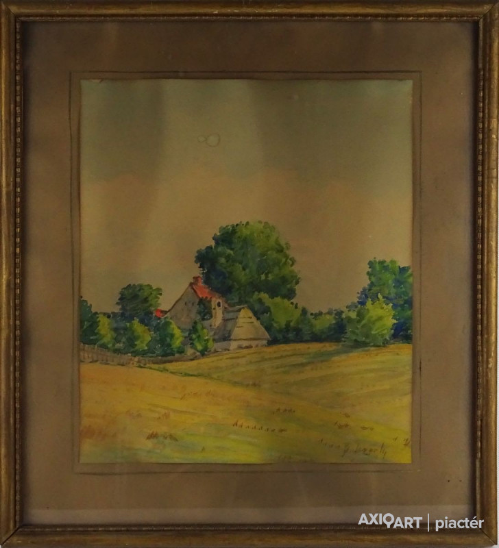 Papír akvarell üveglap mögött, régi, aranyozott keretben. Akasztási lehetőséggel rendelkezik.