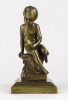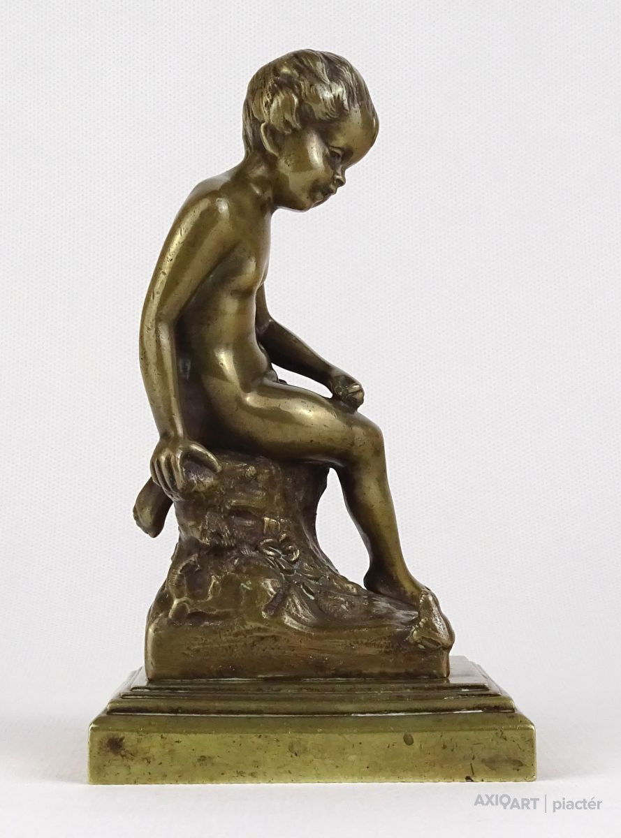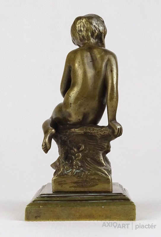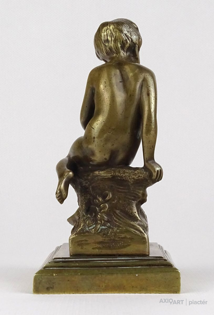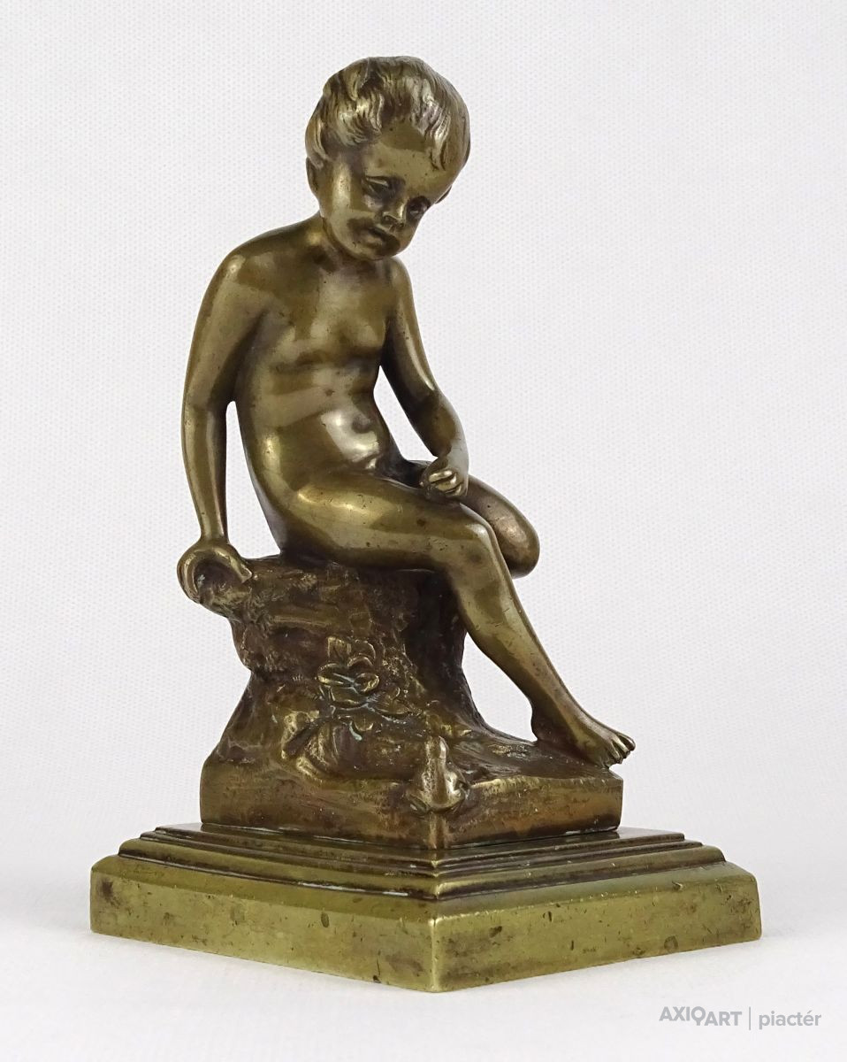 [1Q811/Z009] Régi, bronz talapzaton álló bronz szobor, kisplasztika. Fatuskón ülő meztelen fiú, lábánál békával. Magasság: 14.5 cm Szélesség: 7.3 cm Hosszúság: 8.5 cm Súly: 0.885 kg