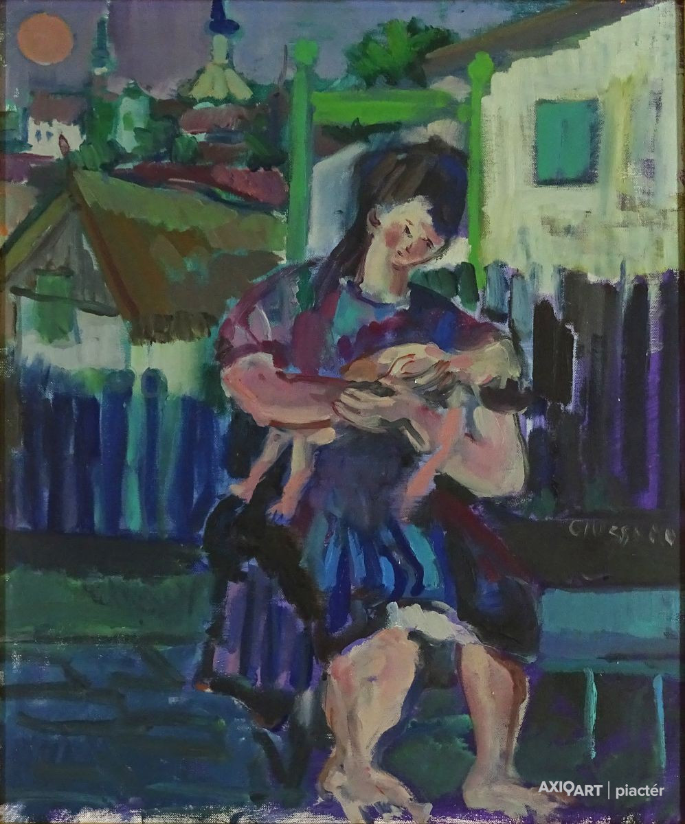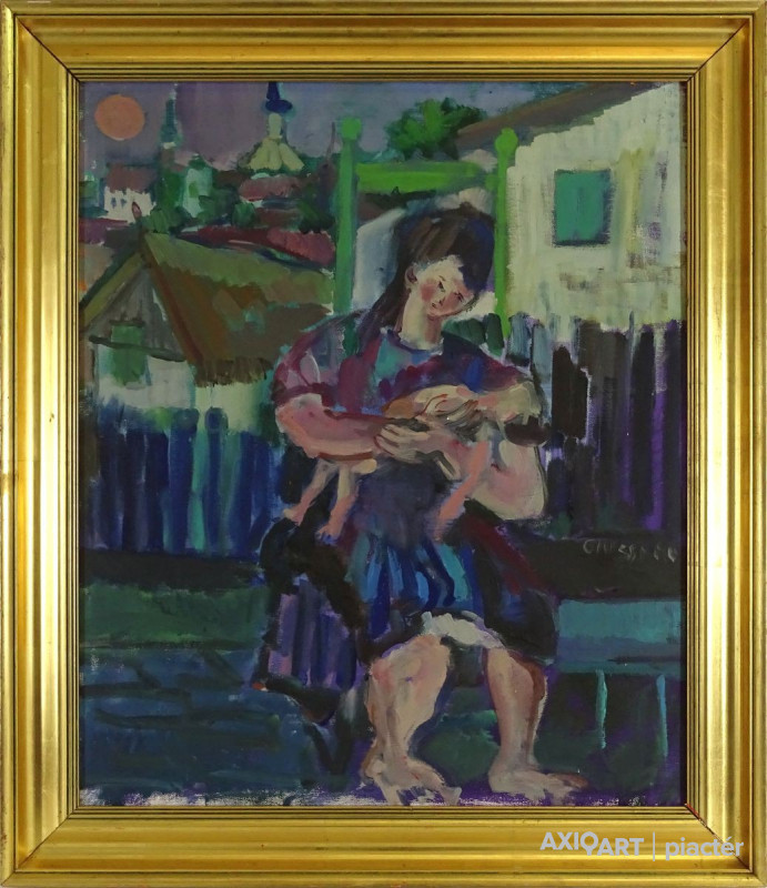 [FK2668/Bp301/4] A kép mérete: 50,5 x 80,5 cm keret nélkül. Készült: Olaj, Vászon A kép Moldován István (Kolozsvár, 1911) alkotása. Jelezve Jobbra lent "Moldován István" A festmény jó állapotban van. Keret: Ép A festmény hátoldalán a Képcsarnokvállalat raglapja láltható. Magyar festők és grafikusok életrajzi lexikona I-II. Festő. Tanulmányait Kolozsvárott, a Szépművészeti Főiskolán kezdte 1930-ban. A következő esztendőben a nagybányai Szépművészeti Iskolában Thorma János és Krizsán János korrektúráján képezte magát. 1931-ben a budapesti Képzőművészeti Főiskola hallgatója lett. Réti István, később Szőnyi István volt a mestere. Már mint főiskolás sok díjat és kitüntetést nyert. 1948-ban megkapta a római ösztöndíjat, de lemondva róla, Erdélybe ment. 1948-1950 között Erdélyben élt, és népművészetben gazdag vidékein festett. 1943-ban Kolozsvárott, 1946-ban Gyöngyösön, 1955-ben, 1959-ben és 1962-ben a Kulturális Kapcsolatok Intézetében, illetve a Csók Galériában rendezett egyéni bemutatókat. Ezen kívül több Európai országban, az USA-ban, Kanadában és Indiában is bemutatta munkáit. Eleinte sajátos atmoszférájú, lírai tájképeket, eleven színvilágú képmásokat festett, később mondernebb, erőteljesebben szerkesztett művekkel jelentkezett. A Pécsi Tanárképző Főiskola számára mozaikot készített. Erdély szerelmese volt. A székely népművészet gazdag formavilágának hatása döntő jelentőségűvé vált sokoldalú művészetében. Műv. díjak: a Szinyei Társaság elismerő oklevele, a Főváros festészeti-díja, "Kolozsvár a képzőművészetben" II. díj, állami ösztöndíj, római ösztöndíj, a Képzőművészek Szövetsége Észak-Magyarországi festészeti díja, SZOT festészeti díj. Több murális művet (mozaik) alkotott. A Magyar Nemzeti Galéria több alkotását őrzi. (M. L.: Műv. 1967/6, RI-NM) Magyar festők és grafikusok életrajzi lexikona I-II. Műgyűjtők és kereskedők kézikönyve Festő. Tanulmányait a kolozsvári Szépművészeti Főiskolán kezdte 1930-ban. A nagybányai szabadiskolában is megfordult. Itt Thorma János és Krizsán János korrektúráján képezte magát. 1931-ben Budapesten a Képzőművészeti Főiskola hallgatója lett. Réti István, később Szőnyi István volt a mestere. Már mint főiskolás sok díjat nyert. 1948-ban megkapta a római ösztöndíjat, de lemondva róla, Erdélybe ment. 1948-1950 k. Erdélyben élt, és népművészetben gazdag vidékein festett. 1943-ban Kolozsváron, 1946-ban Gyöngyösön, 1955-ben, 1959-ben és 1962-ben a Kulturális Kapcsolatok Intézetében, illetve a Csók Galériában rendezett önálló kiállítást. Ezen kívül több Európai országban, az USA-ban, Kanadában és Indiában is bemutatta műveit. Eleinte sajátos atmoszférájú, lírai tájképeket, eleven színvilágú képmásokat festett, később mondernebb, erőteljesebben szerkesztett művekkel jelentkezett. A Pécsi Tanárképző Főiskola számára mozaikot készített. Erdély szerelmese volt. A székely népművészet gazdag formavilágának hatása döntő jelentőségűvé vált sokoldalú művészetében. 1942-ben megkapta a Szinyei Társaság elismerését, és a Főváros festészeti-díjat,1943-ban elnyerte a "Kolozsvár a képzőművészetben" c. díjat. 1947-ben állami ösztöndíjat,1948-ban a római ösztöndíjat, 1972-ben a Képzőművészek Szövetsége Észak-Magyarországi festészeti díját kapta meg. A MNG több művét őrzi. (M. L.: Műv.-1976/6) Magyar festők és grafikusok adattára Tanulmányait Kolozsvárott a Képzőművészeti Főiskolán, majd Nagybányán Thorma János és Krizsán János irányítása mellett kezdte, 1931-től Budapesten megszakításokkal a Képzőművészeti Főiskolán Réti István és Szőnyi István növendékeként fejezte be. 1949-ben és 1950-ben ösztöndíjjal dolgozott Erdélyben, majd hosszú tanulmányutakra indult Nyugat-Európába, az Egyesült Államokba, s a Szovjetunióba. Először Kolozsvárott lépett a nyilvánosság elé 1943-ban, majd 1946-ban Egerben és Gyöngyösön, 1947-ben Miskolcon, 1948-ban Hatvanban, 1955, 1961 és 1981-ben a Csók Galériában, 1959-ben a KKI-ben, 1960-ban Nagykanizsán, 1963-ban Kiskunfélegyházán, 1966-ban Debrecenben, 1969 és 1975-ben Békéscsabán, 1971-ben a Mednyánszky Teremben, 1973-ban Gyöngyösön és Debrecenben, 1977-ben Egerben, 1979-ben Veszprémben, 1983-ban Miskolcon, 1984-ben Csepelen, 1986-ban a Vigadó Galériában rendezett önálló kiállítást. Külföldi kiállításai: Moszkva, Varsó, India, Szófia, Párizs, Bukarest, Belgrád, New York, Montreál és Toronto. Eddig közel kétezer színes táblaképet festett, de szívesen foglalkozik mozaikkészítéssel is. 1964-ben a Pécsi Pedagógiai Főiskola, 1968-ban a Salgótarjáni Kórház, 1969-ben a názáreti templom és 1970-ben a Videoton Vállalat díszterme részére mozaikot készített. - Erdély szerelmese. A székely népművészet gazdag formavilágának hatása döntő jelentőségűvé vált festészetében. Olyan formanyelvet alakított ki magának, amely színvilágában és summázó formaalakításában sajátos erdélyi zamat érződik, ugyanakkor korszerűen modern is konstruktivista stílusa. Munkásságát 1942-ben a Szinyei Társaság elismerésével és a Fővárosi festészeti-díjjal, 1943-ben Római-ösztöndíjjal, 1947-ben Állam ösztöndíjjal (Románai), 1963-ben a SZOT festészeti-díjával, 1972-ben a Képzőművészek Szövetsége Észak-Magyarországi festészeti-díjával tüntették ki. - Irod.: Bíró Béla: Kolozsváry Moldován István. Erdélyi Helikon, 1943.; Felvinczi Takács Zoltán: Kolozsváry Moldován István. Kolozsvár, 1943.; Dutka Mária: Magyar Nemzet, 1961.; Maksay László: Moldován István. Művészet, 1965.; D. Fehér Zsuzsa. Moldován István, Bp. 1971.; Theisler G