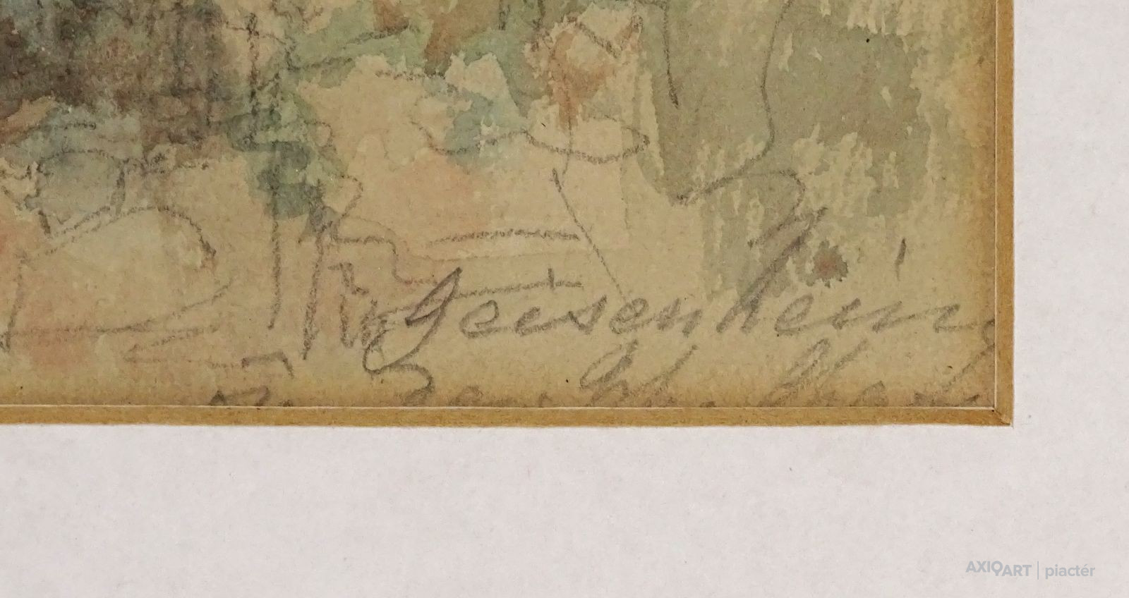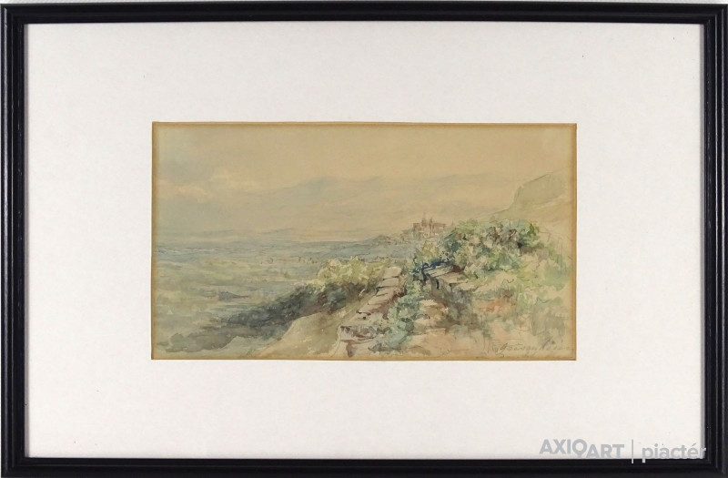 [1I827/023] Papír akvarell festmény üveglap mögött, paszpartuban, fekete színű keretben. Akasztási lehetőséggel rendelkezik. Jelzés jobbra lent, lásd fotó. Magasság: 27.5 cm Szélesség: 37.5 cm Súly: 0.625 kg
