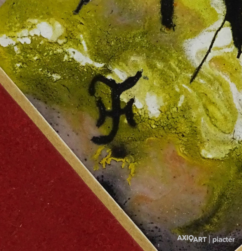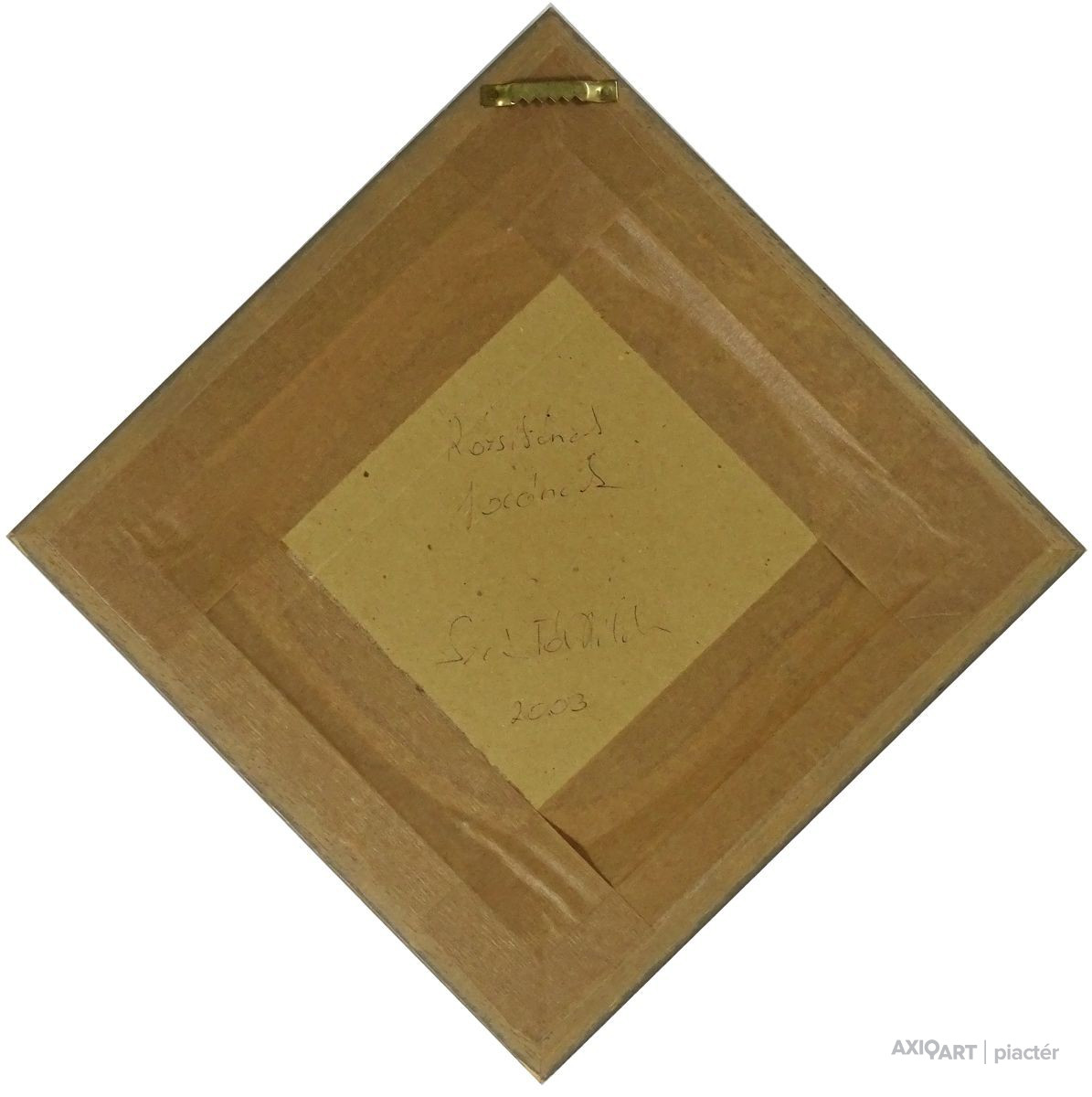 [1I821/023] Keretezett tűzzománc kép színes paszpartuban. Akasztási lehetőséggel rendelkezik. Jelezve lent, középen, lásd fotó. Hátoldalán datált ajándékozási feljegyzés, lásd fotó. Magasság: 33 cm Szélesség: 33 cm Súly: 0.24 kg