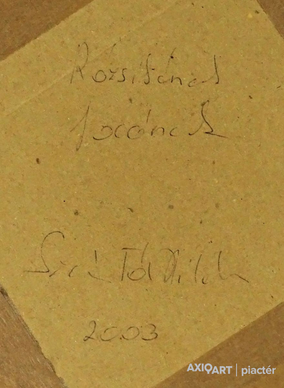 [1Y029/Z018] Olaj farost festmény, üveglap mögött, hibátlan képcsarnokos keretben. Hátoldalán Képcsarnok Vállalat papír címkéje: A művész neve: SCHÉNER MIHÁLY A kép címe: TÁJ Magasság: 66.5 cm Szélesség: 86 cm Súly: 6.54 kg Schéner Mihály festő, grafikus, szobrász, keramikus, bábtervező Medgyesegyháza, 1923-01-9 Elhalálozott: Budapest, 2009. május 11. Honlap: http://www.kormendigaleria.hu/kiadvany.html 1942-1947: Magyar Képzőművészeti Főiskola, tanára: Rudnay Gyula. 1978: Munkácsy-díj; 1984: érdemes művész; 1989: kiváló művész; 1995: Kossuth-díj. 1992-től a Magyar Művészeti Akadémia, 1993-tól a Széchenyi Irodalmi és Művészeti Akadémia tagja. 1956-ig tanított. 1982: Nagyatádi Faszobrász Alkotótelep, 1985: Nemzetközi Acélszobrász Alkotótelep, Dunaújváros. A stílusában felismerhető, mégis sokféle műtárgyat létrehozó ~ gazdag, állandóan alakuló életműve a folyton változó világban helyét kereső, az alkotói szabadságot megvalósító XX. századi képzőművész példázata lehetne. Magát expresszív-szürrealista alkotónak nevezi. Egyaránt dolgozik festékkel, textillel, fával, fémmel. Rajzol, szerkeszt, farag, épít, gyúr, varr és ragaszt, felhasználja a mézesbábok öntőformáit. Festő, rajzoló, textilszobor- és bábkészítő, fazekas, asztalos, esztergályos. Háromlépcsős folyamatban gondolkozik: rajzban tervez, majd fest, szobrot készít, “formába önt”, mindig a végső plasztikai megoldást keresi. Ami állandó és mégis játékosan változékony megjelenésű Schéner művészetében, az a gyermekkori emlékek által meghatározott népi mesterségek iránti tiszteletet kifejező motívumkincs, a tárgyi folklór formakészlete, amely már-már kézjegyként ismétlődik munkáin. Mitologikussá nőtt képzelete új lényeket teremt, pl: a Pigulát, amely disznótestű, emberfejű teremtmény. Schéner festményein a szürrealista motívumokat konstruktív szerkezetbe rendezi, a geometriát és az organikus természeti motívumokat egyaránt beépíti műveibe. A népi, népművészeti formakincsből merített lovas huszárok, betyárok, szegénylegények cifra szűr mentéje, piros csákója, fekete csizmája, az önálló életet élő zsinórdíszek és mézeskalács bábok, a kiskocsik a gyermekkori vásárok, búcsúk színes forgatagába vezet. A primér motívumokat aztán felváltják a vastagon felhordott felületbe karcolt jelek, vonalhálózatok, amelyek a játszó gyermek homokba rajzolt ábráit, a pásztorember fába vésett üzeneteit, az ősember barlang falába rótt mágikus jeleneteit idézik meg. A művész pillanatnyi érdeklődésének megfelelően a színek búvópatakként tűnnek el és jelennek meg ismét. A 60-as években leginkább a formákkal való játék érdekelte, a festmények felülete egyre gazdagodott: a táblaképek felületén applikációk jelentek meg, vagy lemállasztott rétegek hagyták maguk után hiányukat, motívumok nélküli ősformák, archetipikus képzetek bukkantak fel művészetében. A véletlenszerűnek látszó rétegekkel való játék azonban tudatos komponálás eredménye, amely később nyilvánvaló ritmusnak és formai szerkesztettségnek adja át a helyét, mint a Törvénytáblák c. sorozaton. A különböző művészi kifejezési formák egymásra termékenyítő hatással vannak, át- meg áthatják egymást. Textilszobrai, amelyekkel új műfajt teremtett, ugyanazzal az automatikus, expresszív-szürrealista módszerrel készülnek, mint festményei. A hagyományosan a népművészetben alkalmazott anyag, a filc lehetőséget ad a népi formakincs felelevenítésére, amely azonban a művész különös szürrealista átiratában jelenik meg. A szívekkel kivarrt, zsinórdíszes Posztókotlós c. művén mézesbábok lógnak, hátán huszárok lovagolnak. Egész sor textilből készült kéz-plasztikát alkot, amelyeket az ujjakra rávarrt díszekkel öltöztet, személyesít meg. A színes-különös világból aztán ~ újra puritán képi és formai rendbe juttatja el a nézőt, majd nemsokára tépett, gyűrt, vágott, csorgatott, repedezni hagyott szenvedélyesen vonagló képi felületeket hagy hátra. Schéner készített apró gyermekjátékokat, térstruktúra-tereket, mászókákat is. A magyar népi formák mellett szürreális játékaiban gyakran alkalmaz görög mitológiai alakokat, “elkentaurosodott” lovakat, Gorgó-fejeket, sellőket, hárpiákat, Pán-ábrázolásokat. Schéner nemcsak saját művészetéről publikál, hanem művésztársairól is számos írása jelenik meg, elsősorban az Új Auróra c. folyóiratban, amelynek egy ideig főmunkatársa volt. Irodalom kiállítása, Magyar Építőművészet, 1962/4. Húsz év után, Művészet, 1965/4. BOZÓKY M.: ~, Tiszatáj, 1968/5. PERNECZKY G.: Nincs uborkaszezon, Élet és Irodalom, 1969. augusztus 8. BARÁNSZKY-JÓB L.: ~, Művészet, 1969/9. LÁSZLÓ GY.: ~ kaposvári kiállítása, Jelenkor, 1969/4. MAJOR M.: Pásztorok, betyárok, huszárok - kezek, Tükör, 1970. szeptember 15. FRANK J.: Bemutatjuk ~t, Élet és Irodalom, 1972. május 6. ról kiállítása ürügyén, Képzőművészeti Almanach, Budapest, 1972 Sötétkék kokasok, Élet és Irodalom, 1973. szeptember 9. MAJOR M.: ~ játékai, Élet és Irodalom, 1974. július 27. BARTA J.: Egy különös művész, Alföld, 1974/6. VADAS J.: Szárnykészítők, Élet és Irodalom, 1975. október 4. JUHÁSZ F.: A halál ellen játszani, Élet és Irodalom, 1975. május 17. PAP G.: Kincsek és műkincsek, Művészet, 1975/6. P. SZŰCS J.: Az utak kettéválnak, Művészet, 1978/3. Békési művészet, Művészet, 1978/7. SZAMOSI F.: ~ [kismonográfia], Budapest, 1978 VADAS J.: Játék a játékkal, Élet és Irodalom, 1979. augusztus 18. NÉMETH L.: ~ műveiről, Művészet, 1979/4. MIKLÓS P.: Mit akar ez a múzeum?, Művésze